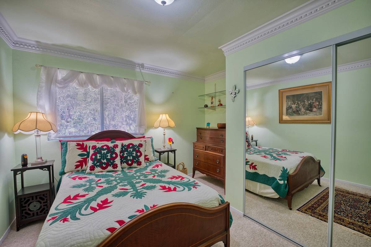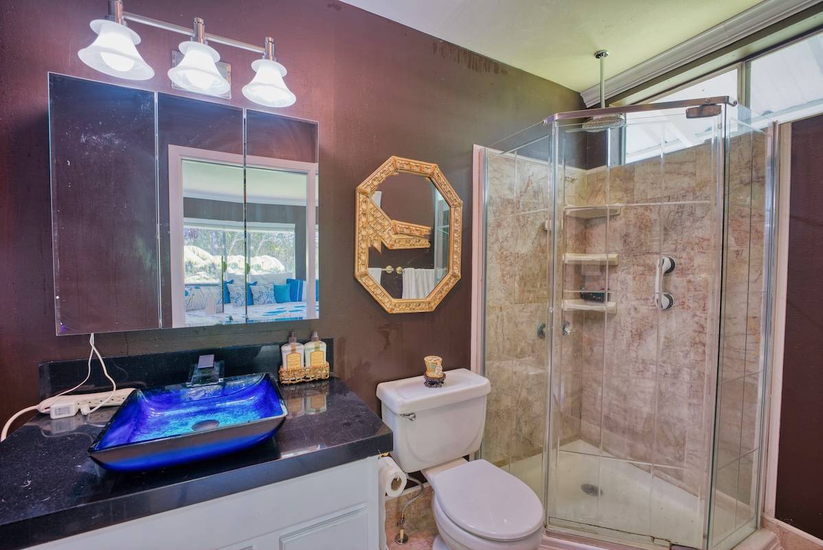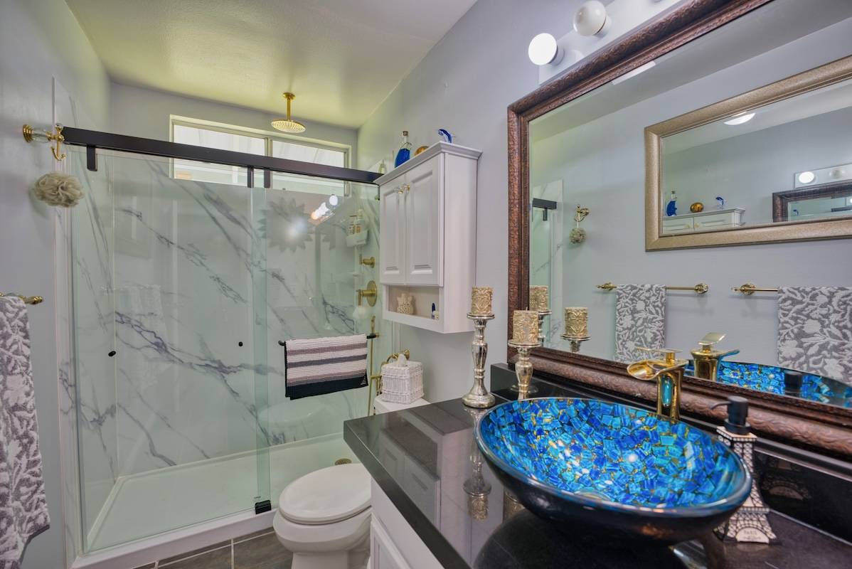 The kitchen, adorned with special-ordered cabinetry from Tennessee, showcase granite countertops and a double oven stove top. Modernity meets charm in both the recently renovated bathrooms. Master bath has marble floors & a built in vanity while the guest bath has double slider doors, & a vessel sink.