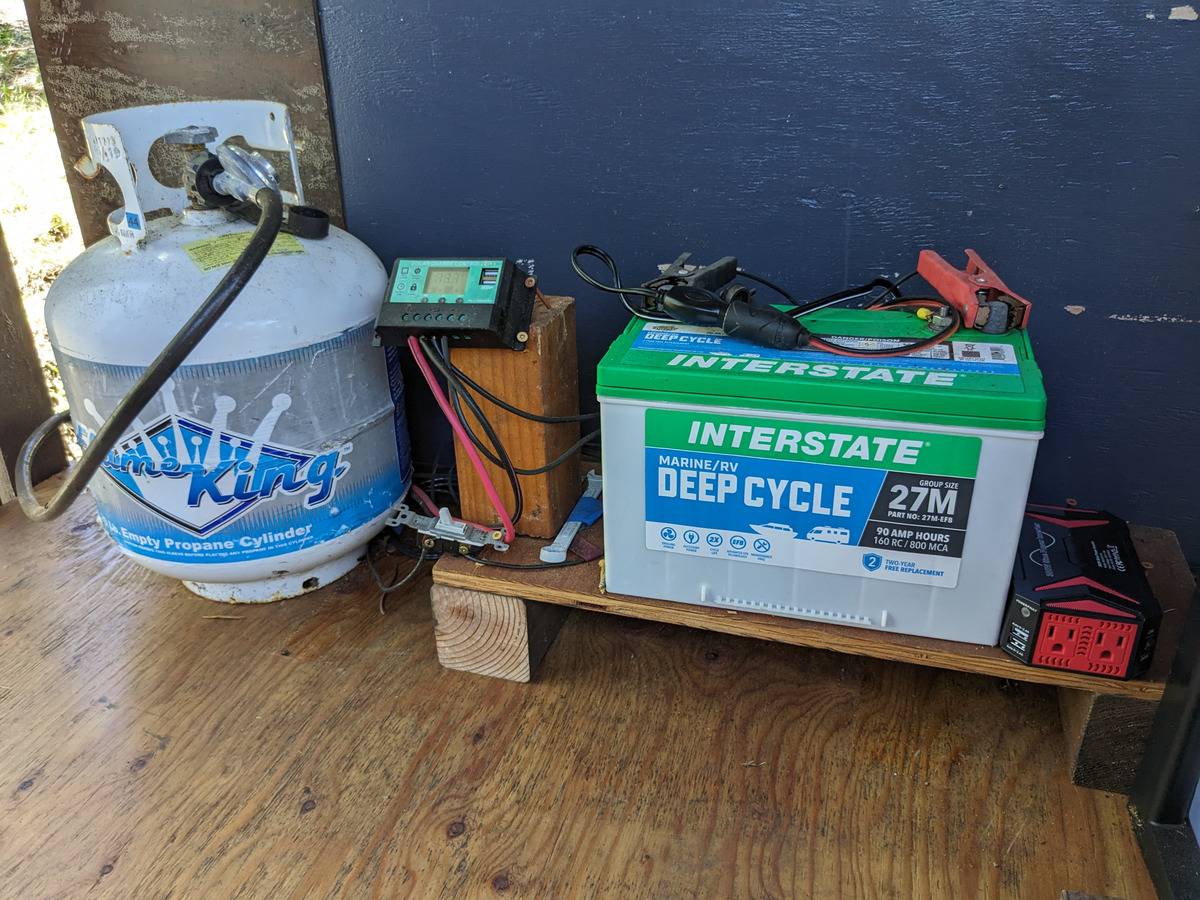 with mosquito netting, dishes and cookware for simple meal prep, tools for