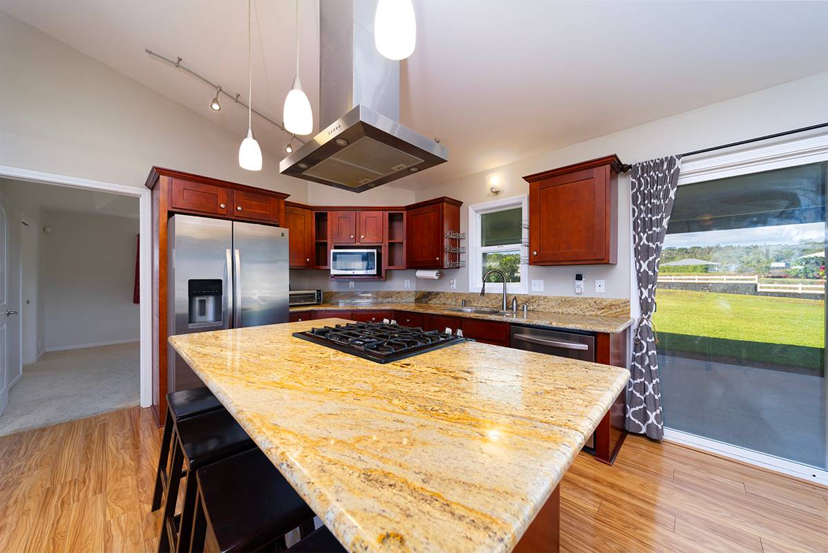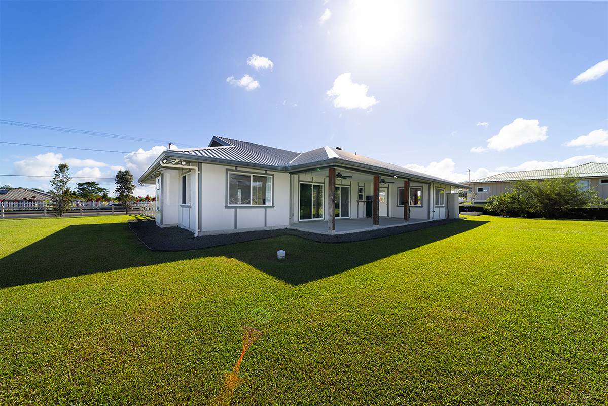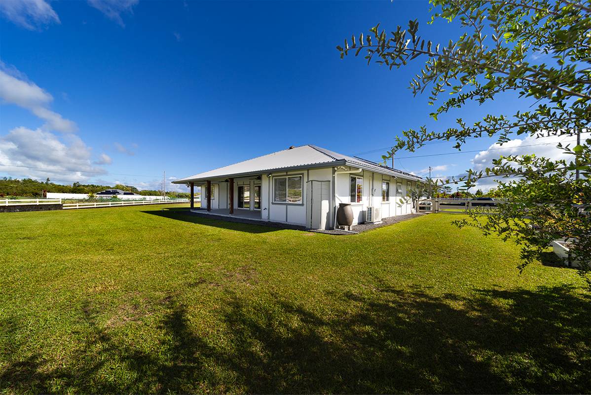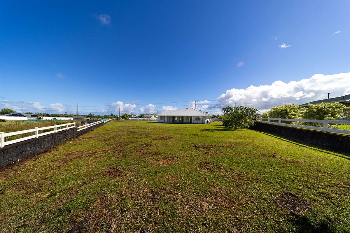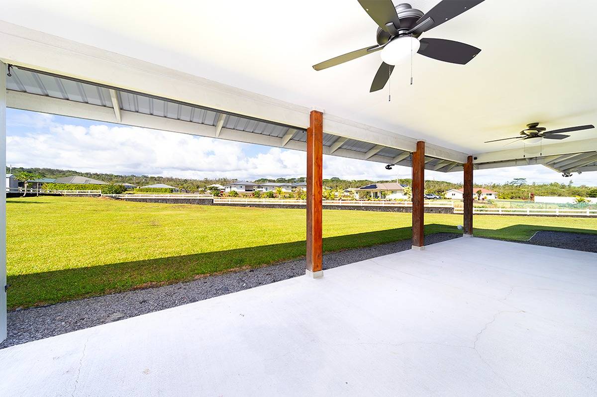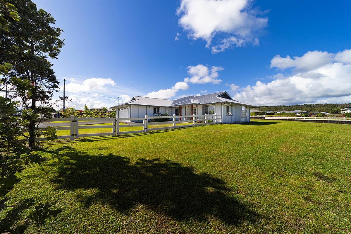 Tasteful, quality home on a fully fenced grassy one acre in one of Hilo's finest subdivisions located above the University, shopping, and many other conveniences. This home has many surprising features such as an expansive great room, spectacular kids bathroom, expansive master bedroom with huge walk-in closet and beautifully tiled master bath with lipless shower and ADA inspired. Slate entry with 8x8 stained poles and a cute and tasteful rock garden. Double door entry with leaded glass. Beautiful living room with laminate flooring, vaulted ceilings, large storage closet, 2 dual blade glass sliding doors that lead out to an expansive covered lanai with Mauna Kea views. Kitchen has a beautiful range hood over granite island featuring gas stainless steel looking range. All appliances, refrigerator, and dishwasher are stainless steel looking. Also includes large under mount sink with granite backsplash and cute pass through counter from kitchen to lanai.