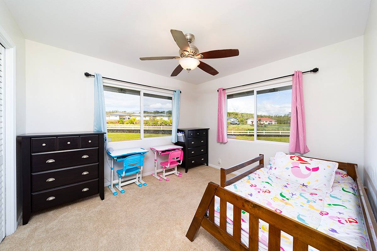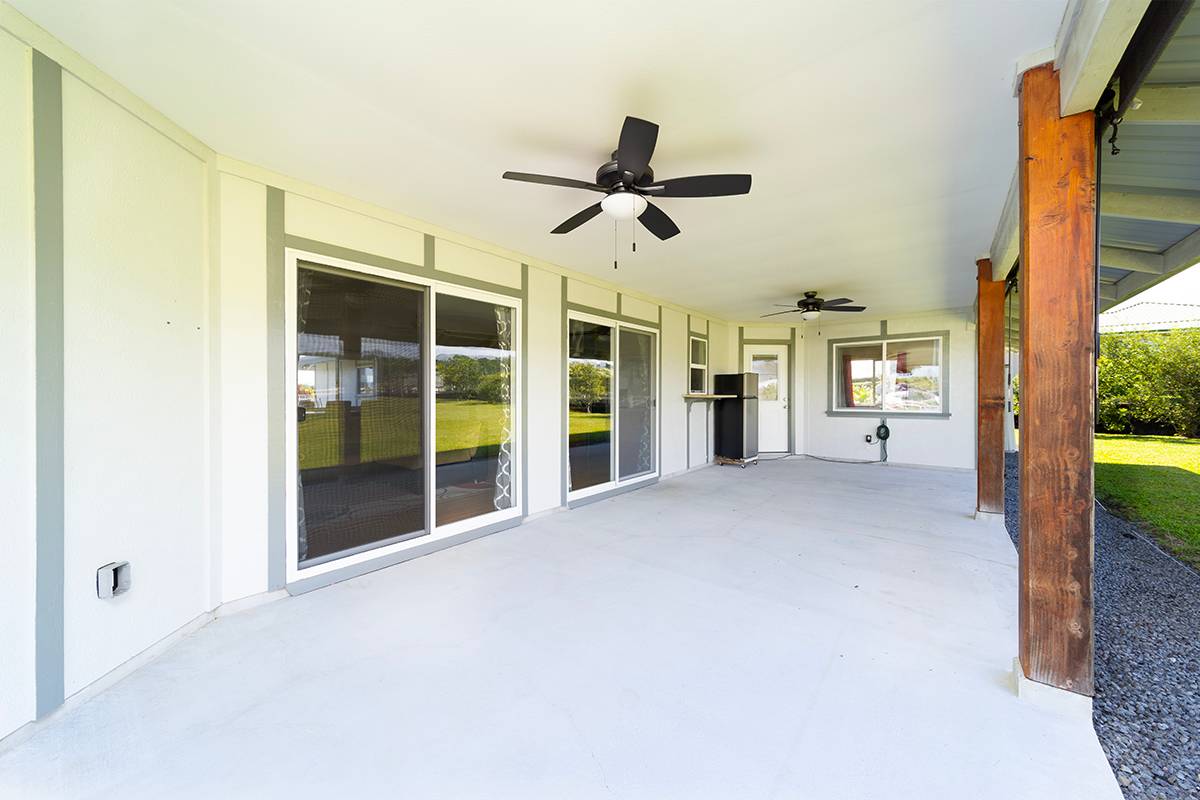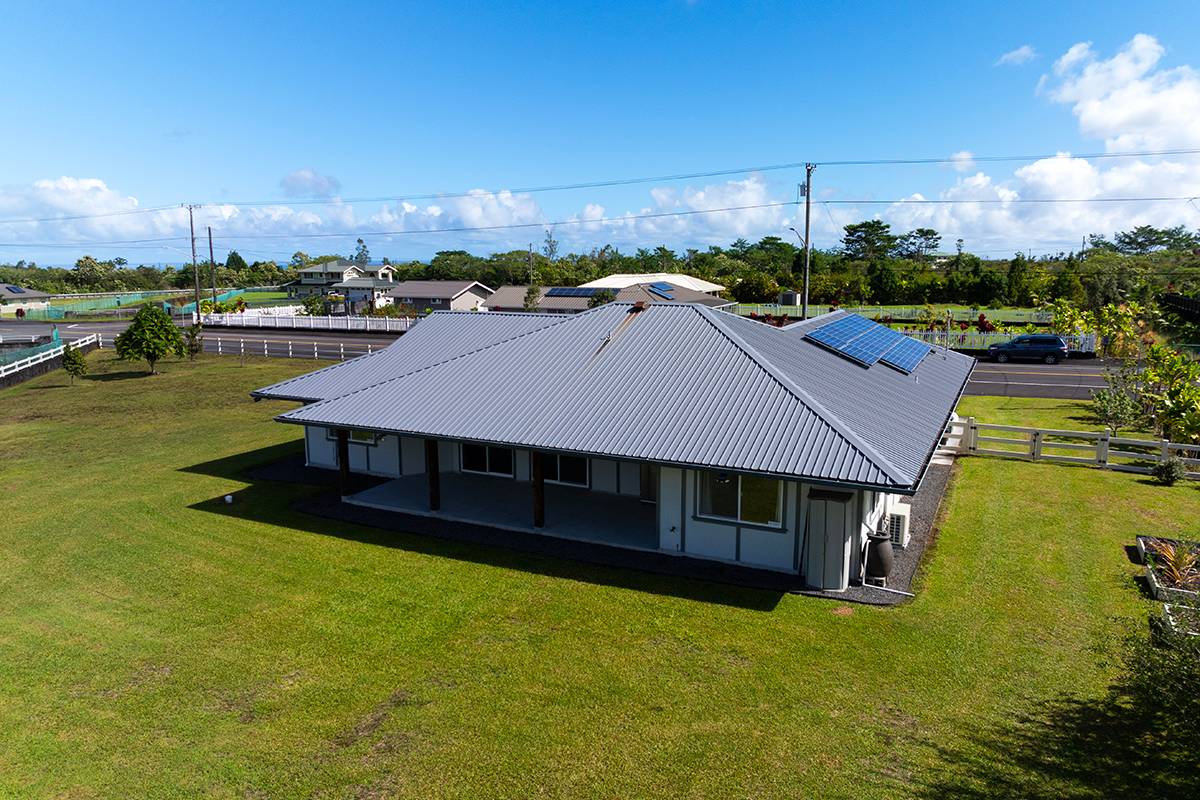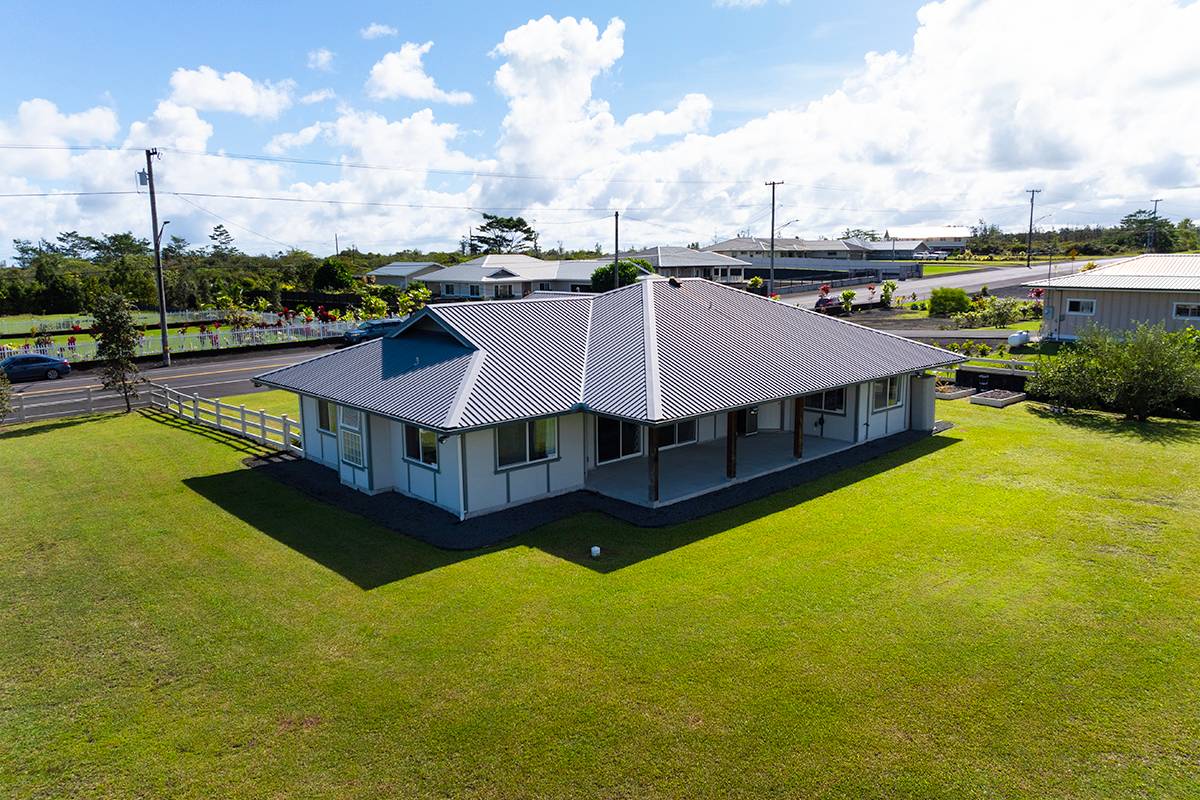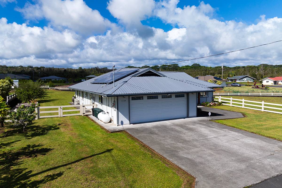 Tasteful, quality home on a fully fenced grassy one acre in one of Hilo's finest subdivisions located above the University, shopping, and many other conveniences. This home has many surprising features such as an expansive great room, spectacular kids bathroom, expansive master bedroom with huge walk-in closet and beautifully tiled master bath with lipless shower and ADA inspired. Slate entry with 8x8 stained poles and a cute and tasteful rock garden. Double door entry with leaded glass. Beautiful living room with laminate flooring, vaulted ceilings, large storage closet, 2 dual blade glass sliding doors that lead out to an expansive covered lanai with Mauna Kea views. Kitchen has a beautiful range hood over granite island featuring gas stainless steel looking range. All appliances, refrigerator, and dishwasher are stainless steel looking. Also includes large under mount sink with granite backsplash and cute pass through counter from kitchen to lanai.