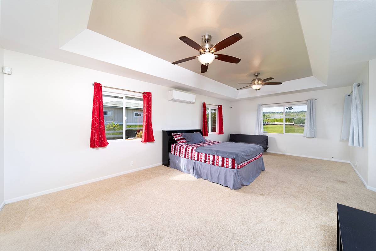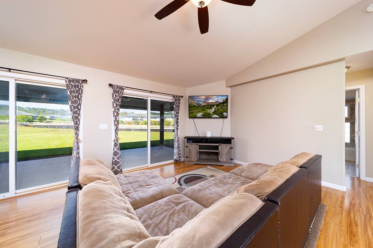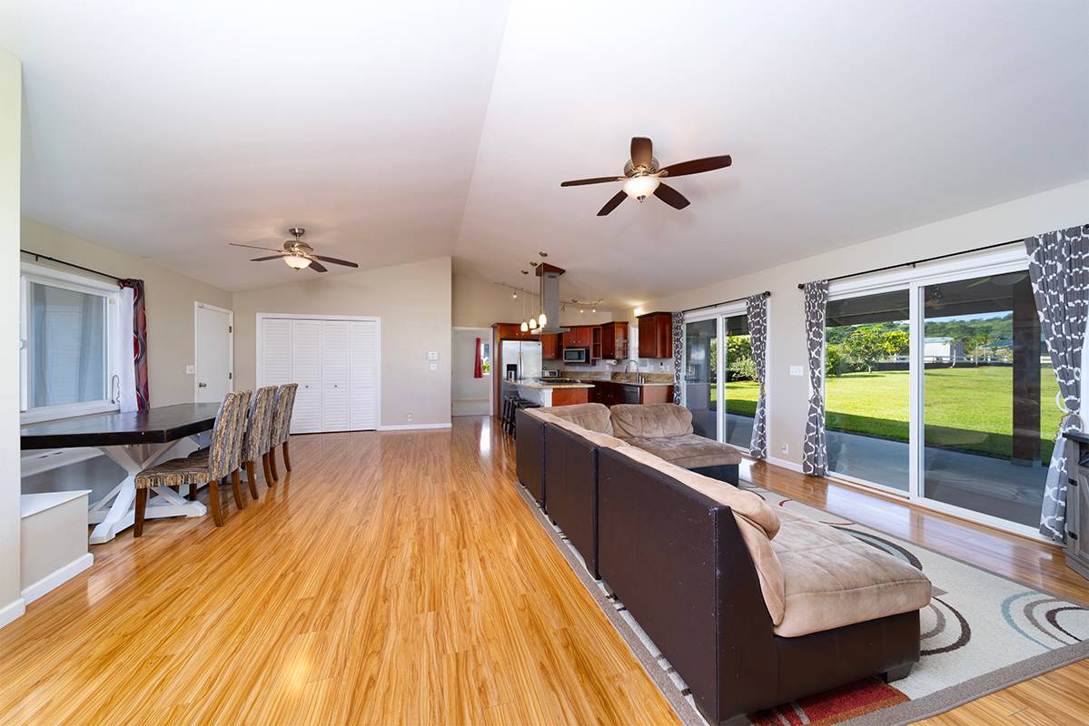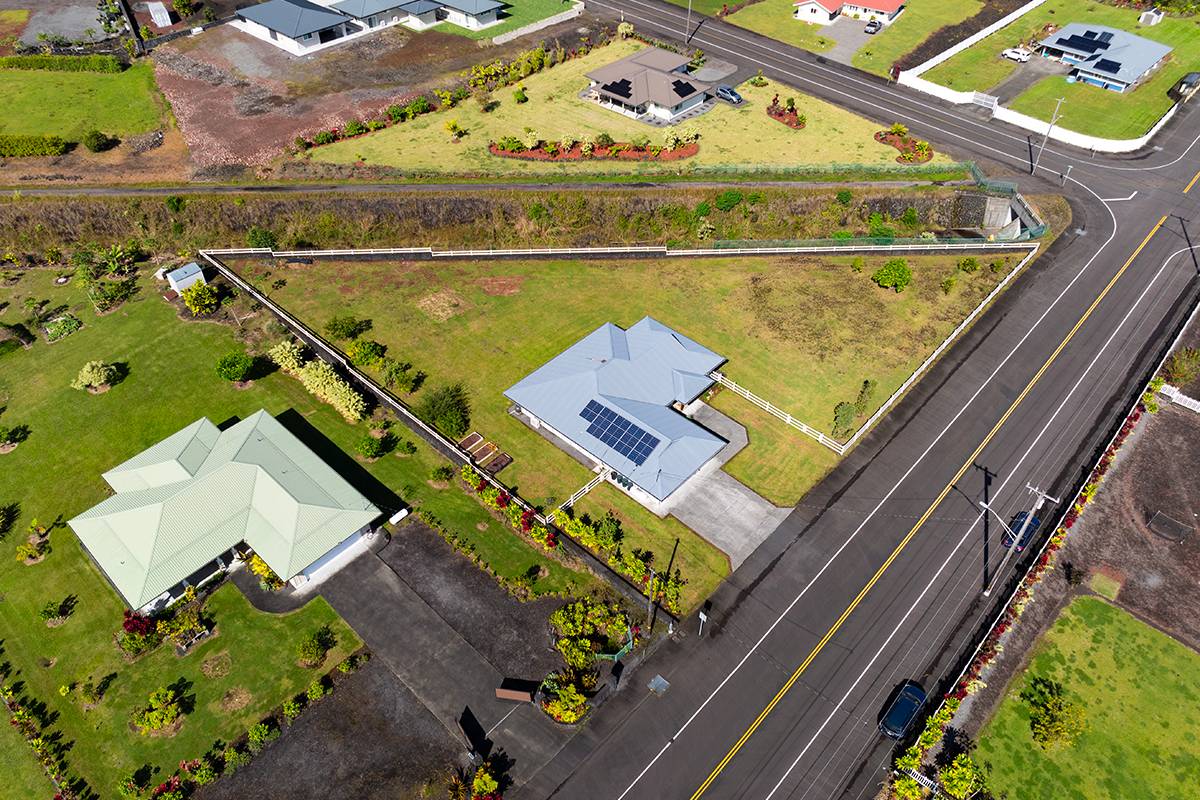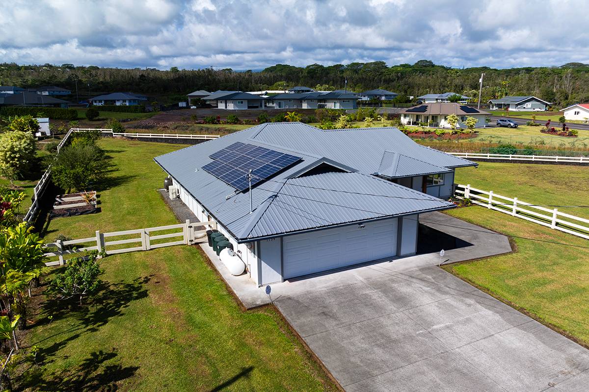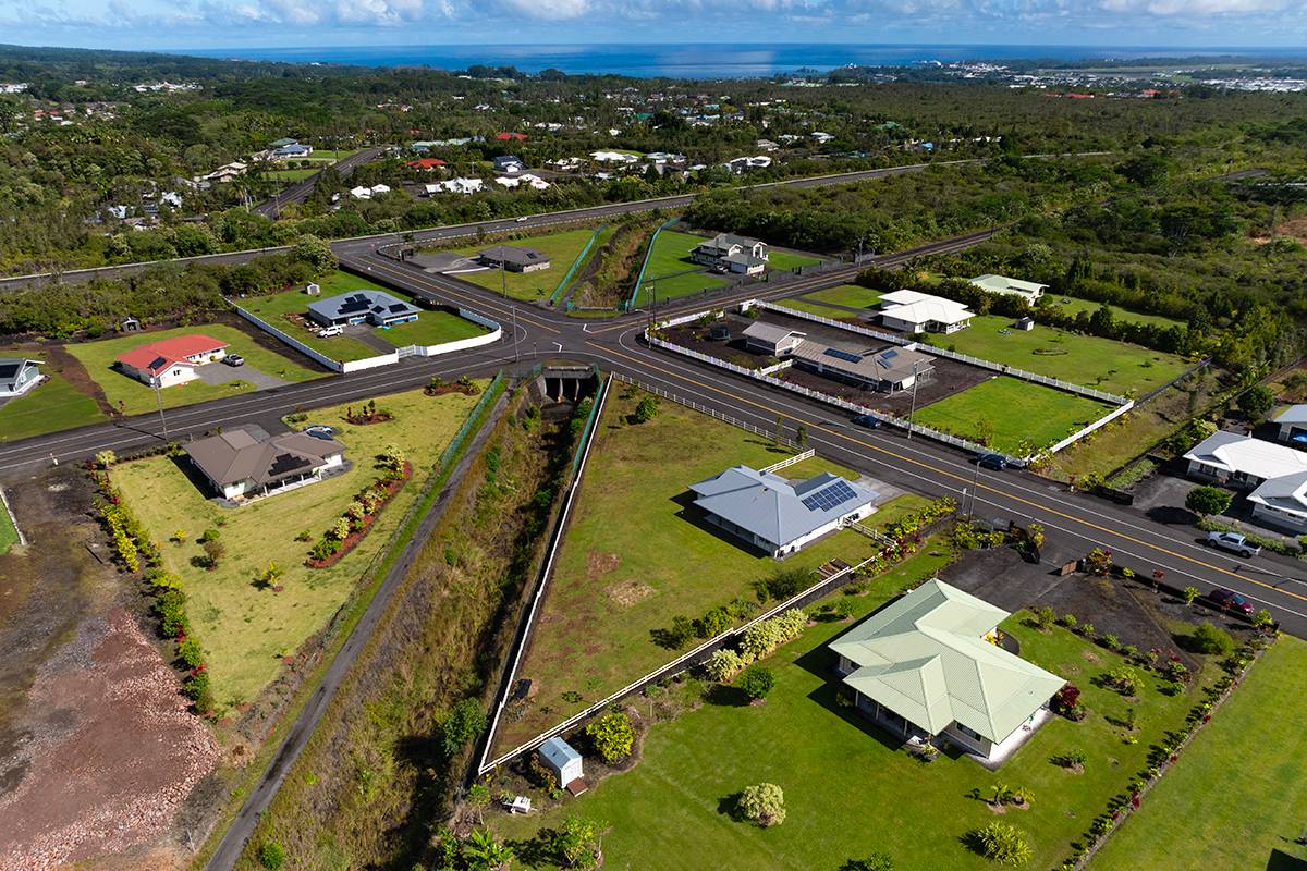 Tasteful, quality home on a fully fenced grassy one acre in one of Hilo's finest subdivisions located above the University, shopping, and many other conveniences. This home has many surprising features such as an expansive great room, spectacular kids bathroom, expansive master bedroom with huge walk-in closet and beautifully tiled master bath with lipless shower and ADA inspired. Slate entry with 8x8 stained poles and a cute and tasteful rock garden. Double door entry with leaded glass. Beautiful living room with laminate flooring, vaulted ceilings, large storage closet, 2 dual blade glass sliding doors that lead out to an expansive covered lanai with Mauna Kea views. Kitchen has a beautiful range hood over granite island featuring gas stainless steel looking range. All appliances, refrigerator, and dishwasher are stainless steel looking. Also includes large under mount sink with granite backsplash and cute pass through counter from kitchen to lanai.