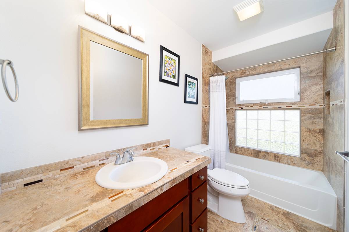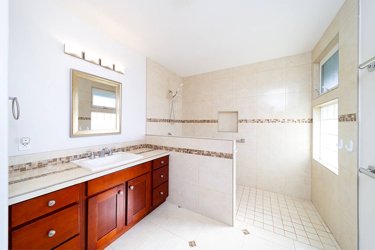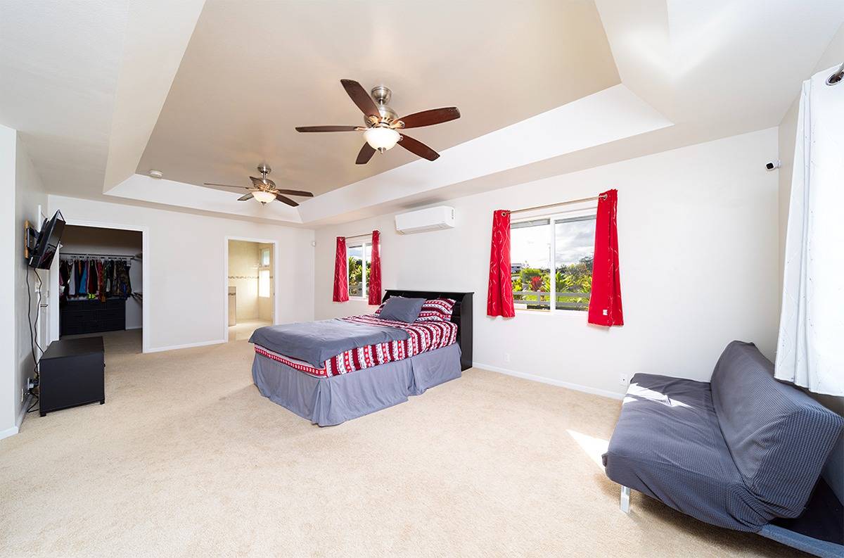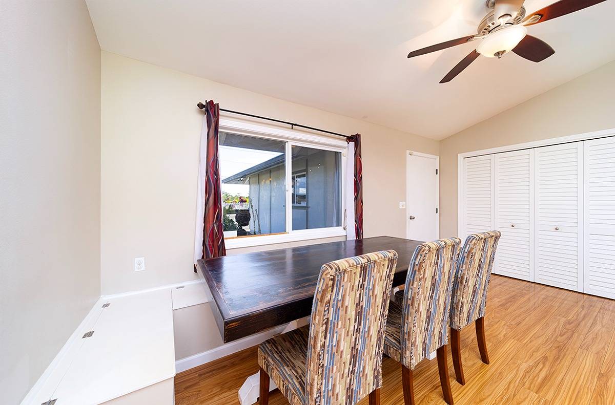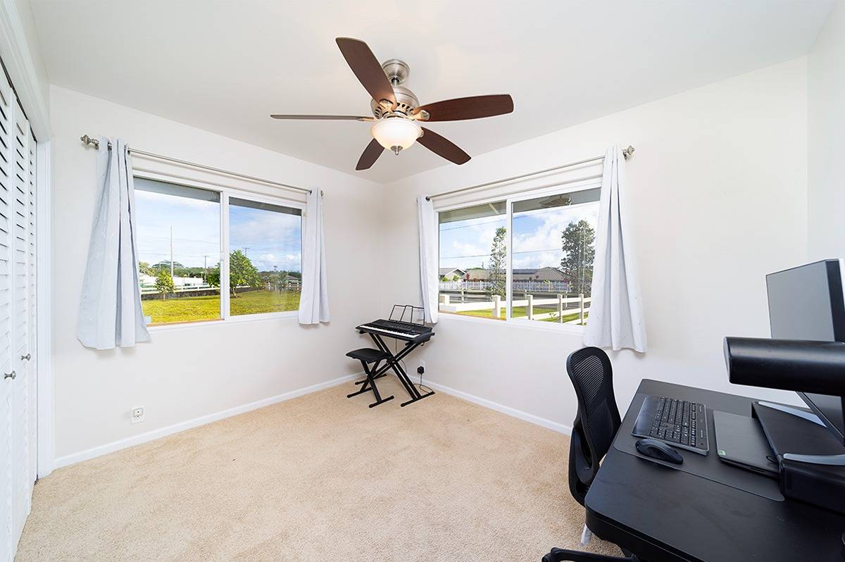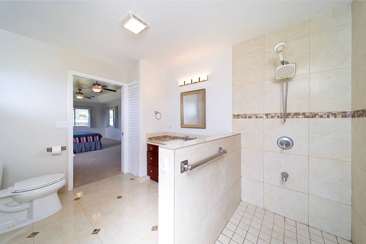 Tasteful, quality home on a fully fenced grassy one acre in one of Hilo's finest subdivisions located above the University, shopping, and many other conveniences. This home has many surprising features such as an expansive great room, spectacular kids bathroom, expansive master bedroom with huge walk-in closet and beautifully tiled master bath with lipless shower and ADA inspired. Slate entry with 8x8 stained poles and a cute and tasteful rock garden. Double door entry with leaded glass. Beautiful living room with laminate flooring, vaulted ceilings, large storage closet, 2 dual blade glass sliding doors that lead out to an expansive covered lanai with Mauna Kea views. Kitchen has a beautiful range hood over granite island featuring gas stainless steel looking range. All appliances, refrigerator, and dishwasher are stainless steel looking. Also includes large under mount sink with granite backsplash and cute pass through counter from kitchen to lanai.