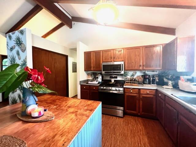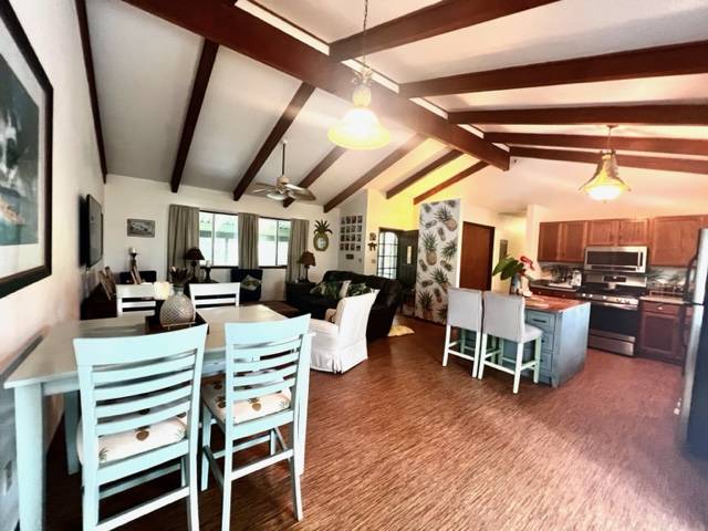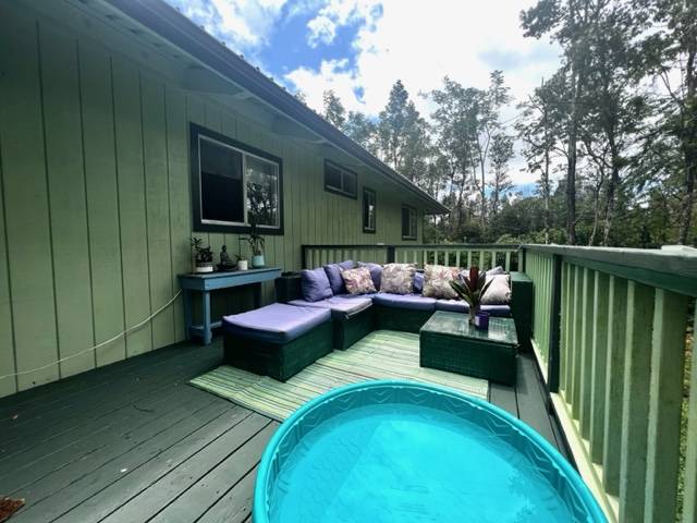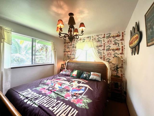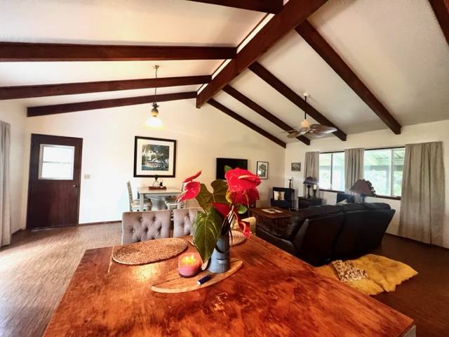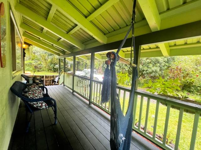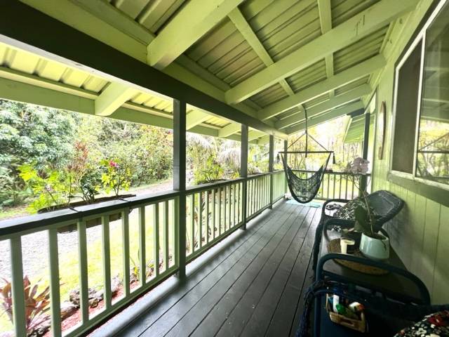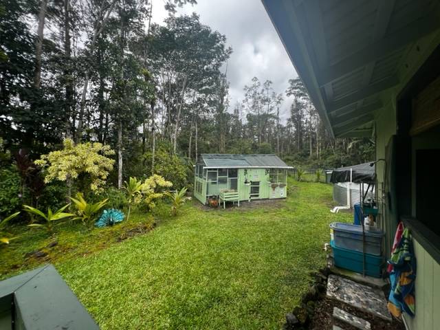 As you walk into the first shaded covered lanai entry you are greeted with views of your lush, tropical oasis, the interior of the with gorgeous antique Hawaiian decor and special features throughout will make you smile! Vaulted open beams in the great room where you have a open room concept with a large kitchen with an island, living room and dining room space. The bathrooms have tiki and pineapple themed decor! There are 3 bedrooms total. Wait till you see the guest bedroom! The parrot decor awaits! The master bedroom has an ensuite bathroom with awesome wall paper and decor! A must see! The second lanai area is off the kitchen area from a slider entry. Great sitting area overlooking the brand new 8X16 chicken coup that has egg producing young hens! This goes with the house! Brand new gutters just recently installed. Stainless appliances in the kitchen! A dog run is also set up and available. Come visit, enjoy the garden paths and the feeling of Hawaiian yesteryears in your own lush rainforest! This home is well taken care of and is on Terminix service contract. Leilani Estates has a yearly HOA fee of $200 per year and a new owner transfer fee buyer pays for of $200 at purchase per lot. See all that Leilani Estates has to offer residents at www.LEILANIESTATES.ORG