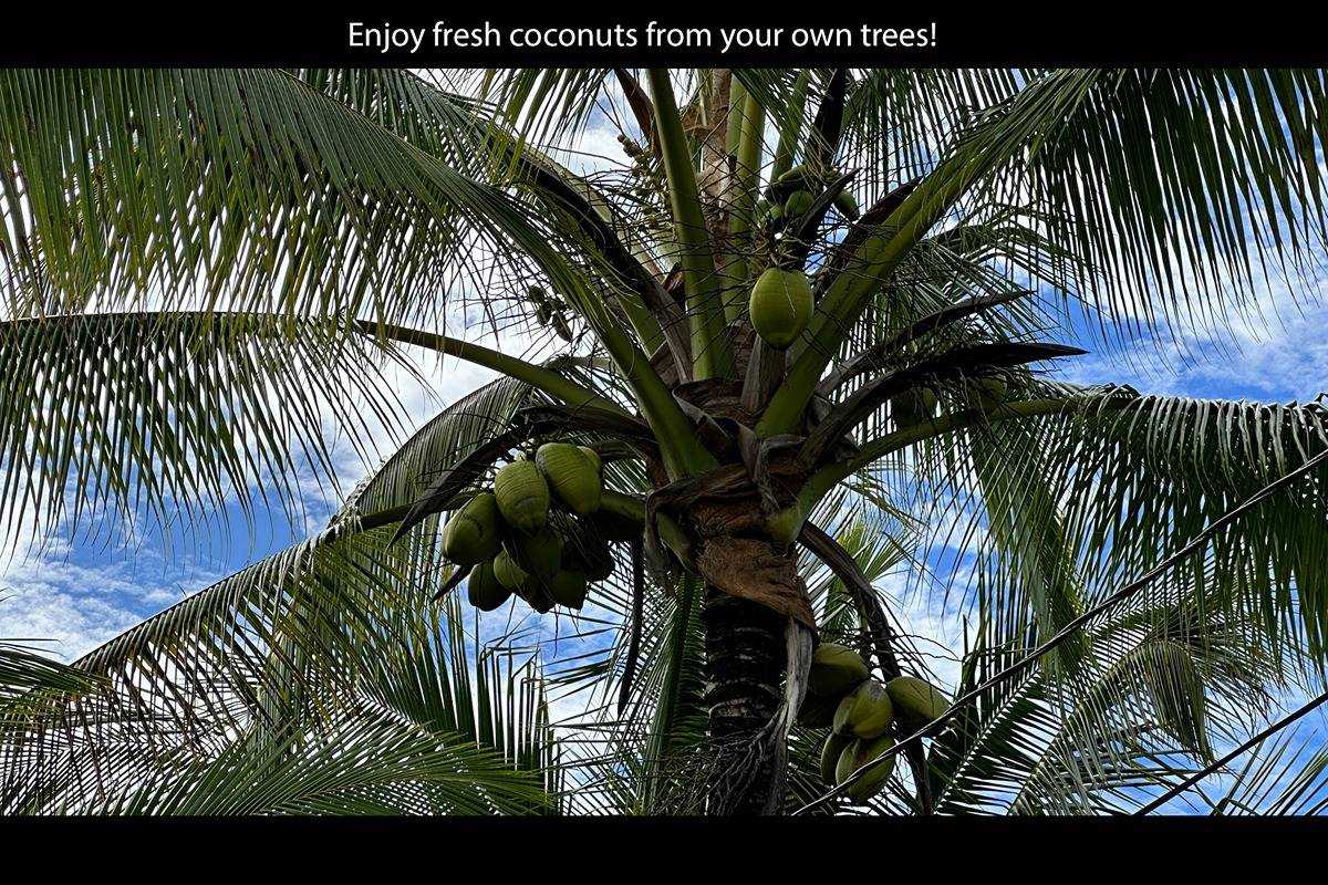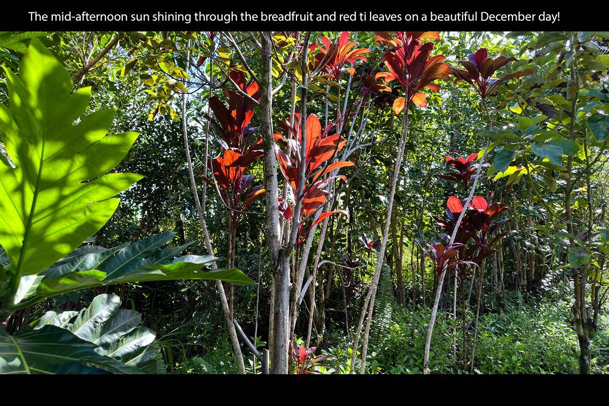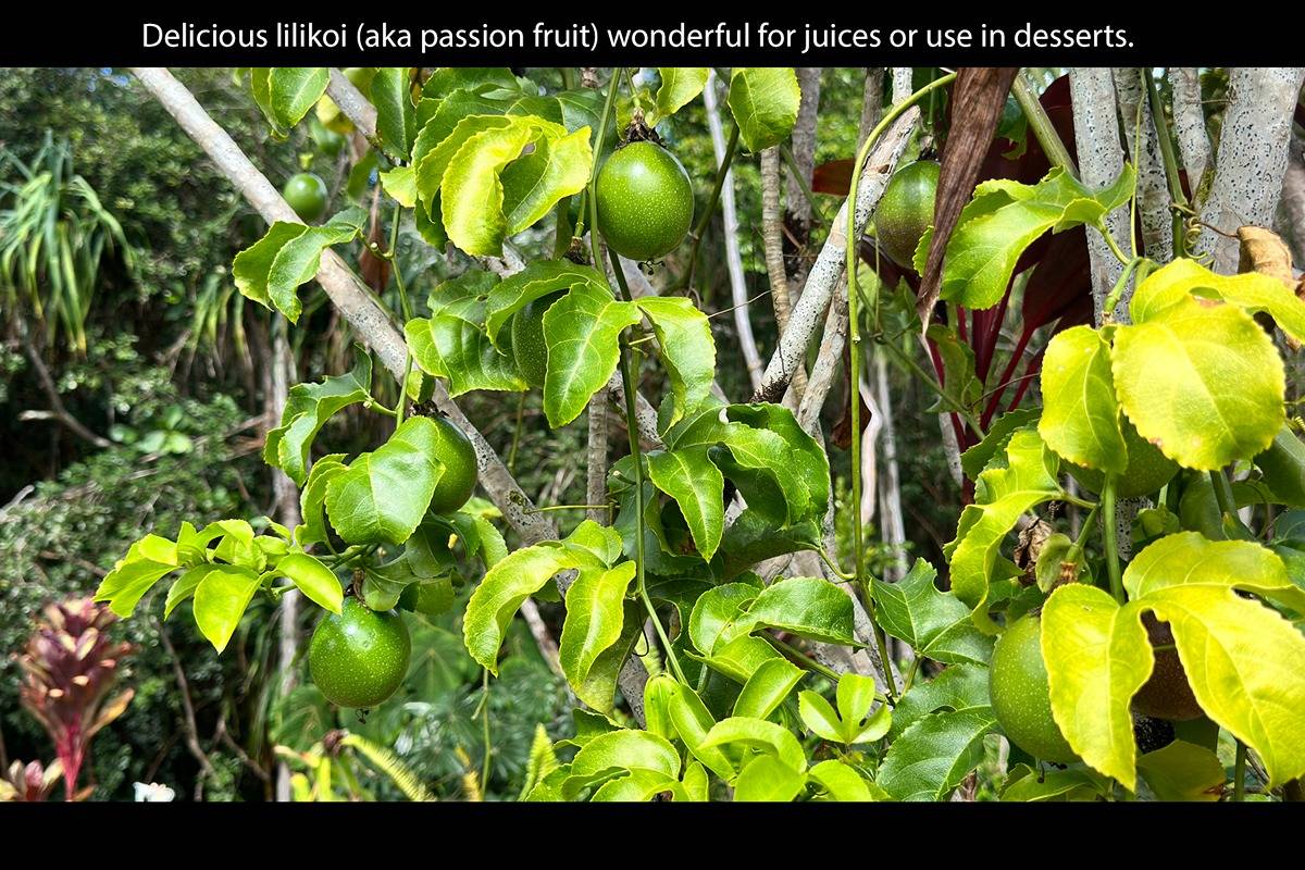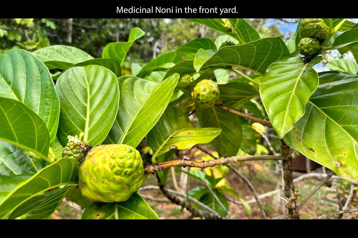 Fruit: Mango, Sour Sop, Avocado, Breadfruit, Orange, Kifer Lime, Kukui, Coconuts, White Pineapple, Likikoi, Aloe, Vanilla, Noni, Moringa