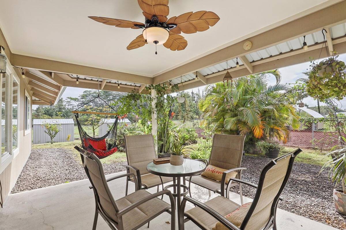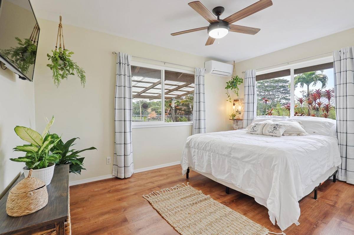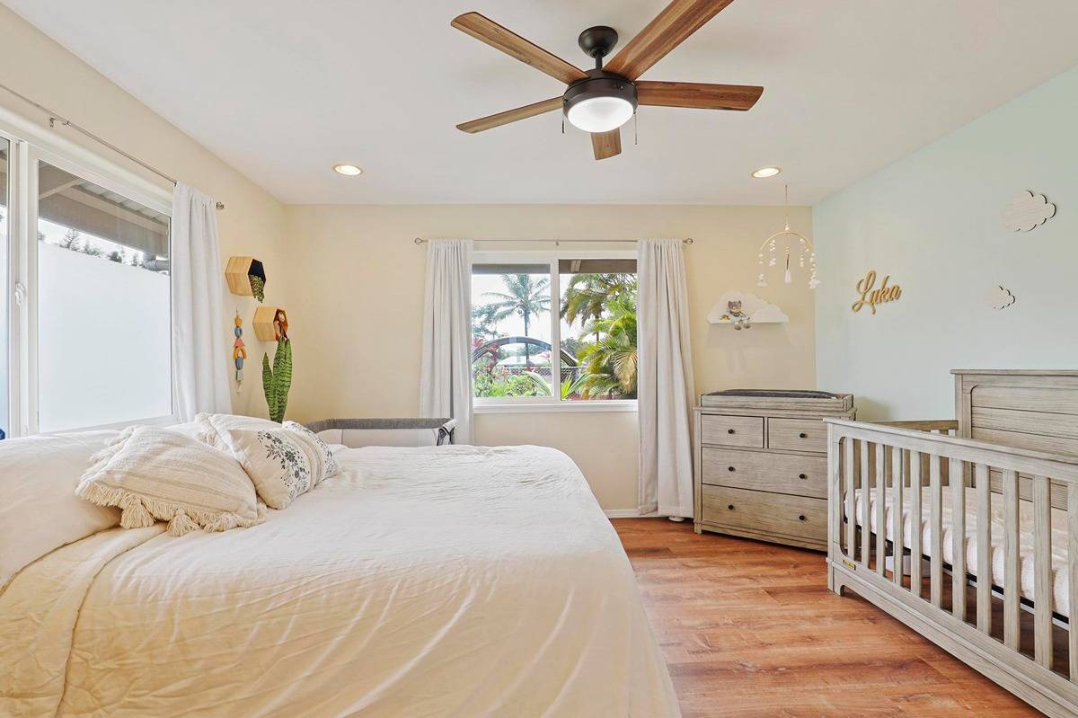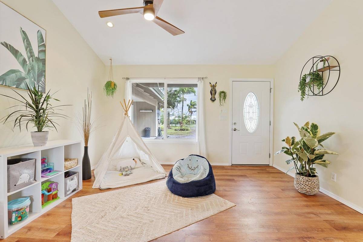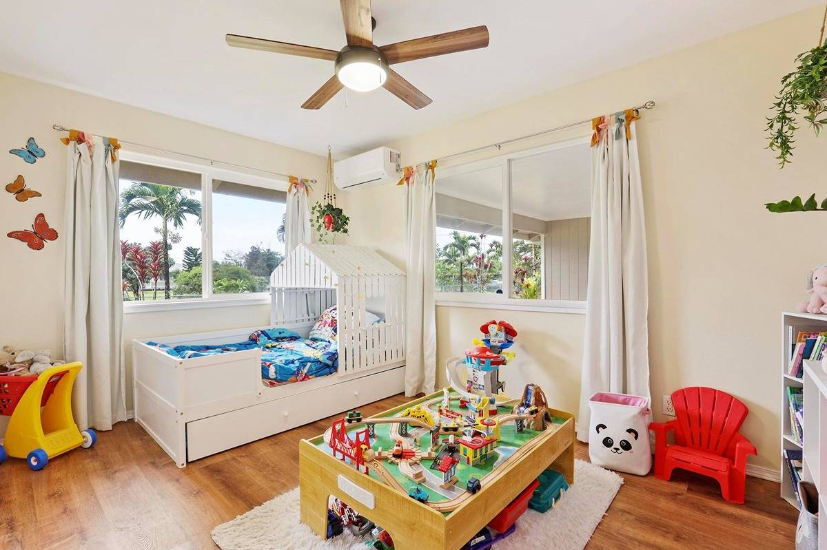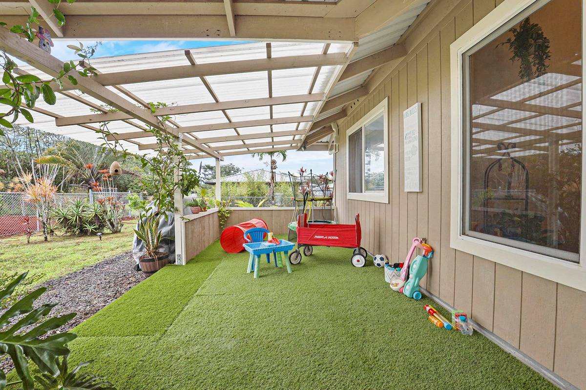 The primary ensuite ensures privacy and tranquility, strategically separated from the other bedrooms. Each bedroom comes equipped with its own split AC unit for personalized comfort. A covered carport with a spacious storage room adds convenience, and the covered lanai with a play area is perfect for outdoor gatherings.