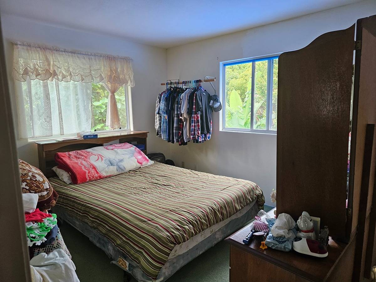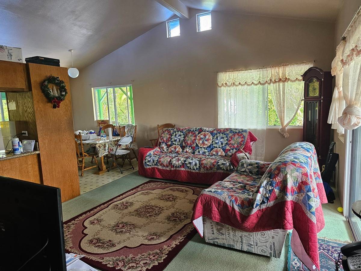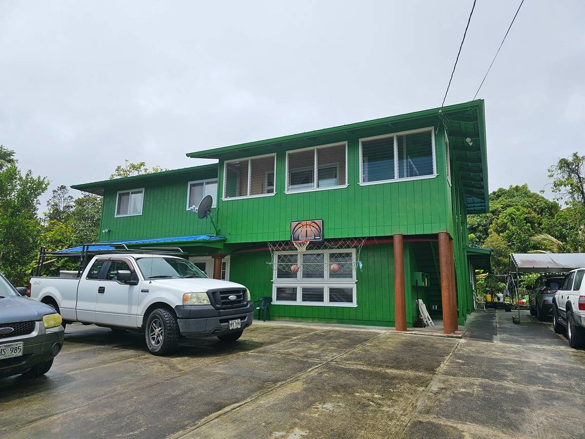 Large and spacious 2- story home in Hawaiian Acres off of Uhini Ana (Road 1) situated on a 1.87 acre lot. Upstairs level has 3 bedrooms and 1.5 baths with vaulted ceilings in the living room and kitchen area. There's views of the property from front and back lanais with the best vantage point. Downstairs is a large room perfect for entertaining or converting into another family/den room with a full-bath and three smaller-sized rooms across a hallway that has outside access. Lower level also has a large food prep/wet bar area that use to be a lanai that was enclosed to have additional storage and workspace.