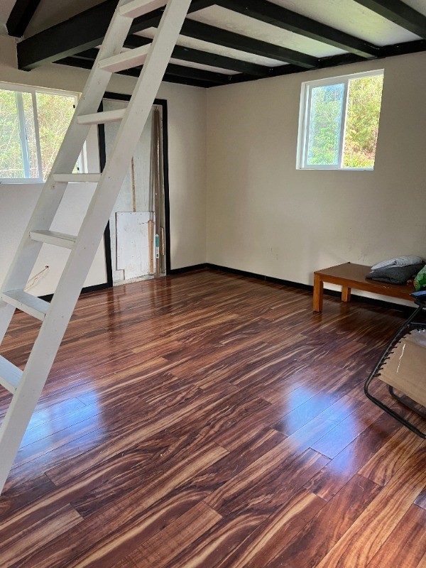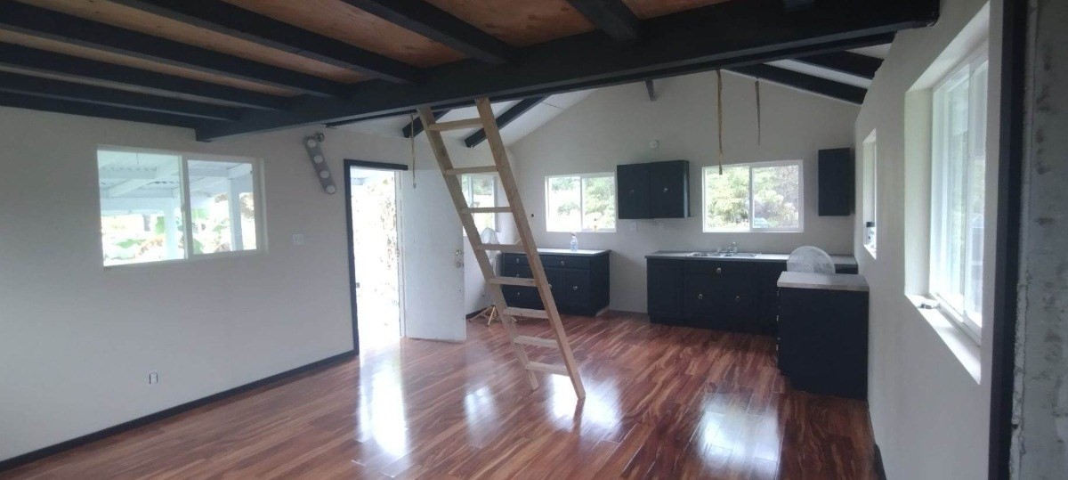 Really cute little newly renovated designer house with Koa laminate flooring, black cabinets, a loft, and chic tile backsplash and new butcher block countertops. New contractor quality premium paint job inside and out. Everything inside home is brand new as of 2022 and has never been lived in. bathroom is separate structure and has epoxy reflector enhancer flooring and a nice shower. There have been some small palm trees and other plants planted that will grow to make a privacy hedge. Vacant lot next to and across from house. The roads going into the neighborhood are a little rough. Cars can make it. You must go slow. There are some junk cars on the way into the neighborhood and houses that have some garbage in front. End of street where this house is located is dead end and nice and clean. No garbage or junk cars, but will pass these things coming in.