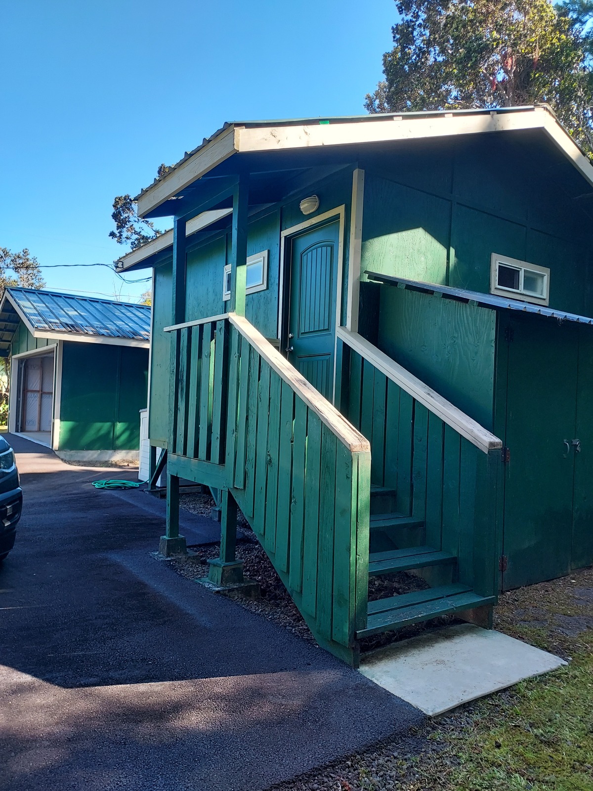 AN ADORABLE & COZY COWBOY CABIN. BUILT & COMPLETED WITH ALL THE DESIRES OF A TINY HOME PLUS A RUGGED FINISH. CUTE, WARM & COMFORTABLE BEDROOM WITH A SPACIOUS LIVING ROOM & KITCHEN. BEAUTIFUL SHOWER STALL IN THE BATHROOM. THERE IS A CRAFTMAN STORAGE SHED PERFECT FOR THE WASHER & DRYER WITH A 220 OUTLET. DETACHED 400 SQ FT GARAGE IN USE AS THE MAN CAVE & WORKSHOP. PROPERTY IS FULLY FENCED AND GROOMED WITH AN ASPHALT DRIVEWAY. GORGEOUS LANDSCAPING WITH HAPU'U GARDENS, WHITE GINGER, SPRUCE & OHIA TREES AND LOVELY HYDRANGEAS IN FULL BLOOM. AN AWESOME PLACE TO CALL HOME....