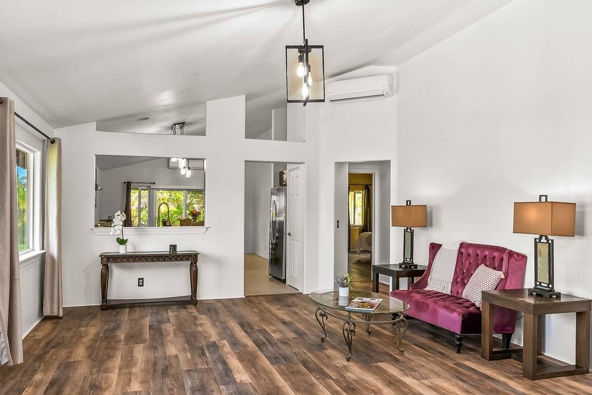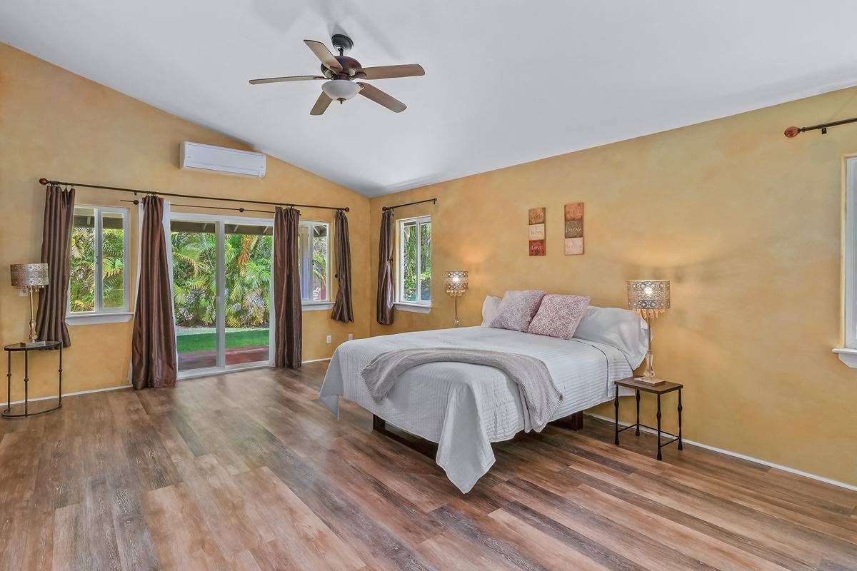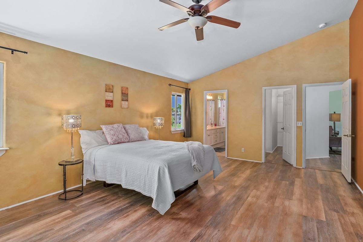 Enjoy stunning mountain views from the kitchen and living areas along with soaring vaulted ceilings and lots of natural light. The spacious gourmet eat-in kitchen with custom cabinets and newer appliances, opens to a large, covered lanai perfect for Hawaiian-style indoor-outdoor living. The oversized primary bedroom suite features an ensuite bath, large walk-in closet and a slider out to the expansive lanai.