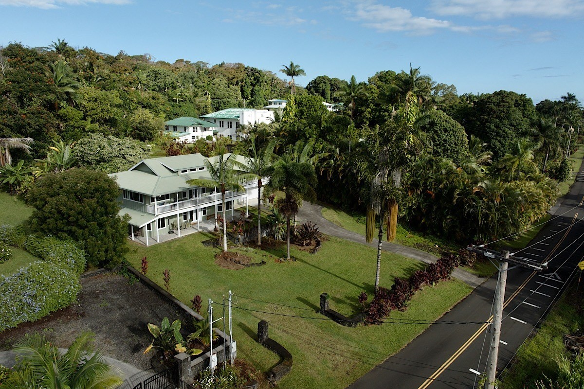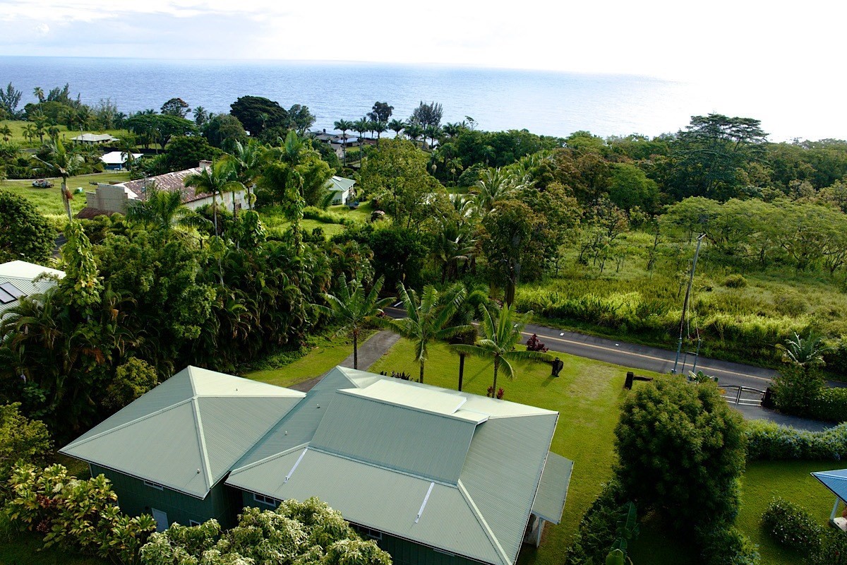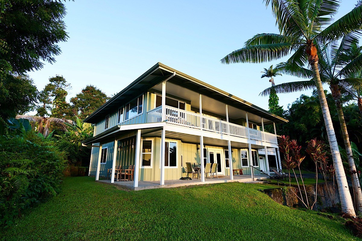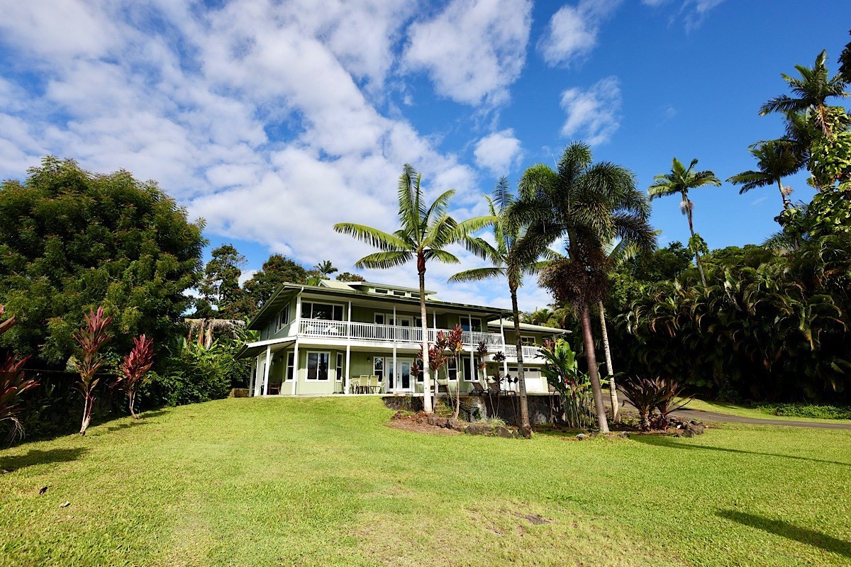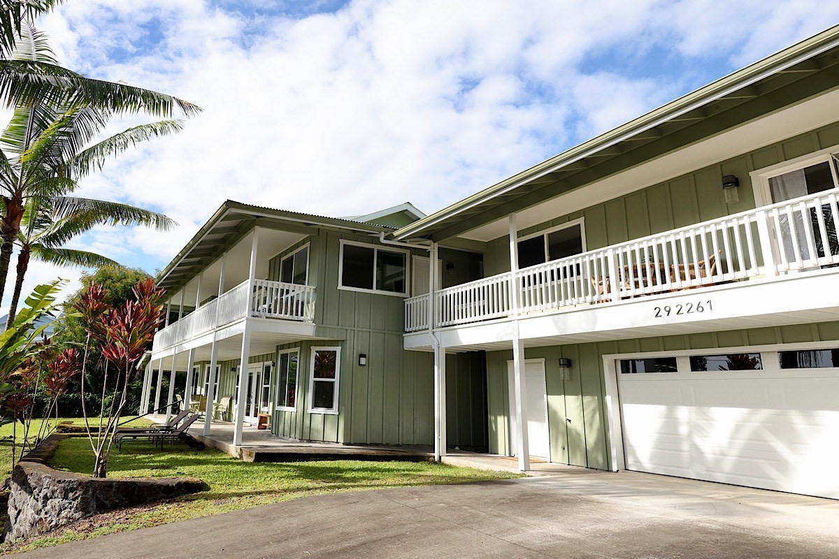 Stately styling in popular Hakalau Plantation! Just minutes from Hakalau Beach Park, this home has been lovingly redesigned to make marvelous use of the generous spaces. With over 3000 sf of living area including an "Ohana" unit located over the garage, the property is over 1/3 acre and zoned RS 7.5. The home sits back from the road with lawn space preserved for your future pool. A wide lower lanai greets you as you climb the stately rock steps and enter to ceilings that soar from 9 ft to two stories. A newly configured kitchen is open concept with an awesome breakfast bar, great built-ins, and generous work-surfaces. With high end touches, it's truly large enough for several chefs to enjoy! Part of a two story great room with beautiful stairs leading to the upper floor, this open concept space is always party ready! Also on this level is a bedroom with a gorgeous ensuite bath and nice views. The bluetooth speakers and mood lighting in this space are but a few of the special touches. A second makai (ocean) side bedroom offers a flexible space for your office, craft room or ?? An easy climb up the wide staircase leads to a central area overlooking the great room and opening onto a wide ocean view lanai. An office nook is tucked to one side. This multi-purpose space is a great yoga spot or entertainment area. A large primary bedroom spans one end of the home with another bed and bath also in this area. This home truly has space for all and when it comes to accessory spaces, there no compromise in attached the guest space which can be accessed thru the garage or across a "bridge" from the upper level. With it's own breezy lanai, this private space features a bedroom and kitchenette. After a long day at the beach, this home is a true retreat with lots of space, all utilities and finishes you'll enjoy for years to come!