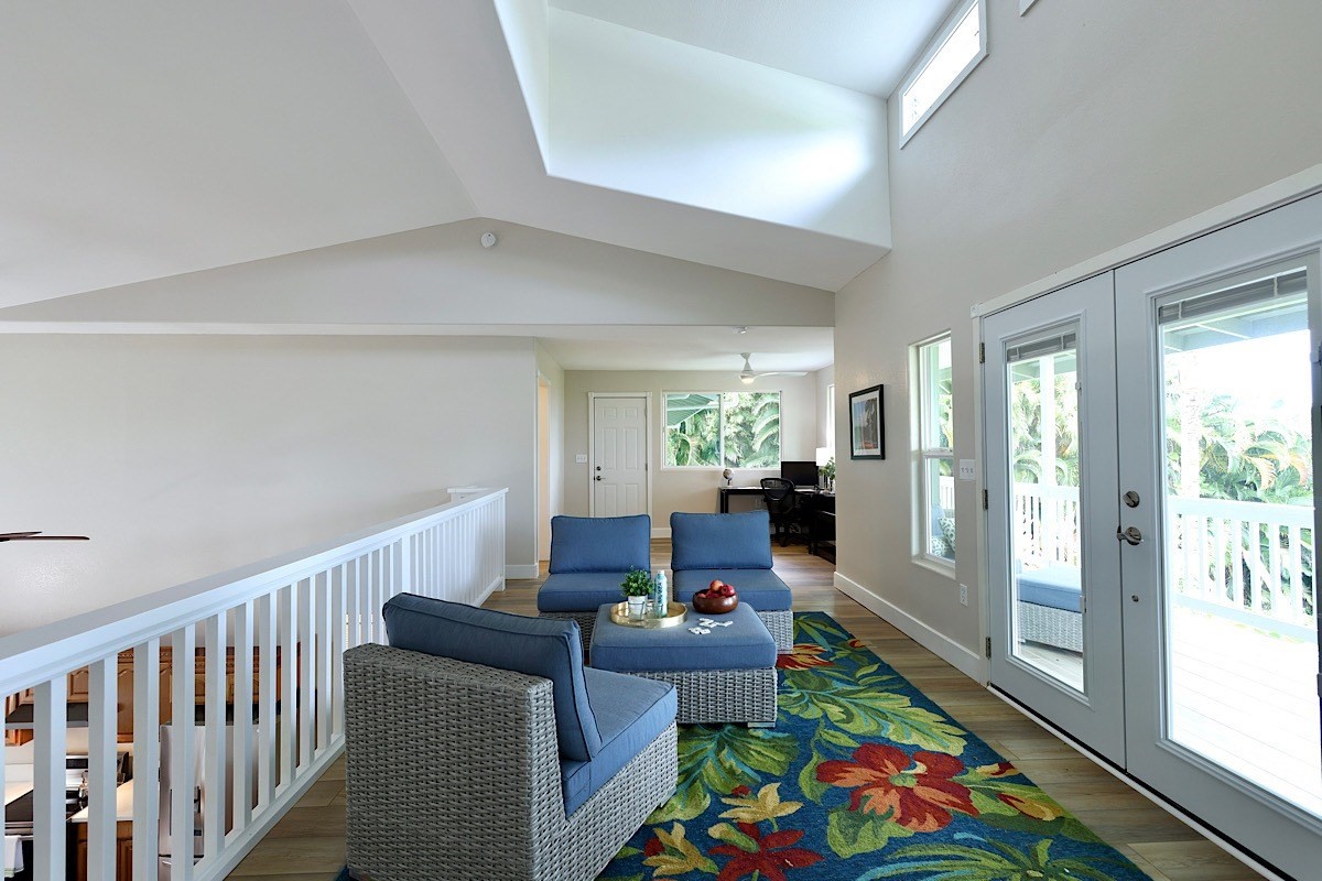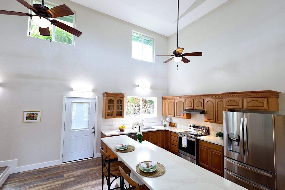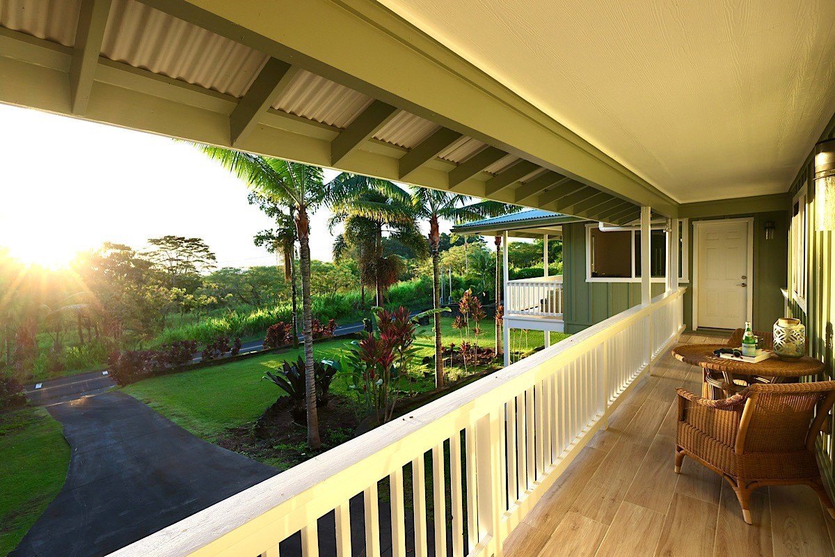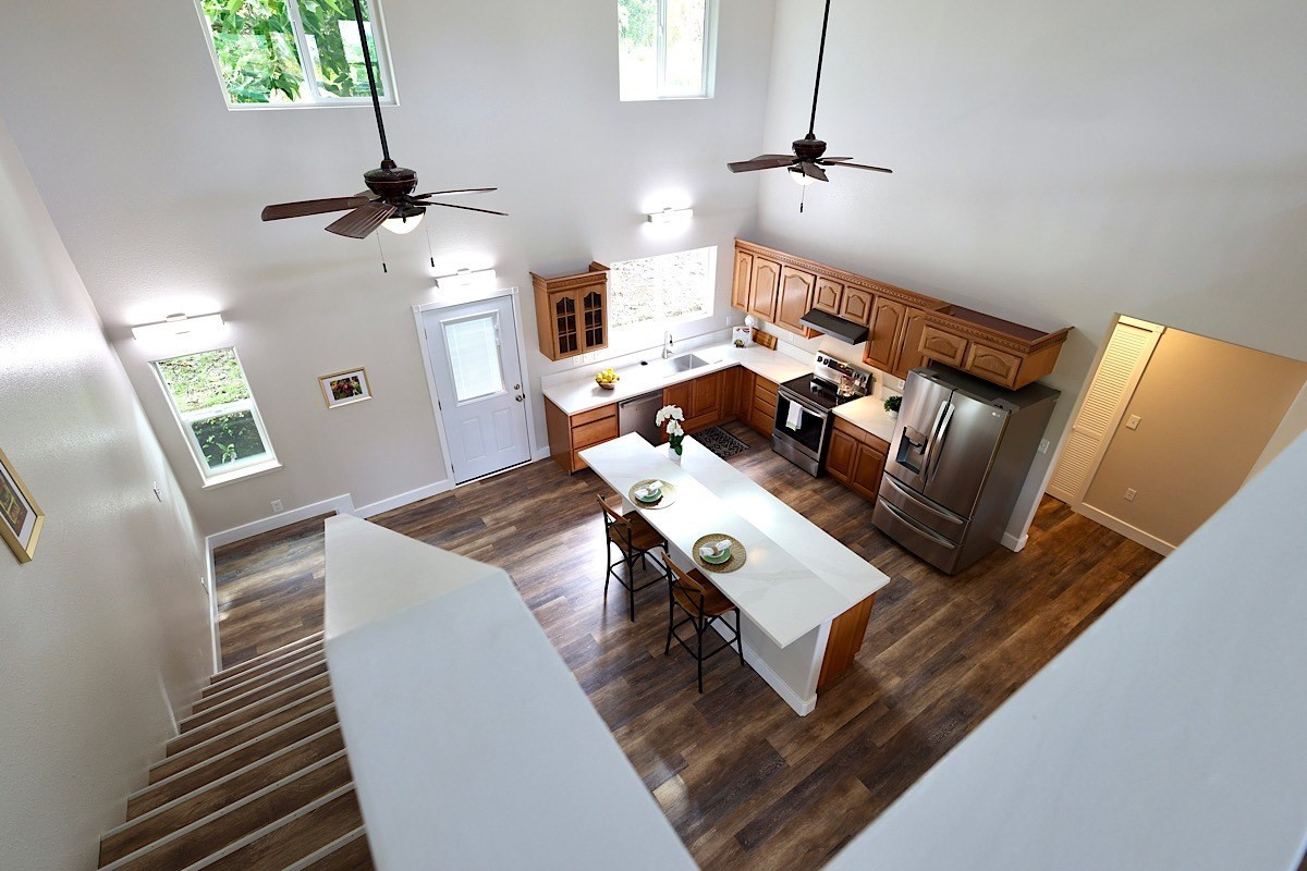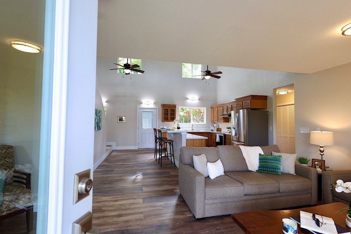 Stately styling in popular Hakalau Plantation! Just minutes from Hakalau Beach Park, this home has been lovingly redesigned to make marvelous use of the generous spaces. With over 3000 sf of living area including an "Ohana" unit located over the garage, the property is over 1/3 acre and zoned RS 7.5. The home sits back from the road with lawn space preserved for your future pool. A wide lower lanai greets you as you climb the stately rock steps and enter to ceilings that soar from 9 ft to two stories. A newly configured kitchen is open concept with an awesome breakfast bar, great built-ins, and generous work-surfaces. With high end touches, it's truly large enough for several chefs to enjoy! Part of a two story great room with beautiful stairs leading to the upper floor, this open concept space is always party ready! Also on this level is a bedroom with a gorgeous ensuite bath and nice views. The bluetooth speakers and mood lighting in this space are but a few of the special touches. A second makai (ocean) side bedroom offers a flexible space for your office, craft room or ?? An easy climb up the wide staircase leads to a central area overlooking the great room and opening onto a wide ocean view lanai. An office nook is tucked to one side. This multi-purpose space is a great yoga spot or entertainment area. A large primary bedroom spans one end of the home with another bed and bath also in this area. This home truly has space for all and when it comes to accessory spaces, there no compromise in attached the guest space which can be accessed thru the garage or across a "bridge" from the upper level. With it's own breezy lanai, this private space features a bedroom and kitchenette. After a long day at the beach, this home is a true retreat with lots of space, all utilities and finishes you'll enjoy for years to come!