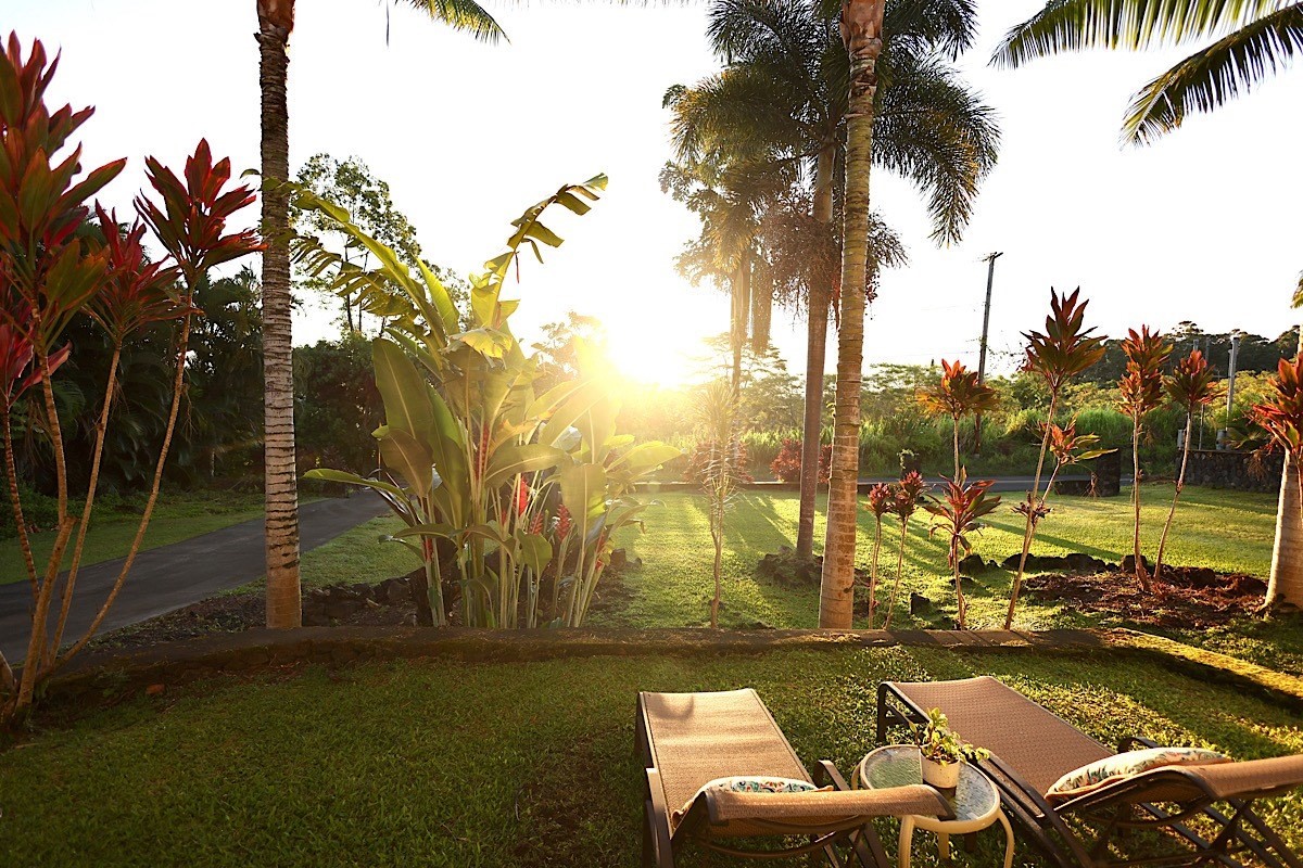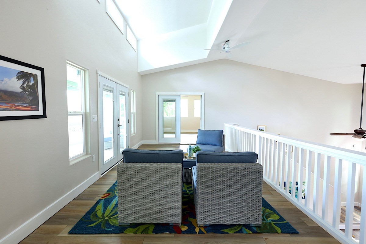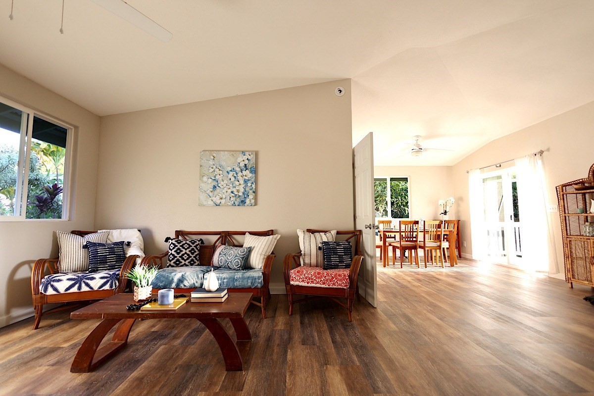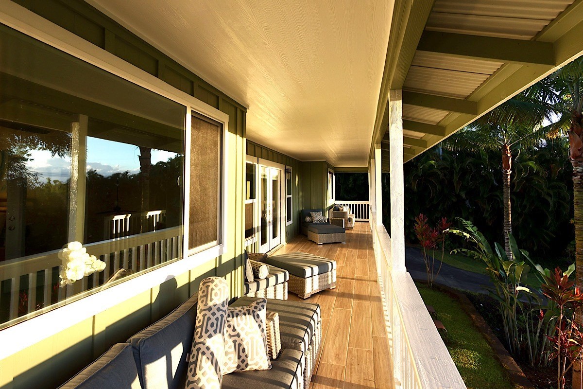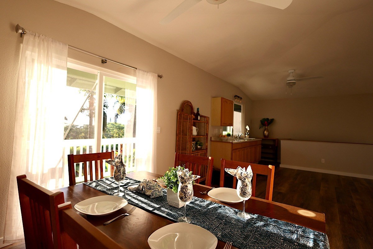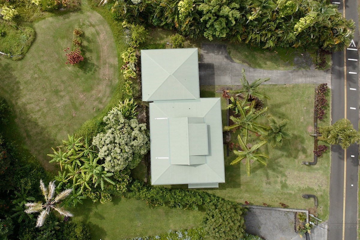 Stately styling in popular Hakalau Plantation! Just minutes from Hakalau Beach Park, this home has been lovingly redesigned to make marvelous use of the generous spaces. With over 3000 sf of living area including an "Ohana" unit located over the garage, the property is over 1/3 acre and zoned RS 7.5. The home sits back from the road with lawn space preserved for your future pool. A wide lower lanai greets you as you climb the stately rock steps and enter to ceilings that soar from 9 ft to two stories. A newly configured kitchen is open concept with an awesome breakfast bar, great built-ins, and generous work-surfaces. With high end touches, it's truly large enough for several chefs to enjoy! Part of a two story great room with beautiful stairs leading to the upper floor, this open concept space is always party ready! Also on this level is a bedroom with a gorgeous ensuite bath and nice views. The bluetooth speakers and mood lighting in this space are but a few of the special touches. A second makai (ocean) side bedroom offers a flexible space for your office, craft room or ?? An easy climb up the wide staircase leads to a central area overlooking the great room and opening onto a wide ocean view lanai. An office nook is tucked to one side. This multi-purpose space is a great yoga spot or entertainment area. A large primary bedroom spans one end of the home with another bed and bath also in this area. This home truly has space for all and when it comes to accessory spaces, there no compromise in attached the guest space which can be accessed thru the garage or across a "bridge" from the upper level. With it's own breezy lanai, this private space features a bedroom and kitchenette. After a long day at the beach, this home is a true retreat with lots of space, all utilities and finishes you'll enjoy for years to come!