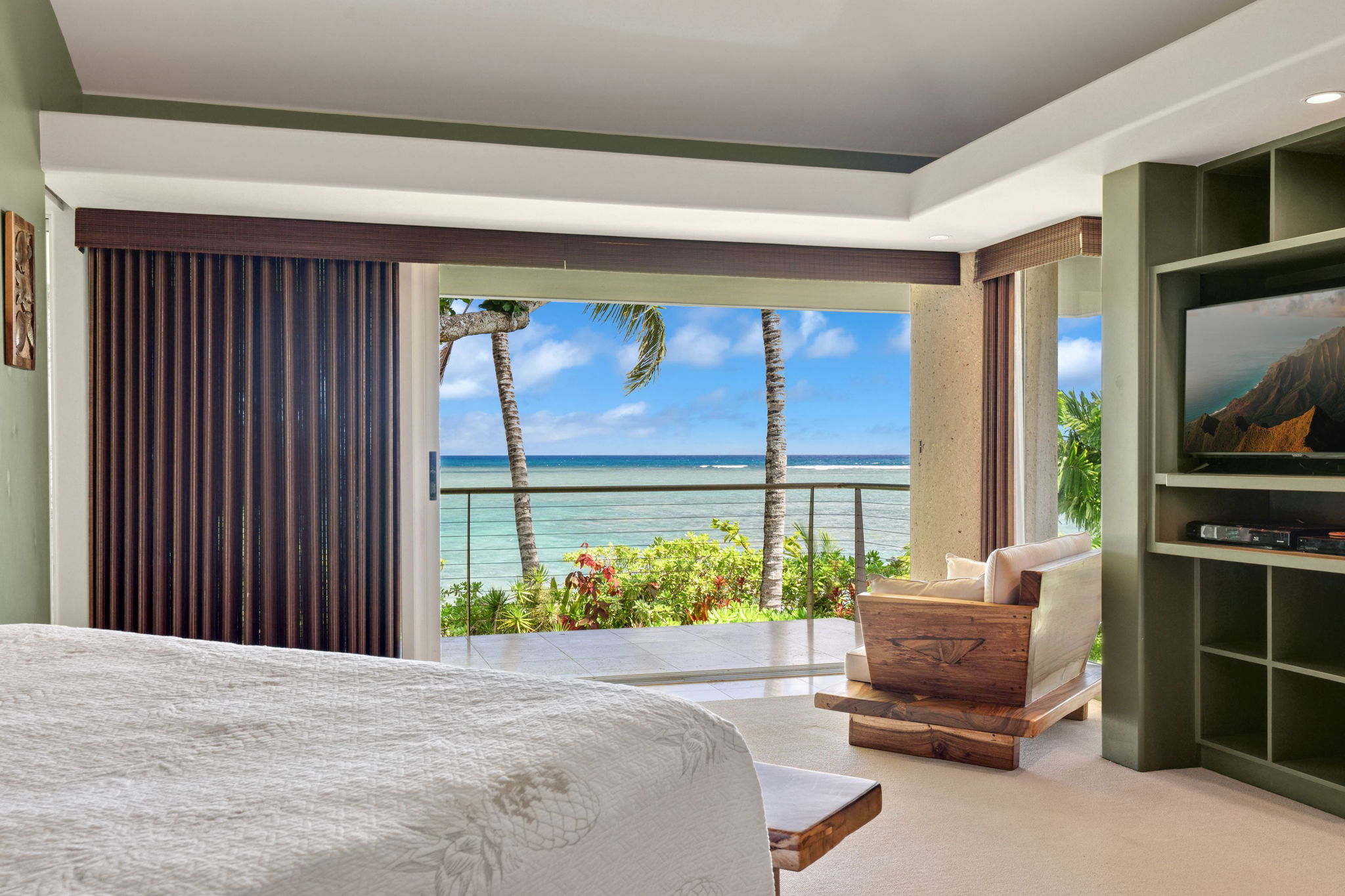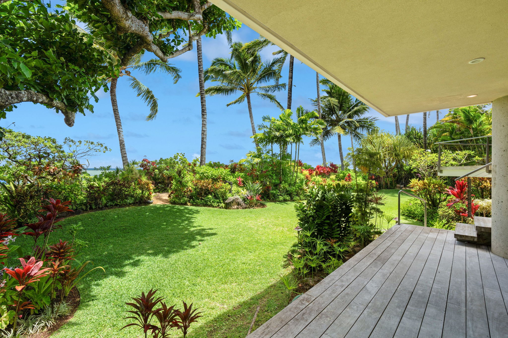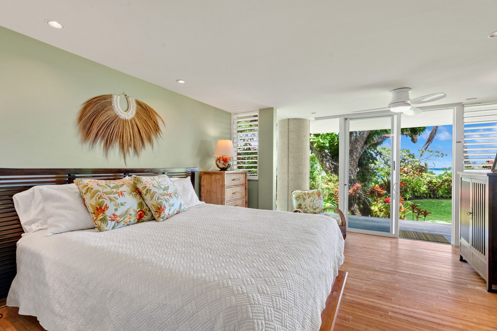 Situated on ½ acre of coveted oceanfront land, this contemporary estate designed by architect Norman Lacayo offers both private refuge and a phenomenal gathering place. With ~150’ feet of beach frontage, its envious location is steps from Anini beach and boasts 180° views of the ocean from the expansive decks. From the lush and tropical garden-like yard to the sun-soaked decks above, this is an oceanfront estate designed for exquisite comfort and impressive entertaining. The spacious and open floor plan with 9 ft.-tall glass pocket doors create a seamless transition between interior & exterior living areas welcoming the natural breezes off of the warm Pacific ocean into the home. Each bedroom offers ocean-views and private lanais, a perfect place to enjoy a good book or a cocktail. If income production is desired when you peel yourself away from heaven on earth, the home does have the coveted (TVR) vacation rental license.