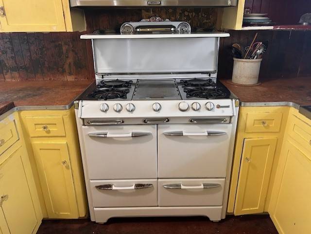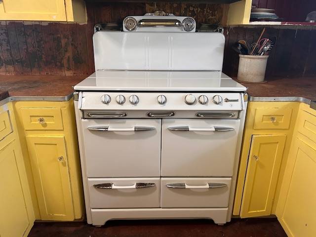 The kitchen can be found in the back of the house and includes a small area for a dining room table, but one of the most notable features can be found here! The center piece of the kitchen - a 1952 O'Keffe and Merritt stove/range with 4 burners and a center griddle. It is in nearly pristine condition and also comes with a foldable cover and adorable salt and pepper containers inside the holder. The original cabinets can also be found in the kitchen with an abundant amount of counter space too!