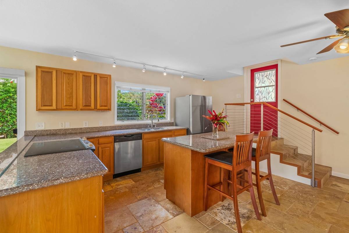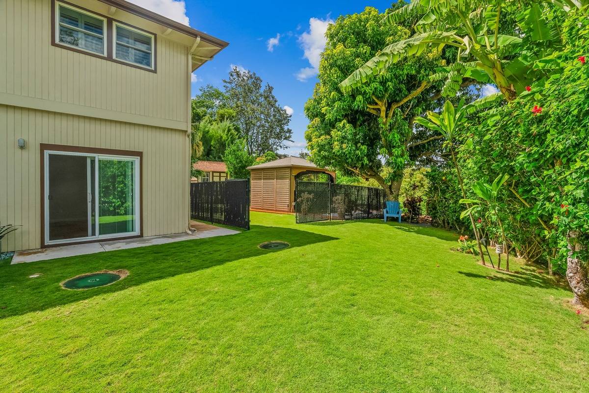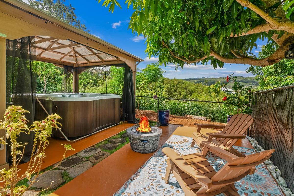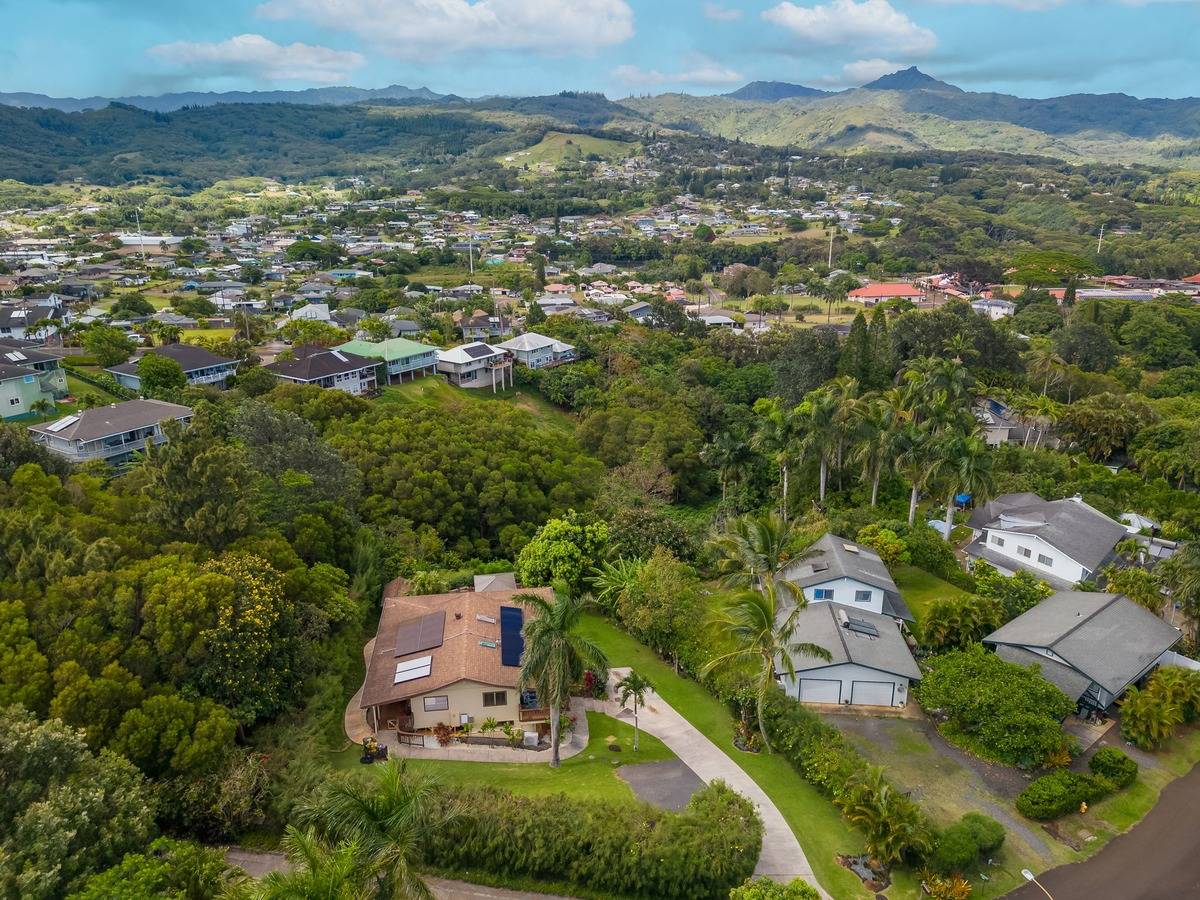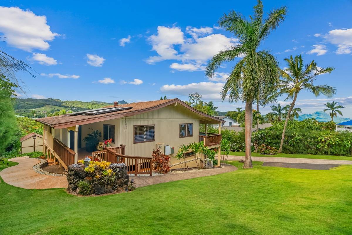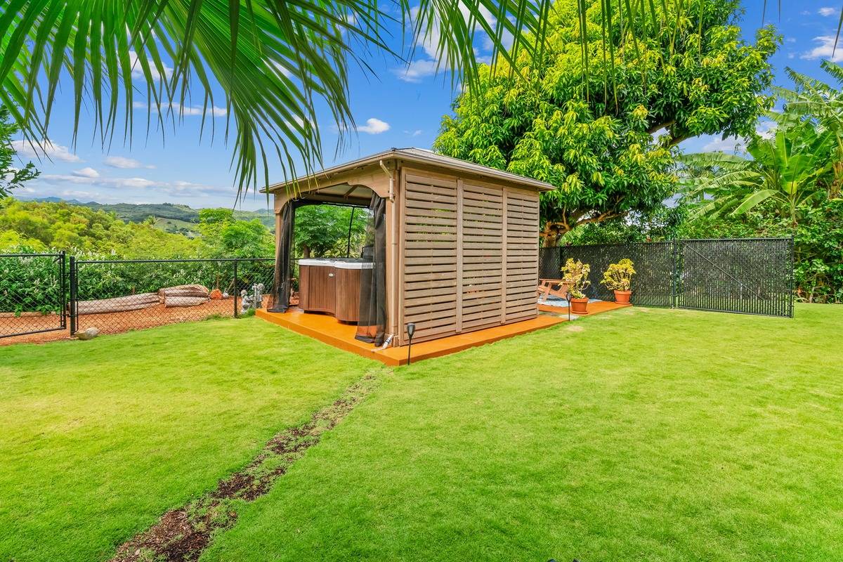 Well kept pristine home with quality upgrades in a peaceful Kalaheo neighborhood! Main home has 3 bedrms/2 bths & 1 bedrm/1 bth permitted additional dwelling w/laundry facilities. Private tropical paradise on 21,000 sqft. rim lot w/great views of Mt Kahili Owner occupied main home & ADU are each on 1 level. Relax or party in the permitted 8 person jacuzzi while enjoying the fire pit on it’s own thick slab under a stylish structure while taking in the mountain views. The 18 panel photovoltaic w/ tesla battery backup installed by Nathan Woods General contractor. Lots of hot water with the 2 solar water panels and a 120 gallon hot water heater helps to significantly reduces the electric bills & comes with a 47 to 49 yr warranty. Split AC/heater in the living room has 1 more free maintenance service appointment. Large storage/laundry room plumbed for additional bath/shower closet including new toilet & sink, plus a cute detached 8ft x 12ft storage building. Located on the sunnier side of Kalaheo in a quaint neighborhood on a quiet cul-de-sac w/long time owners. Within easy walking distance to Kukuiolono Golf Course at the golf restaurant. This property is owner loved! Main Home: Granite counters tops, Koa trimmed cabinets, Red Oak wood flooring in the living area, large porcelain tile floors in the bedrm & baths, 2 sky lights w/blinds, Quality vinyl louvers window treatments, Vinyl windows open in to clean, Putting green zoysia grass, Stainless steel electric 2 yr old GE double door refrigerator, Stainless steel 2 yr old double oven convection oven w/elect stove top, 5 yr comp roof, Nice paint job in & out. ADU: Travertine stone Italian tile floors in the bedrm & bths, Granite counter tops, New Samsung refrigerator. Extensive drainage system. Enjoy mature citrus and tropical fruit trees. The iron wood tree & variety of hibiscus hedge on 3 sides provides privacy. Chain link fence for the dogs and a home security system.