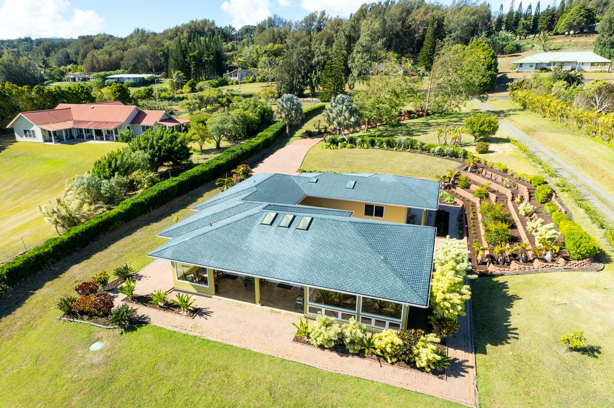 Surrounding the home are well-manicured lawns with Rainbow Eucalyptus, Lime, Banana, Tangerine, and Puakenikeni flowering Hawaiin trees. The terraced walls are landscaped with colorful lilies, birds of paradise, croton, and mock orange hedges. A beautiful red brick driveway that continues past the terraced rock walls leads down from the street to the house and leads to the entries, lanais, and patios.