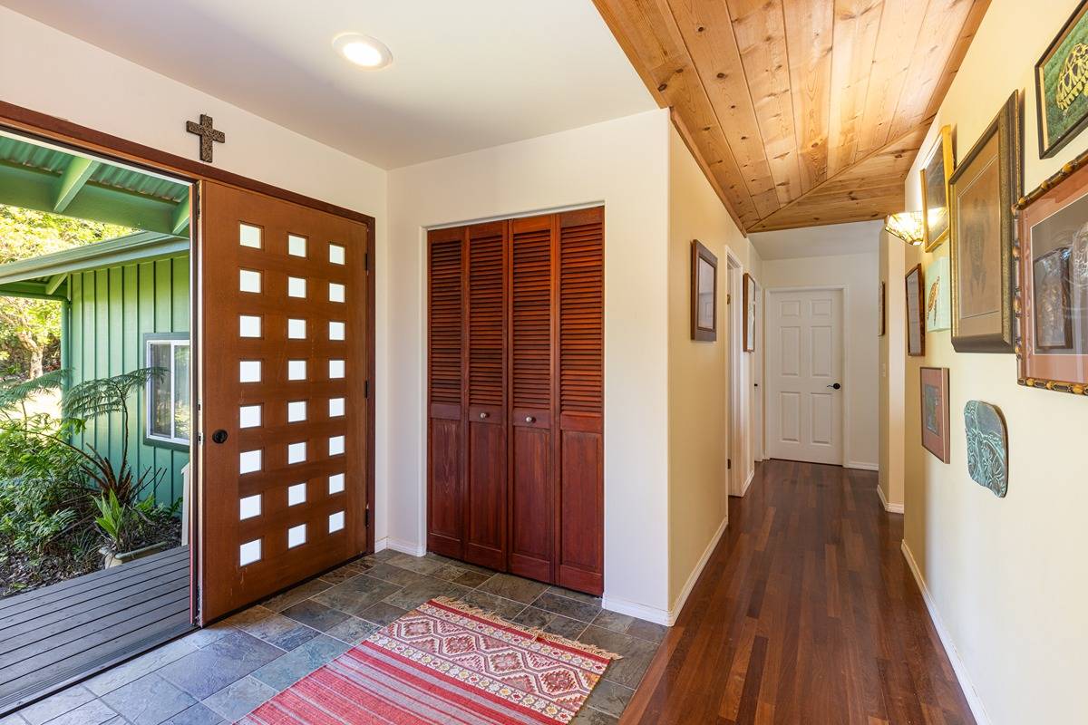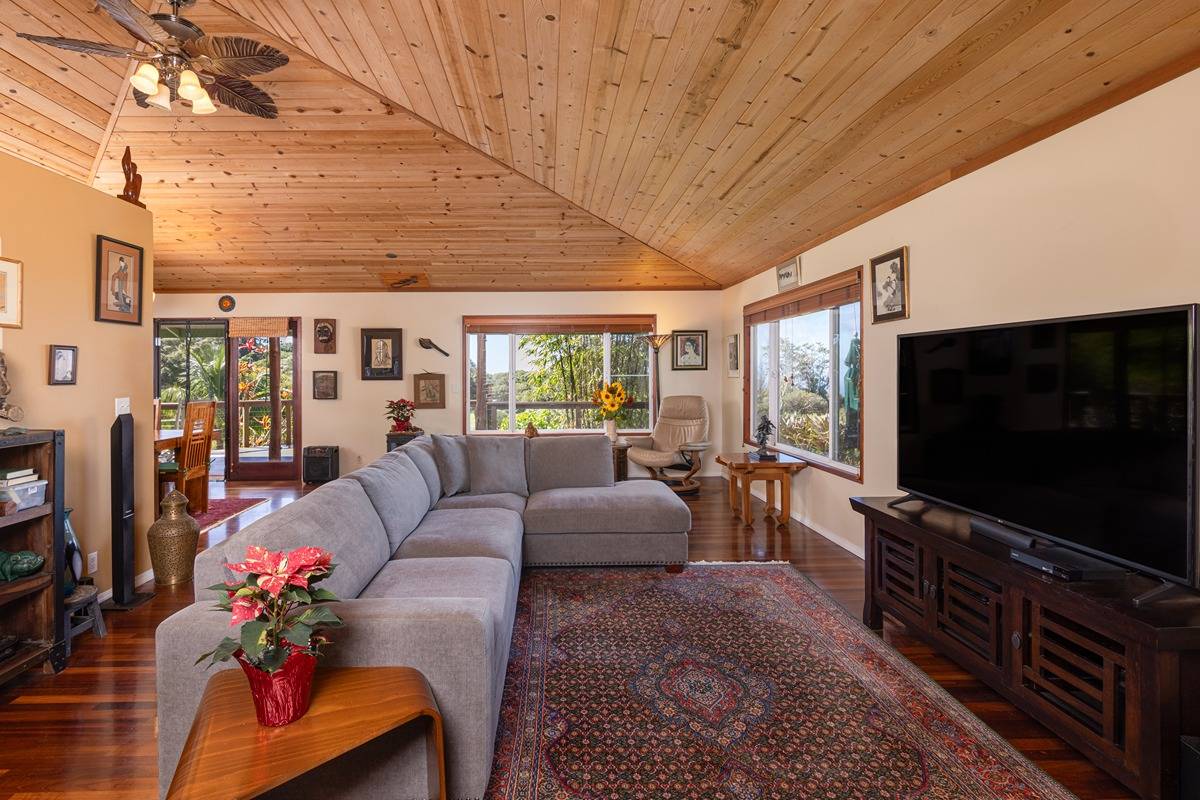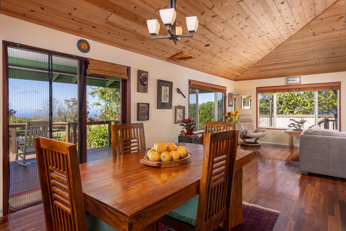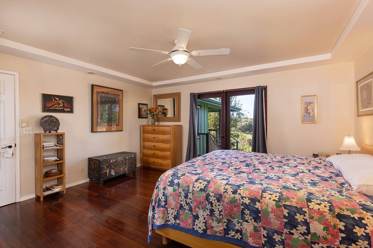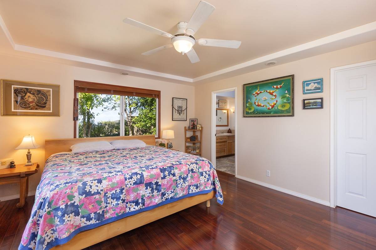 The classic plantation style home complete with covered lanai has an attached garage, 15 owned photovoltaic panels with a net metering system, and has solar hot water. 3 bedrooms, 2 full baths, one half bath, and a bonus room for office/nursery which is just off the master suite. There is a cedar ofuro off the master bedroom private deck that is included in the sale. The second master also has access to the lanai, at the other end of the house. The layout works really well. The open beam ceiling in the living area is really beautiful, along with the Brazilian cherry wood floors, this is a very homey, inviting opportunity!