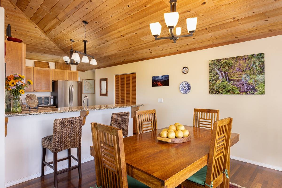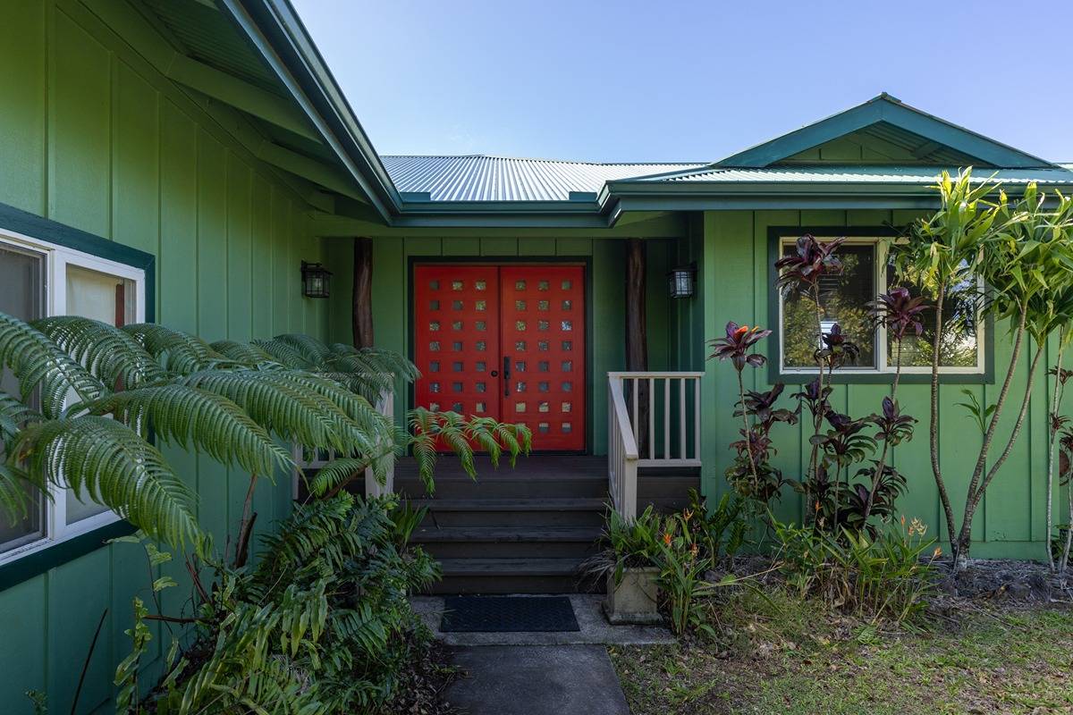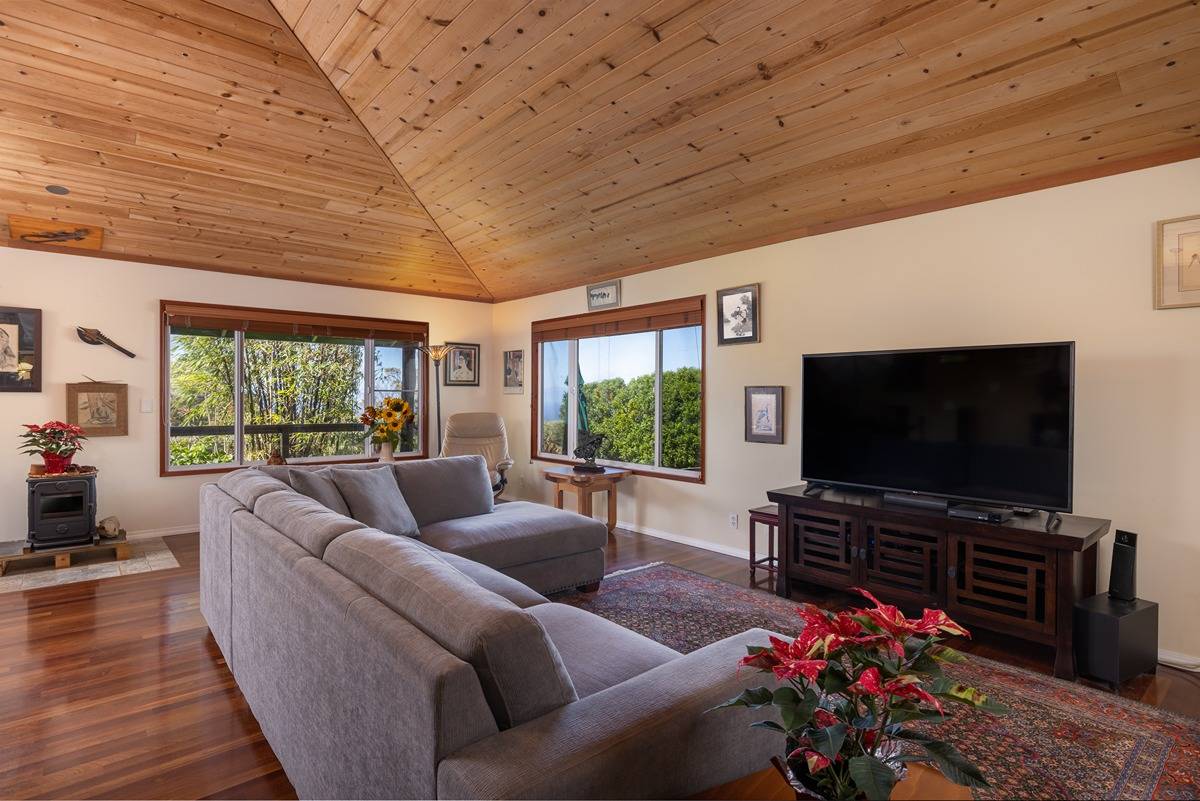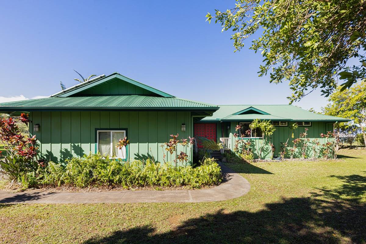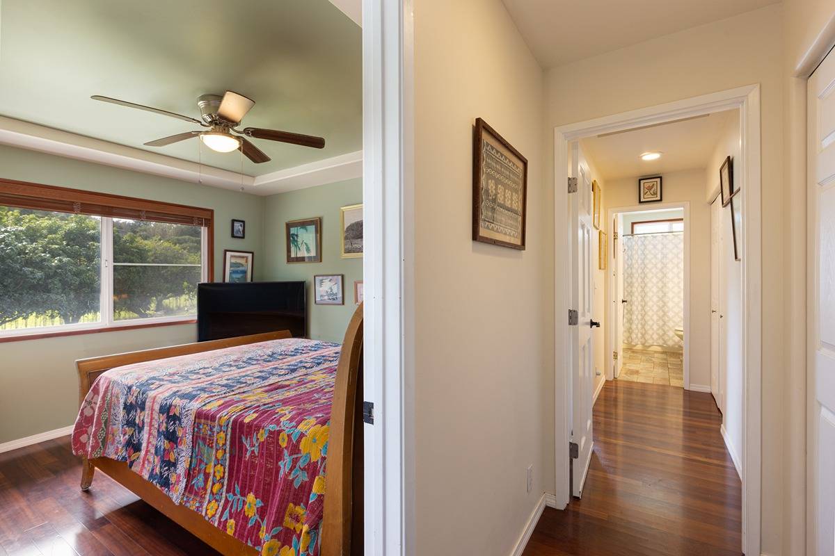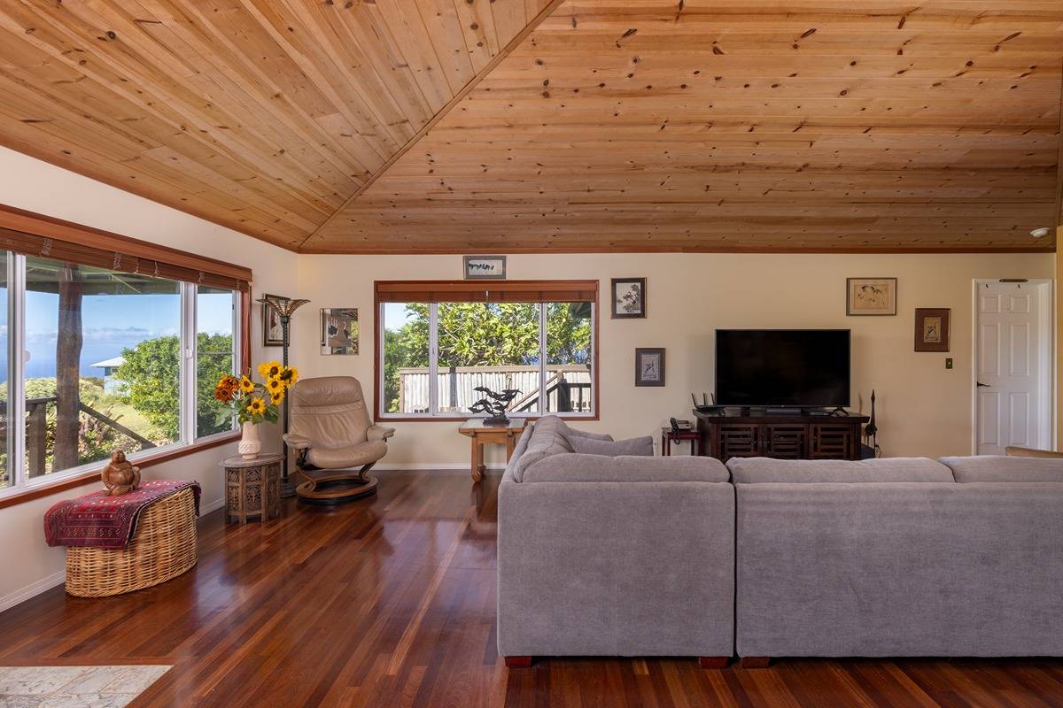 The classic plantation style home complete with covered lanai has an attached garage, 15 owned photovoltaic panels with a net metering system, and has solar hot water. 3 bedrooms, 2 full baths, one half bath, and a bonus room for office/nursery which is just off the master suite. There is a cedar ofuro off the master bedroom private deck that is included in the sale. The second master also has access to the lanai, at the other end of the house. The layout works really well. The open beam ceiling in the living area is really beautiful, along with the Brazilian cherry wood floors, this is a very homey, inviting opportunity!