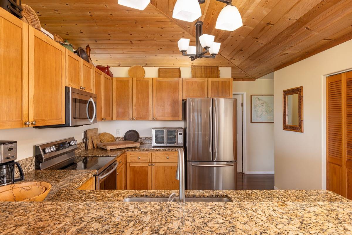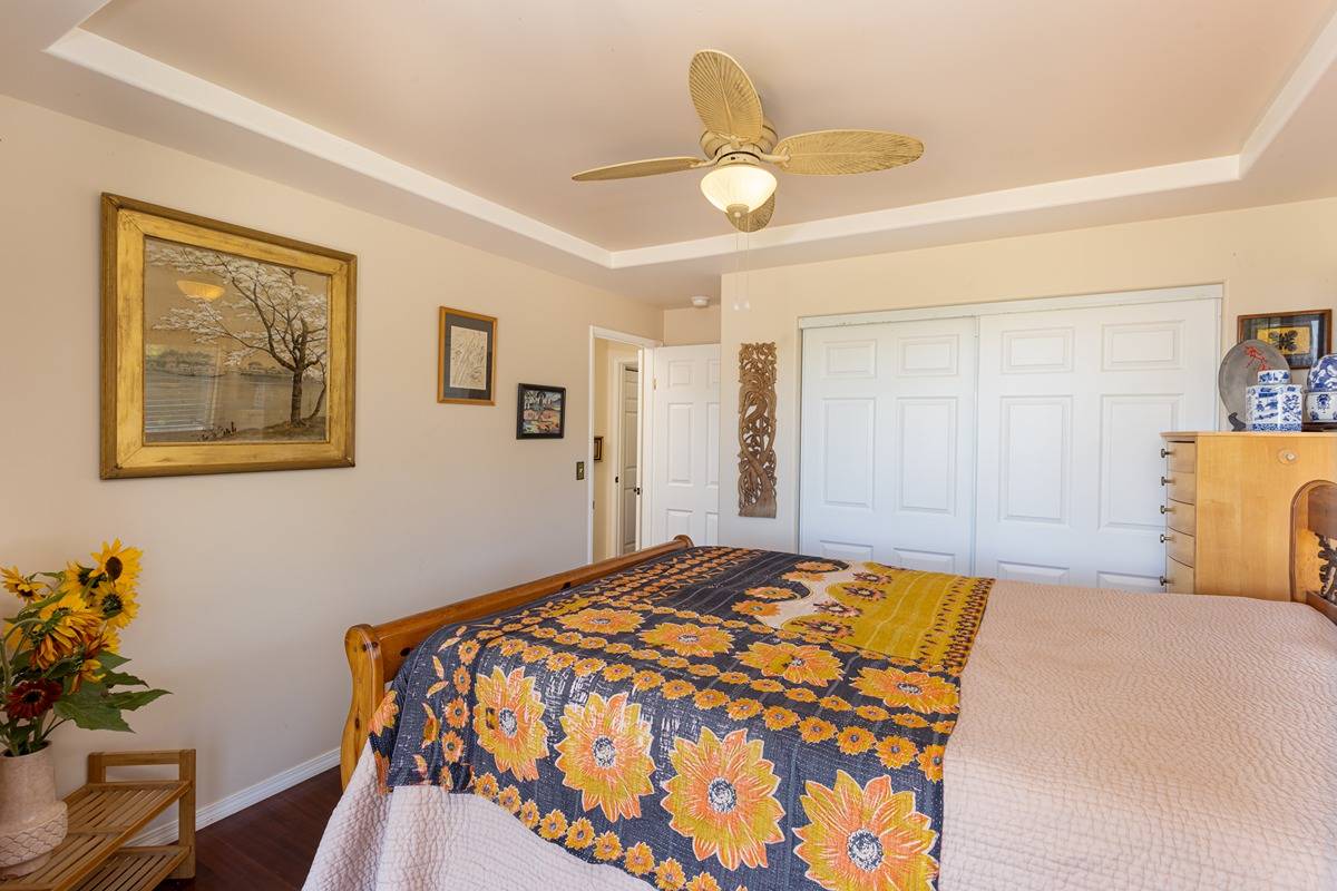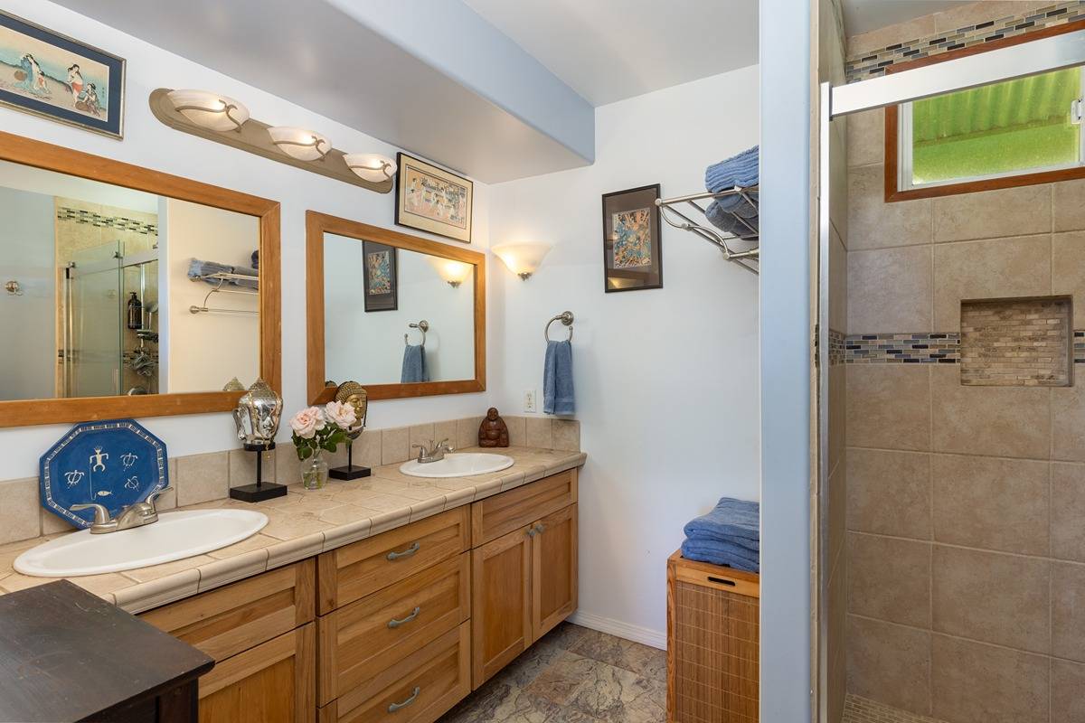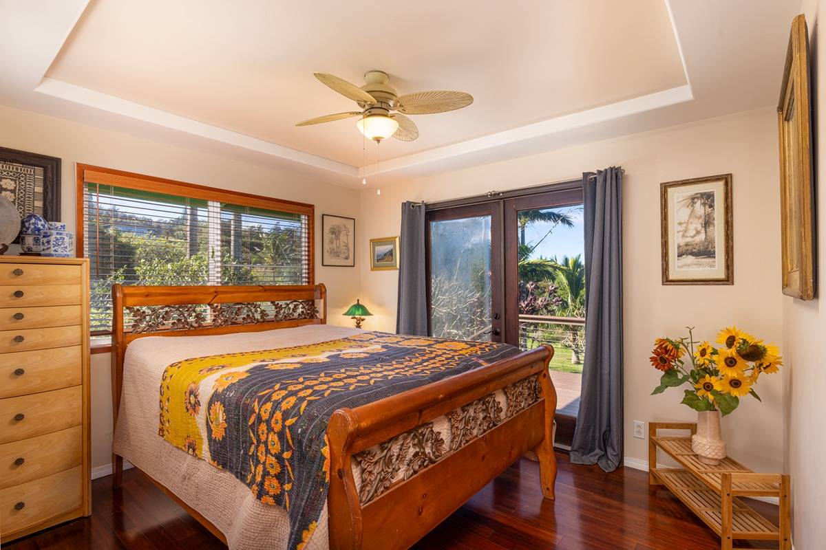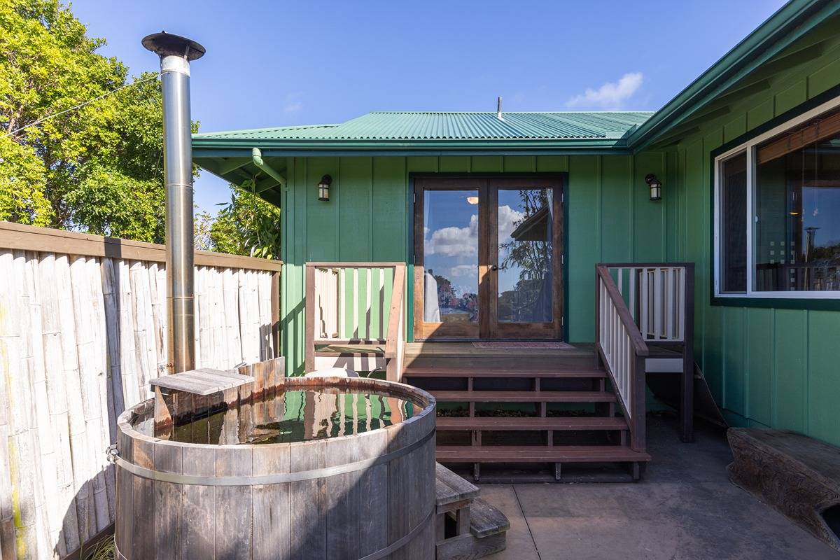 The classic plantation style home complete with covered lanai has an attached garage, 15 owned photovoltaic panels with a net metering system, and has solar hot water. 3 bedrooms, 2 full baths, one half bath, and a bonus room for office/nursery which is just off the master suite. There is a cedar ofuro off the master bedroom private deck that is included in the sale. The second master also has access to the lanai, at the other end of the house. The layout works really well. The open beam ceiling in the living area is really beautiful, along with the Brazilian cherry wood floors, this is a very homey, inviting opportunity!