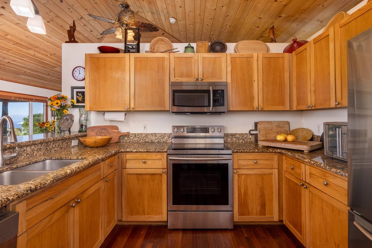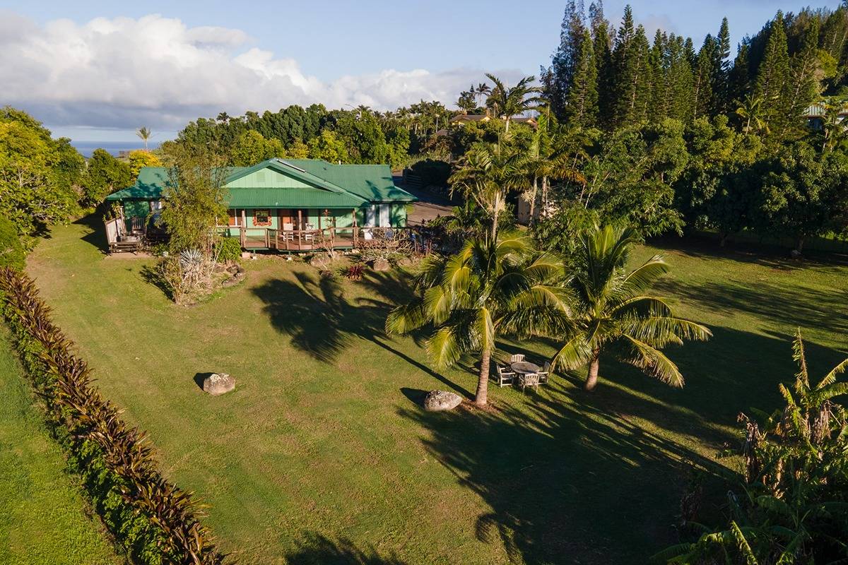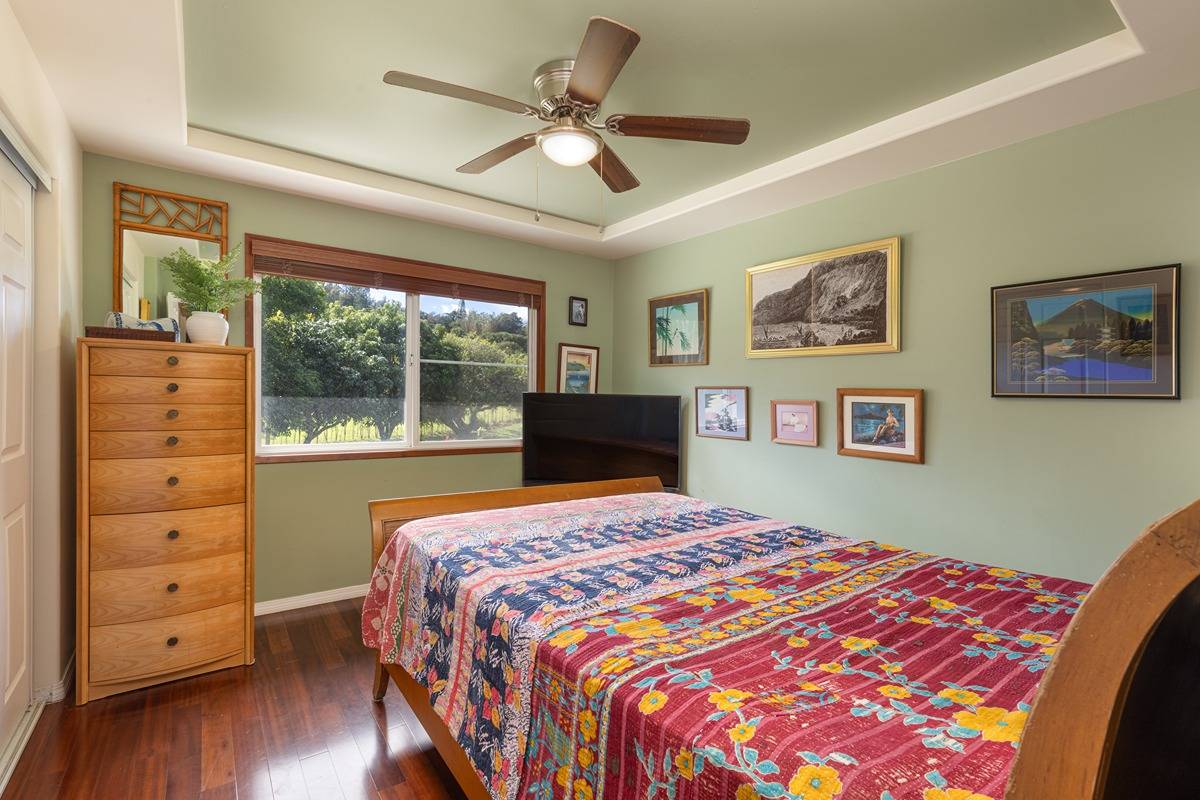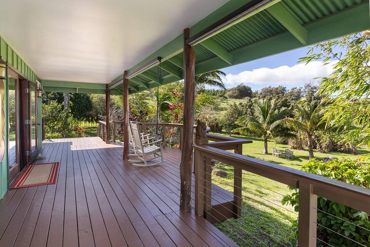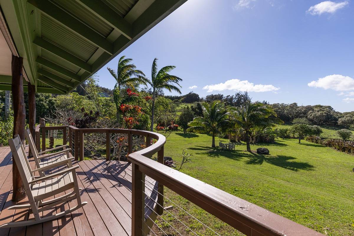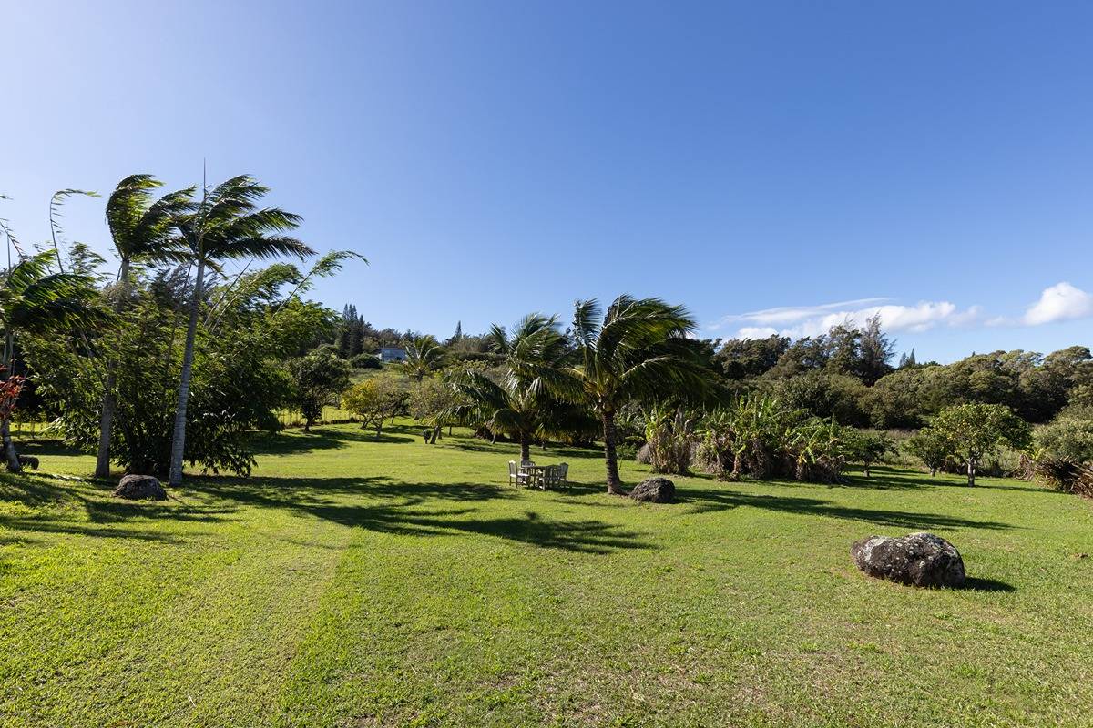 The views are over acres of pasture land, ocean and Maui views, not to mention overlooking your own lovely orchard.