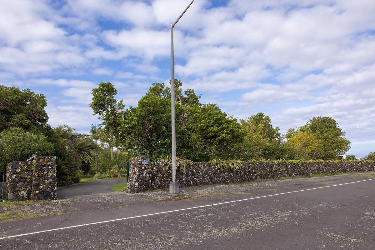 The gated and fully fenced property has a beautiful moss rock wall along the front property line, as well as established trees which help protect the property from prevailing winds.
