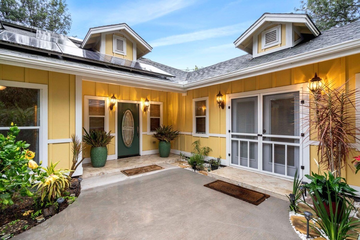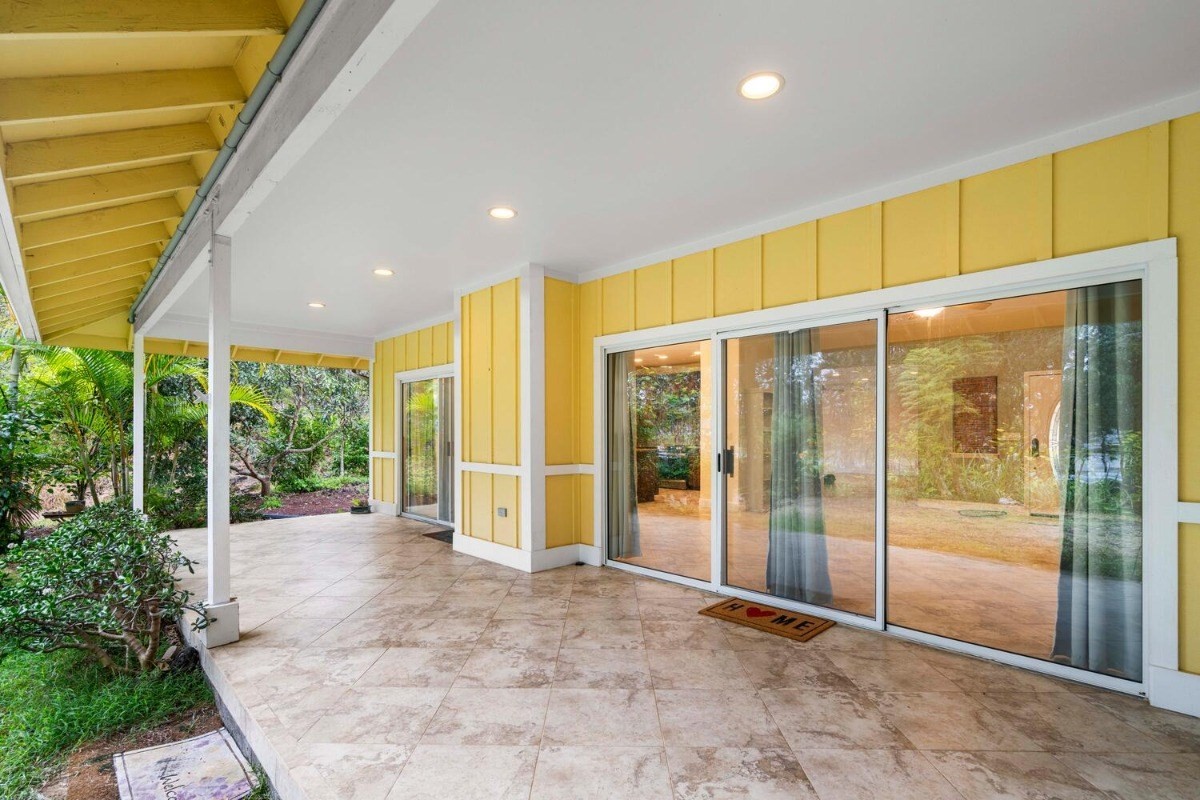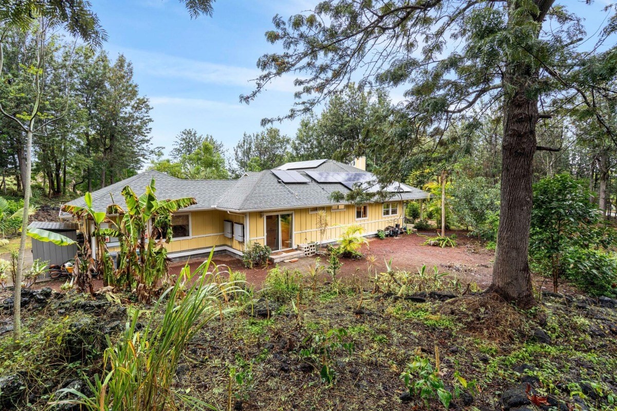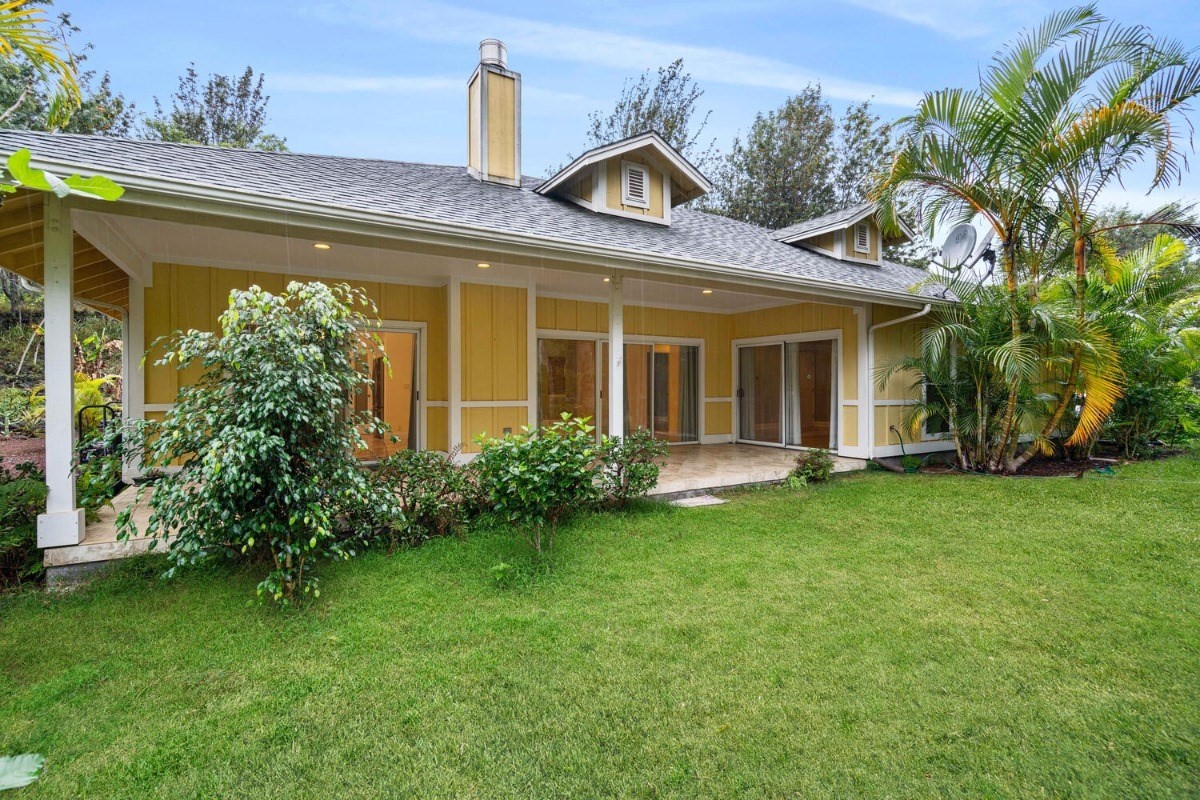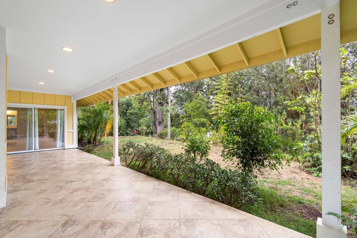 the kitchen and living room areas with a wood burning fireplace that says quality throughout. The Master Bedroom has bamboo flooring; walk in closet; and spa tub & walk in tile shower with peaceful ambiance. Surrounded by forest and touch of bamboo, this home sits in its own special environment. There are several kinds of Hybrid Hibiscus, poinsettias, areca palm trees, kona coffee trees, several citrus fruit trees, dragon fruit, breadfruit, producing avocados, papayas and more, this home invites more gardening-grow your own vegtables and more herbs!