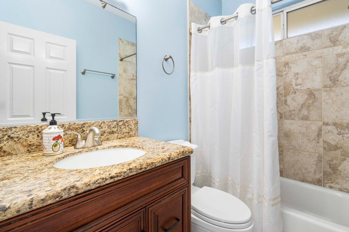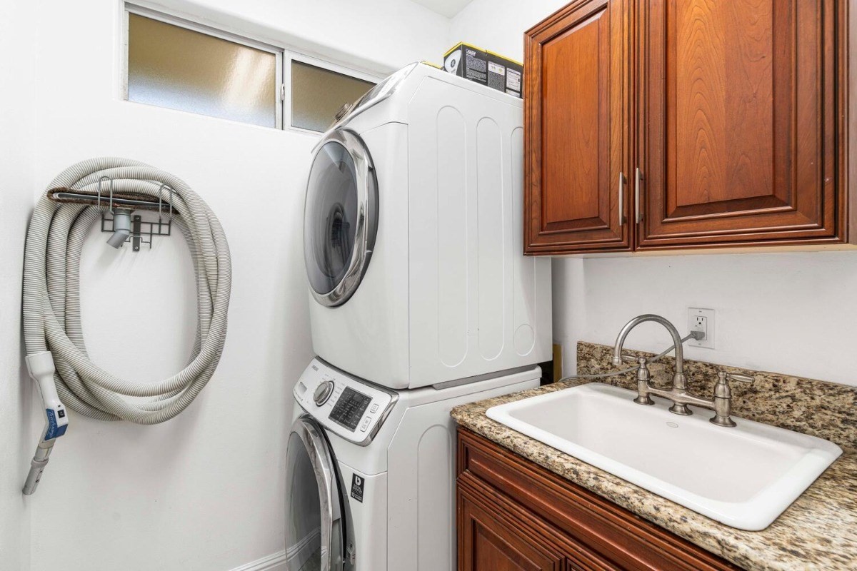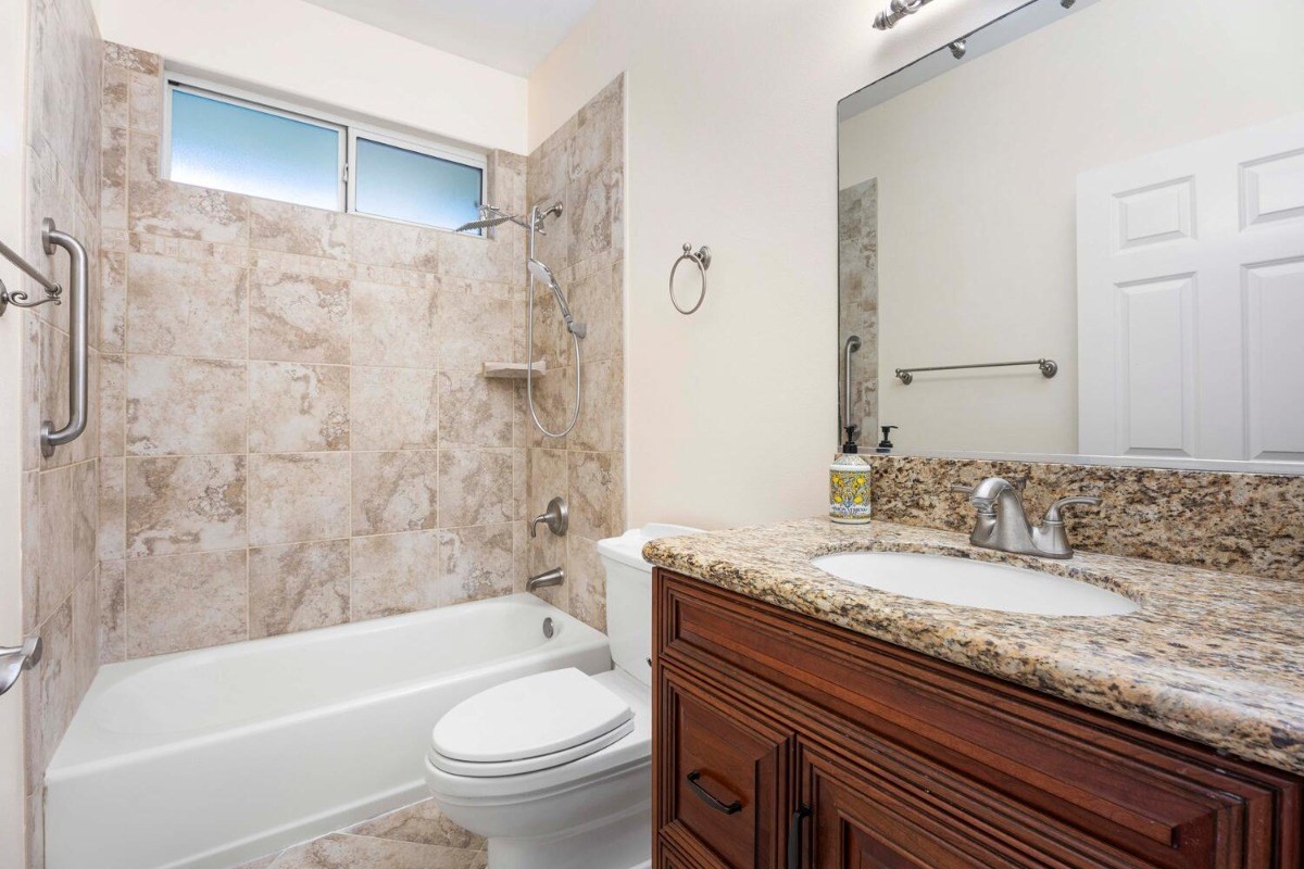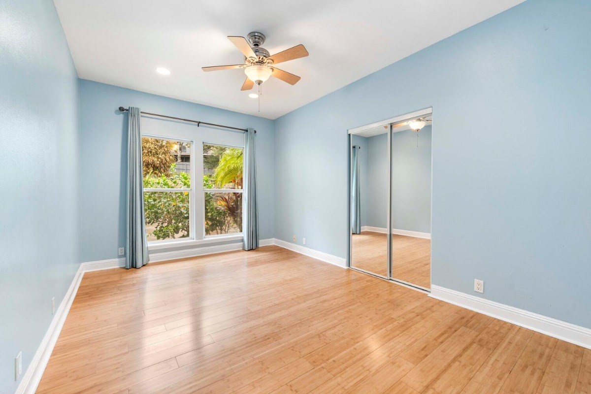 This lovely contemporary spacious & private home welcomes single floor living surrounded by Hawaiian Gardens. There are 3 bedrooms and 3 bathrooms, with a bonus "family room" area, that has its own double door entryway. Gorgeous cherry wood cabinetry with solid granite tops in the kitchen; polished travertine floors throughout