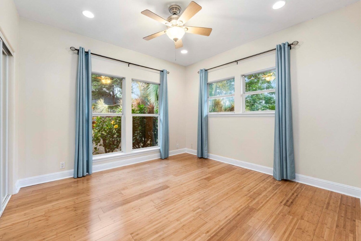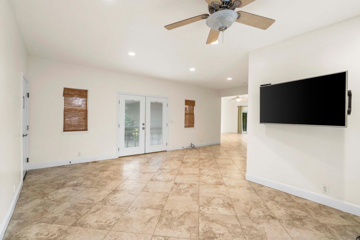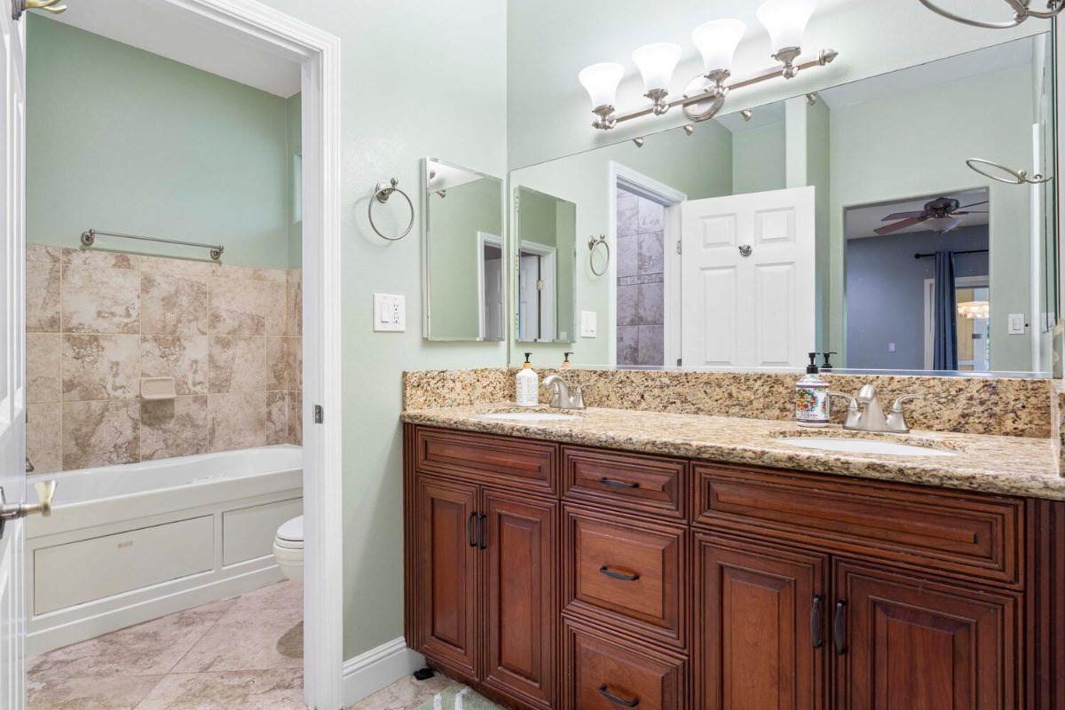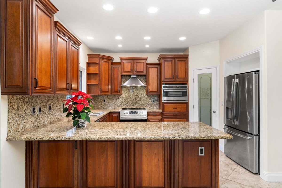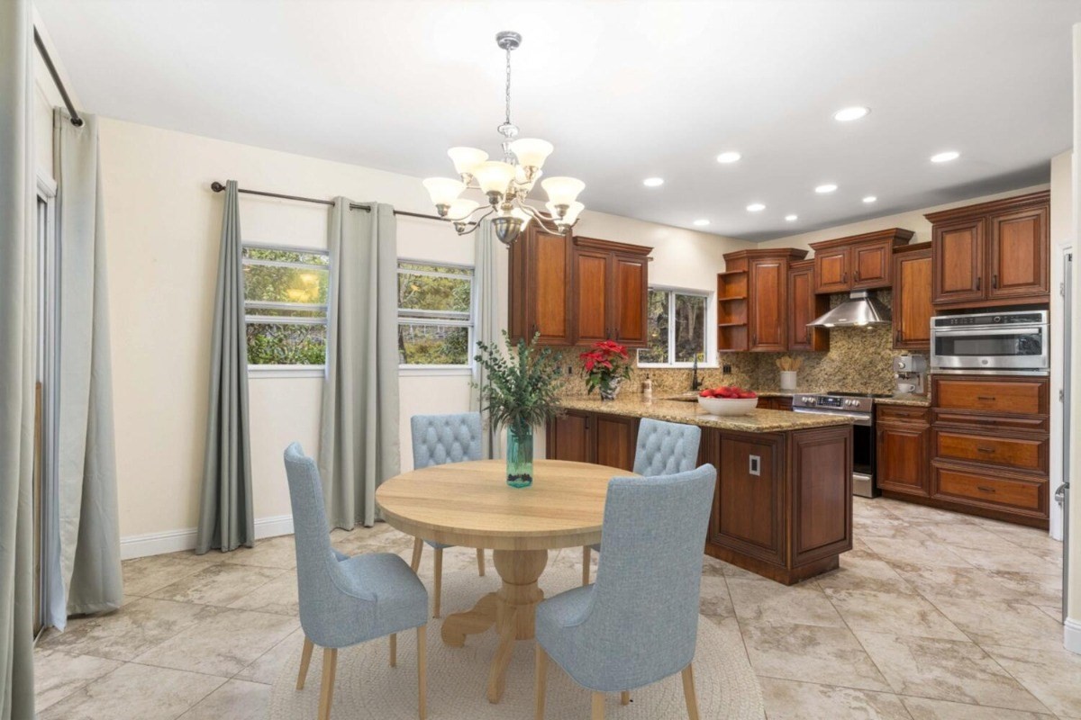 This lovely contemporary spacious & private home welcomes single floor living surrounded by Hawaiian Gardens. There are 3 bedrooms and 3 bathrooms, with a bonus "family room" area, that has its own double door entryway. Gorgeous cherry wood cabinetry with solid granite tops in the kitchen; polished travertine floors throughout