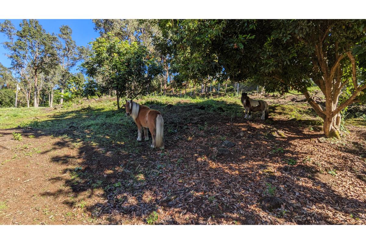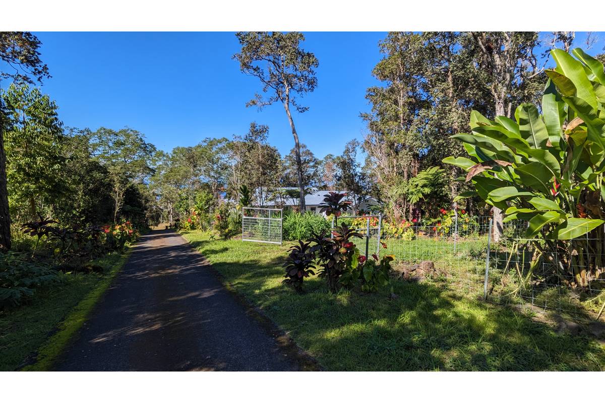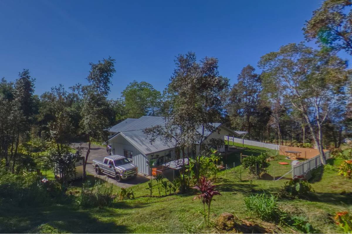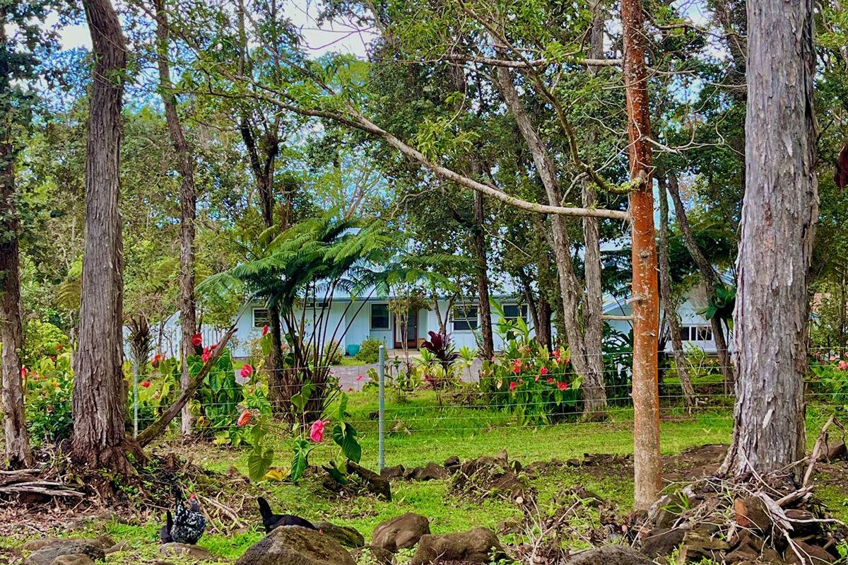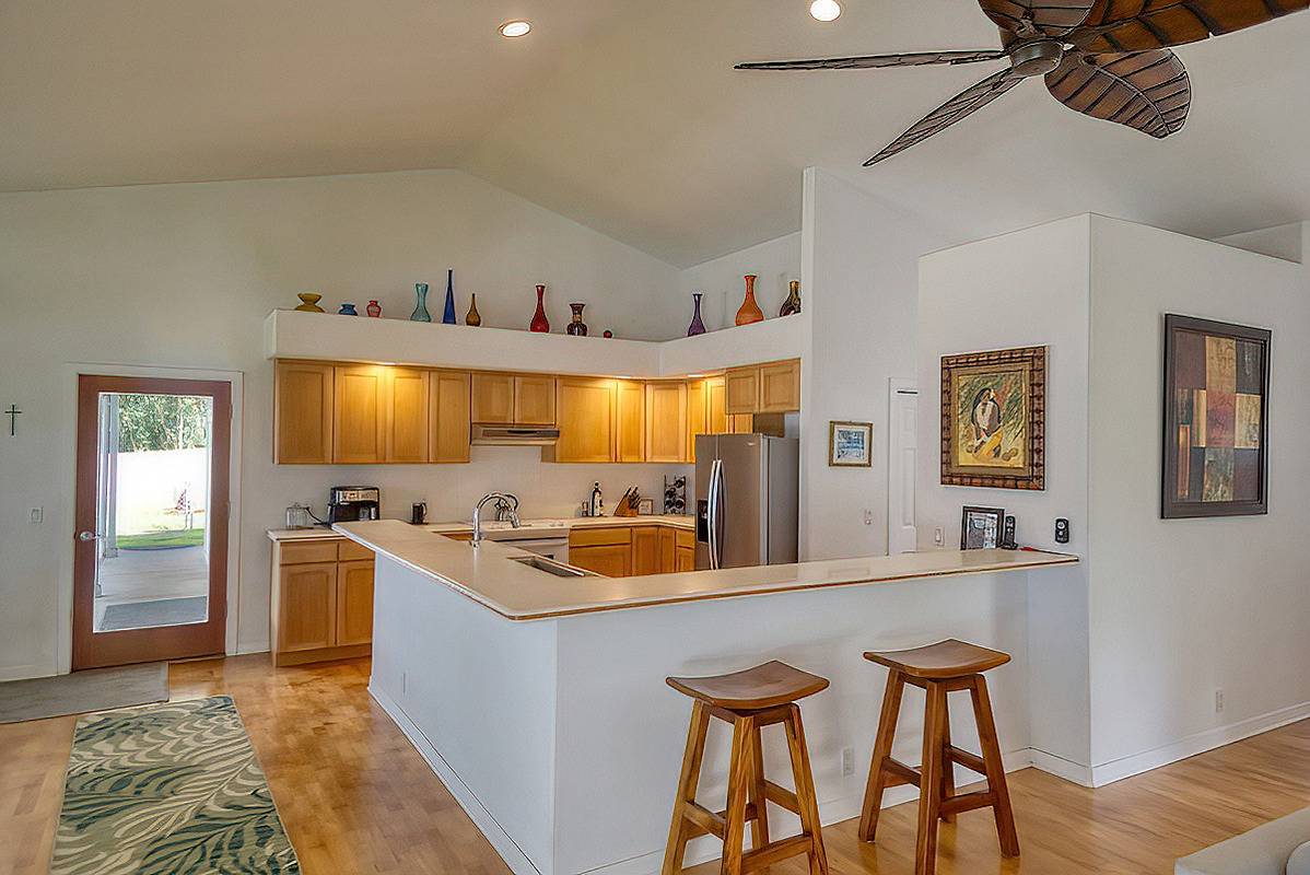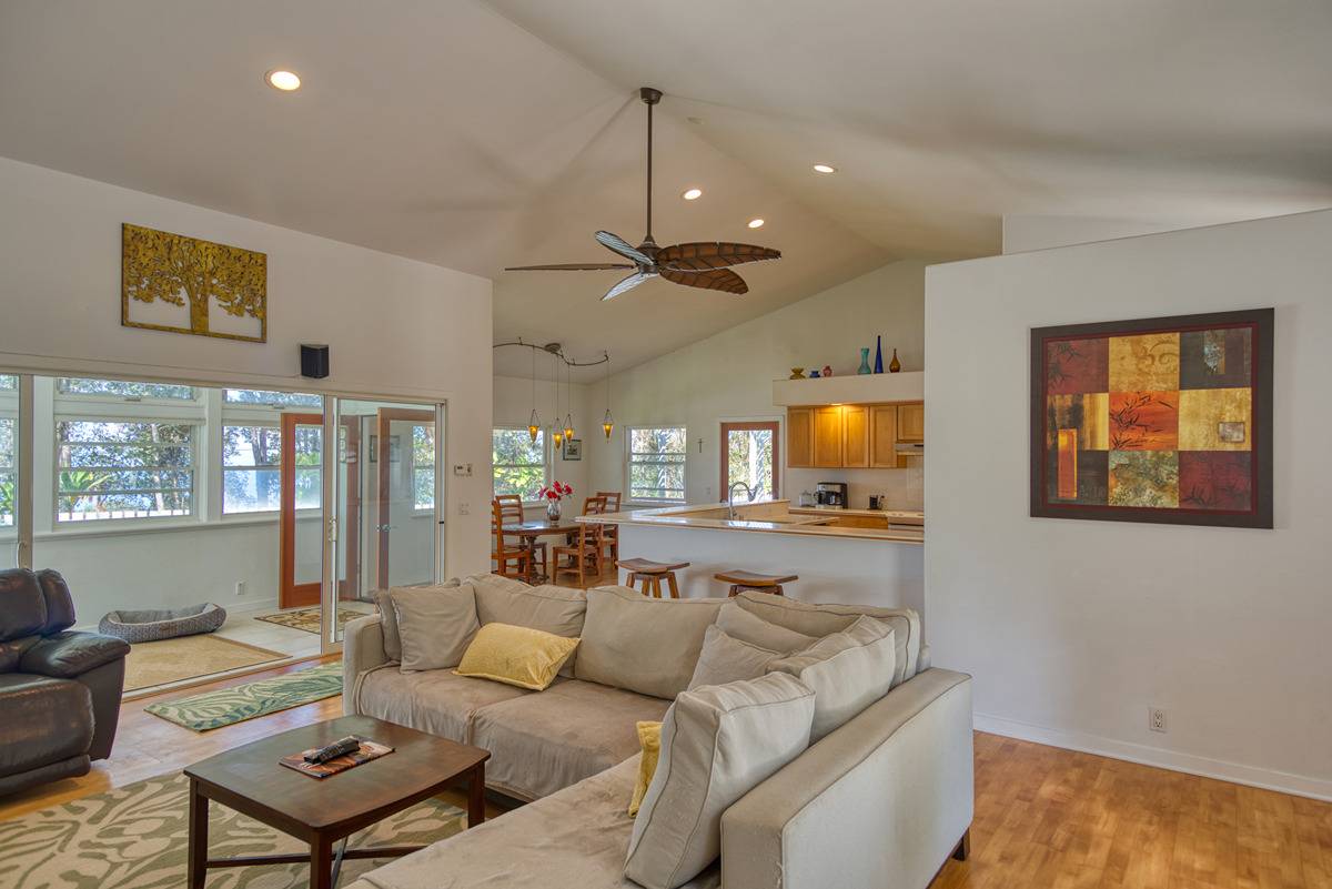 Nestled on the slopes of Hualalai, overlooking Kailua-Kona and only 15 minutes from town, custom-built home in the gated community of Hualalai Farms in Holualoa! Escape the heat of town where it is usually 10 degrees cooler with nice trade-wind breezes. Perfect temperatures mean you do not need air conditioning! 3 bedroom, 2 1/2 baths with large attached 2-car garage. Open concept great room with kitchen, dining room, living room and attached sunroom. The kitchen features ample space with maple cabinets, solid surface countertops, a breakfast bar and 2 large pantries. Maple flooring throughout the entire house. Outside has a large fenced in backyard with a large lanai for barbecuing and watching the sunsets. Most of the property is fenced, with a large paddock area of just over 1 acre of fully fenced in area for your dogs or livestock, and features a large custom built shelter for livestock as well as a large custom built chicken coop. Surrounded by indigenous rare koa and ohia trees, hapuu ferns, numerous flowers, a fruit producing avocado tree and citrus trees. Property is located at the back of the subdivision for extra quiet and privacy. Come check this little slice of paradise!
