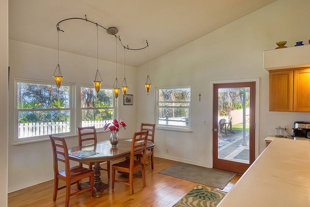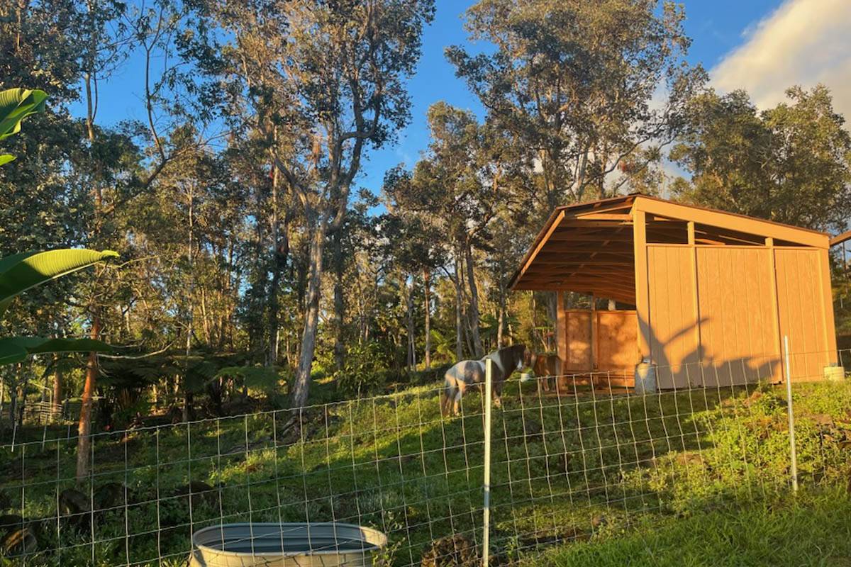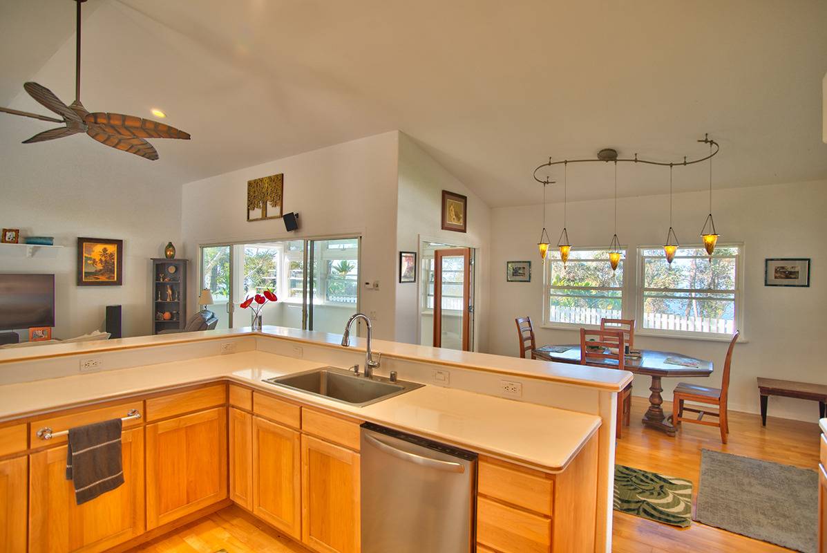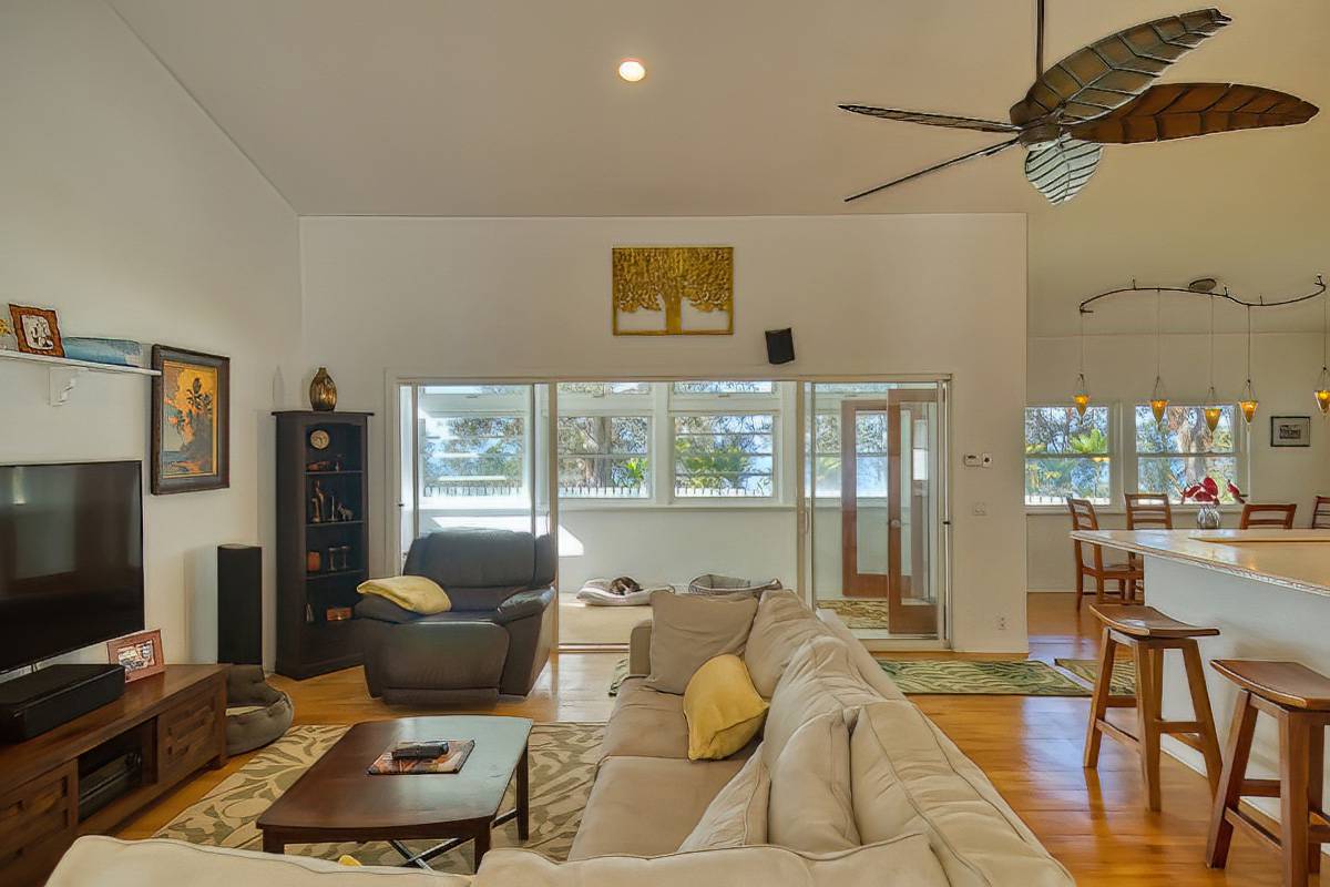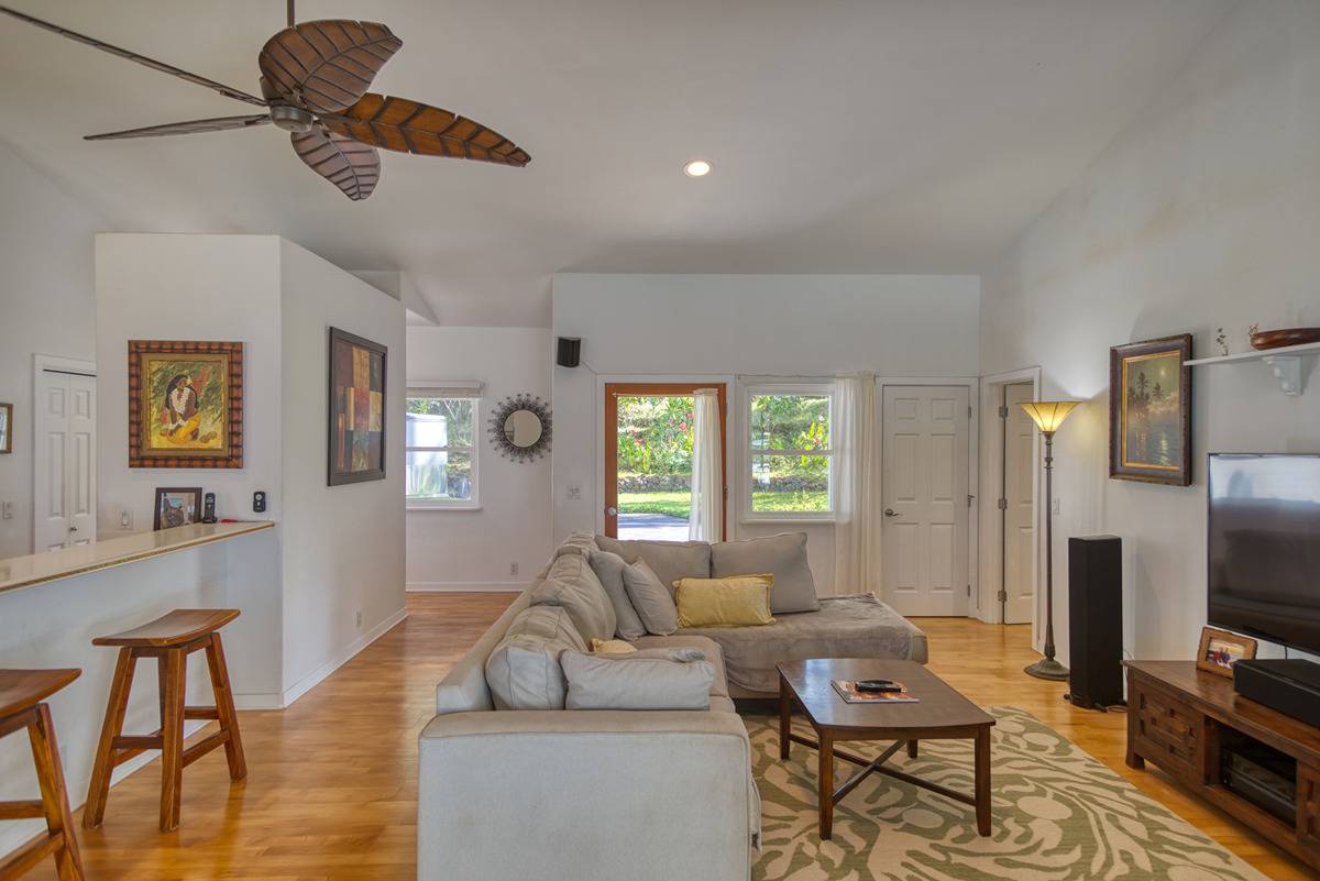 Nestled on the slopes of Hualalai, overlooking Kailua-Kona and only 15 minutes from town, custom-built home in the gated community of Hualalai Farms in Holualoa! Escape the heat of town where it is usually 10 degrees cooler with nice trade-wind breezes. Perfect temperatures mean you do not need air conditioning! 3 bedroom, 2 1/2 baths with large attached 2-car garage. Open concept great room with kitchen, dining room, living room and attached sunroom. The kitchen features ample space with maple cabinets, solid surface countertops, a breakfast bar and 2 large pantries. Maple flooring throughout the entire house. Outside has a large fenced in backyard with a large lanai for barbecuing and watching the sunsets. Most of the property is fenced, with a large paddock area of just over 1 acre of fully fenced in area for your dogs or livestock, and features a large custom built shelter for livestock as well as a large custom built chicken coop. Surrounded by indigenous rare koa and ohia trees, hapuu ferns, numerous flowers, a fruit producing avocado tree and citrus trees. Property is located at the back of the subdivision for extra quiet and privacy. Come check this little slice of paradise!