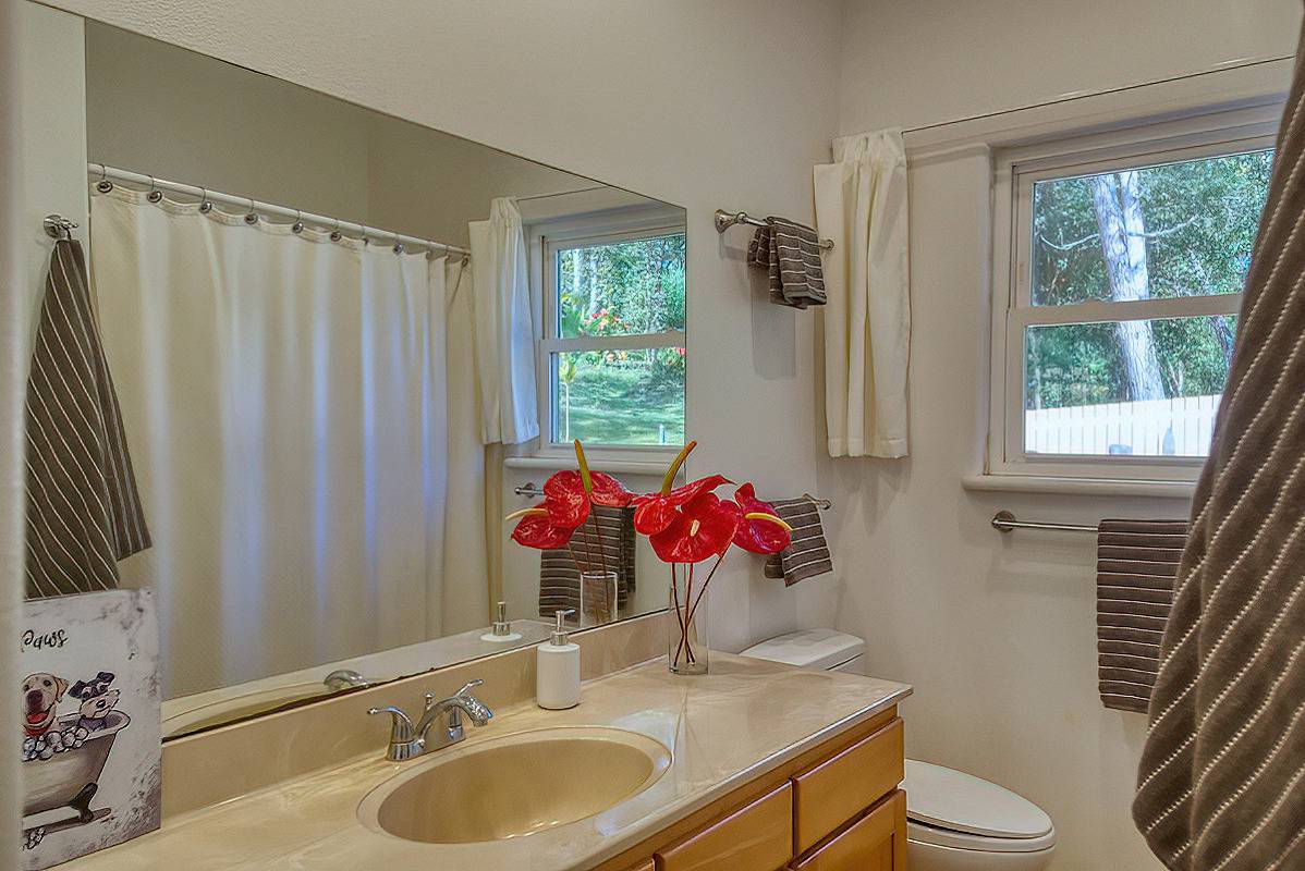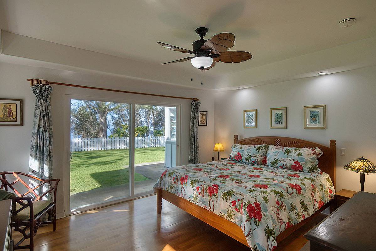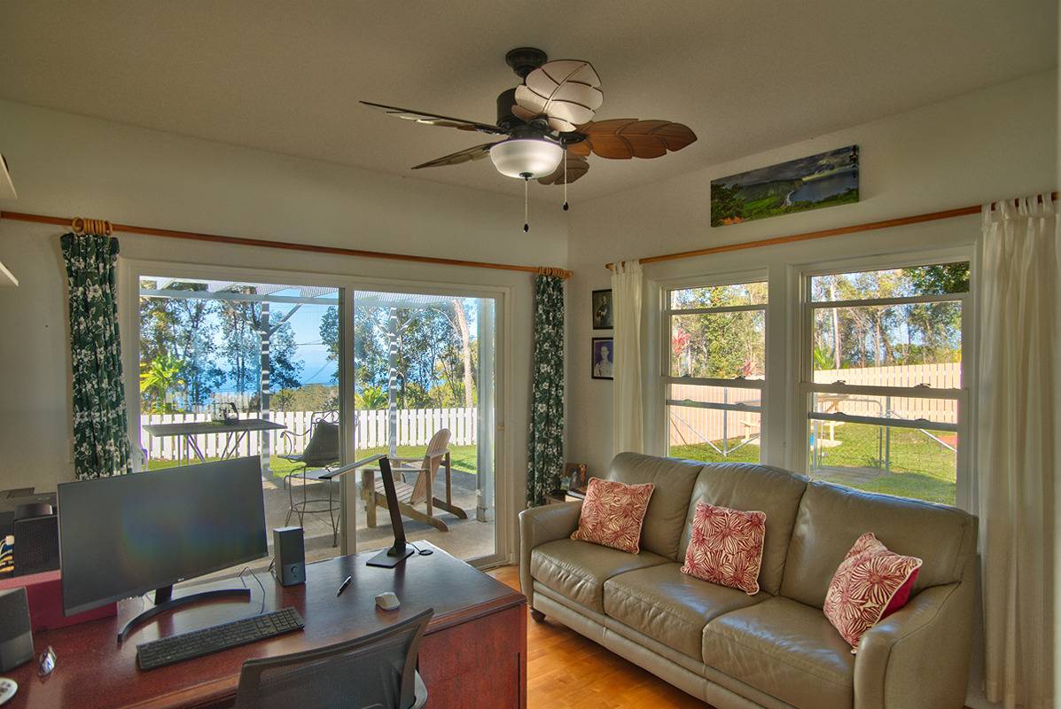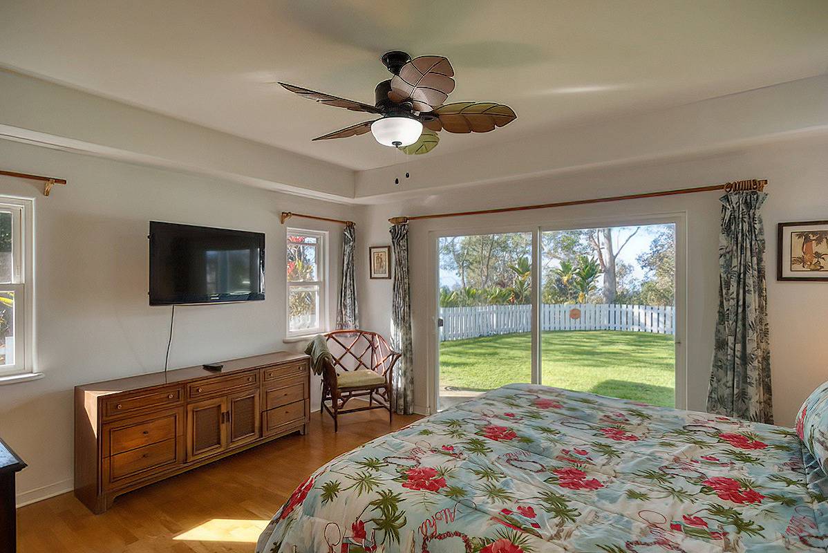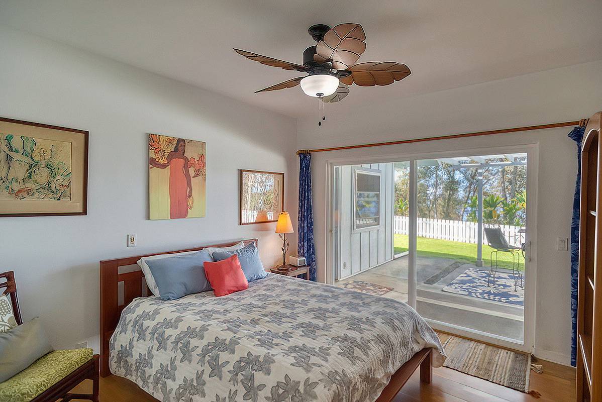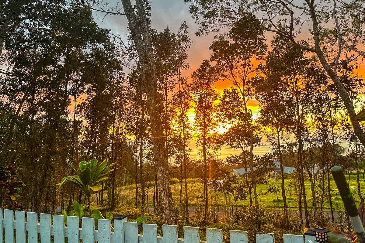 Nestled on the slopes of Hualalai, overlooking Kailua-Kona and only 15 minutes from town, custom-built home in the gated community of Hualalai Farms in Holualoa! Escape the heat of town where it is usually 10 degrees cooler with nice trade-wind breezes. Perfect temperatures mean you do not need air conditioning! 3 bedroom, 2 1/2 baths with large attached 2-car garage. Open concept great room with kitchen, dining room, living room and attached sunroom. The kitchen features ample space with maple cabinets, solid surface countertops, a breakfast bar and 2 large pantries. Maple flooring throughout the entire house. Outside has a large fenced in backyard with a large lanai for barbecuing and watching the sunsets. Most of the property is fenced, with a large paddock area of just over 1 acre of fully fenced in area for your dogs or livestock, and features a large custom built shelter for livestock as well as a large custom built chicken coop. Surrounded by indigenous rare koa and ohia trees, hapuu ferns, numerous flowers, a fruit producing avocado tree and citrus trees. Property is located at the back of the subdivision for extra quiet and privacy. Come check this little slice of paradise!
