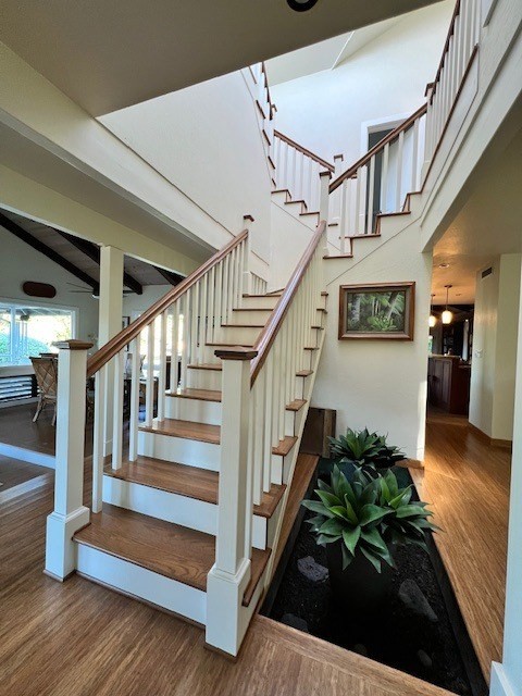 This gracious 4 bedrooms, 3 full baths & 2 half baths home is in Keopu Heights sub-division. It is a well-established community of custom designed homes, surrounded by beautiful trees and with a reputation as a safe, highly desirable neighborhood. This beautiful home is situated on a 1-acre parcel, fronting an open forested area, and pocket ocean views. The home features 2 separate living areas connected by a covered breezeway. The main living area features 4 bedrooms, 2 ½ baths, living and dining rooms, family room, kitchen and large lanai. The home features cathedral ceilings in the living and family rooms. A gas fireplace and Anderson Patio Doors are located in the family room. The spacious kitchen has cherry wood cabinets and granite countertops with Bosch and Frigidaire appliances. The second living area is also two story and includes an upstairs bedroom, bathroom and kitchenette. Downstairs is an office/bonus room, bath and threecar garage. The home features: 27 PV panels which are net metered, synthetic slate roof - 50 year life, central vacuum, solar hot water and hot tub. This well-maintained property will be a delight to call home.