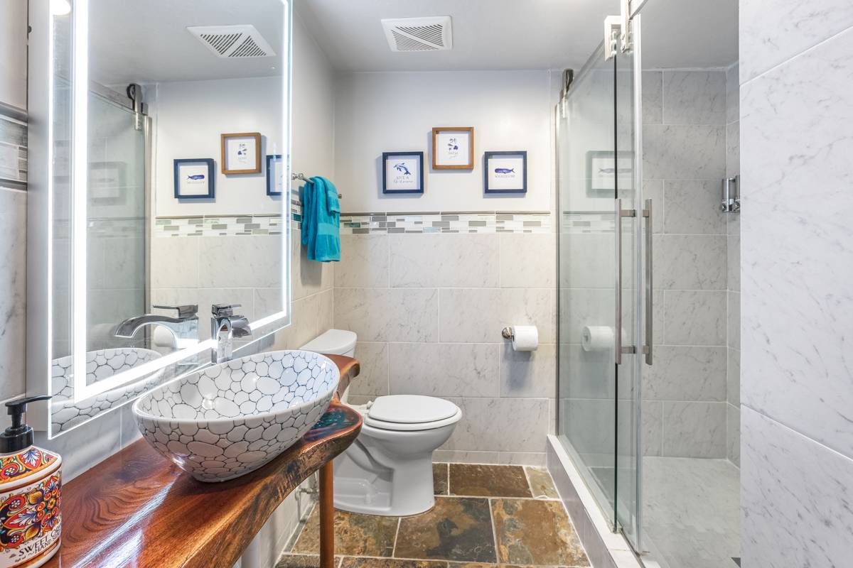 Guest suite has elegant bathroom with live-edge vanity & walk-in shower.