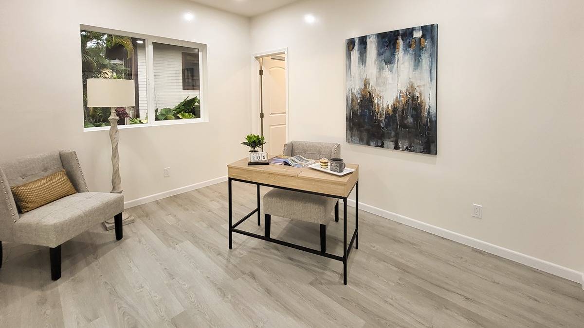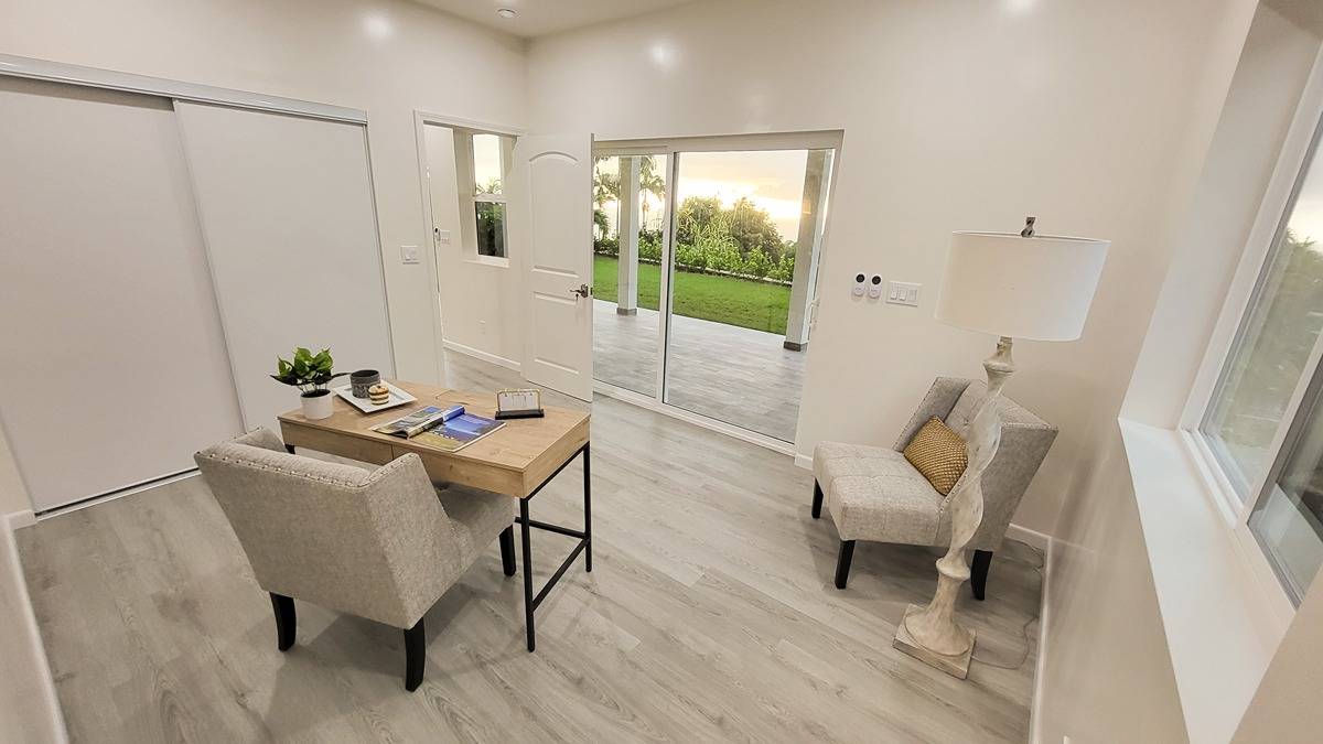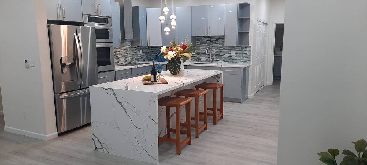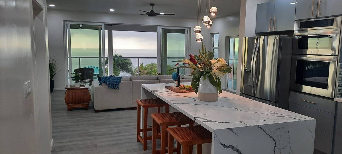 The heart of this home is the kitchen, a chef's dream featuring top-of-the-line LG appliances. The large island with waterfall sides, crafted from stunning quartz, not only provides ample prep space but also offers a seamless transition to the living area. From the kitchen and living spaces, your gaze extends to the expansive lanai, where the Pacific Ocean provides a mesmerizing backdrop for everyday living.