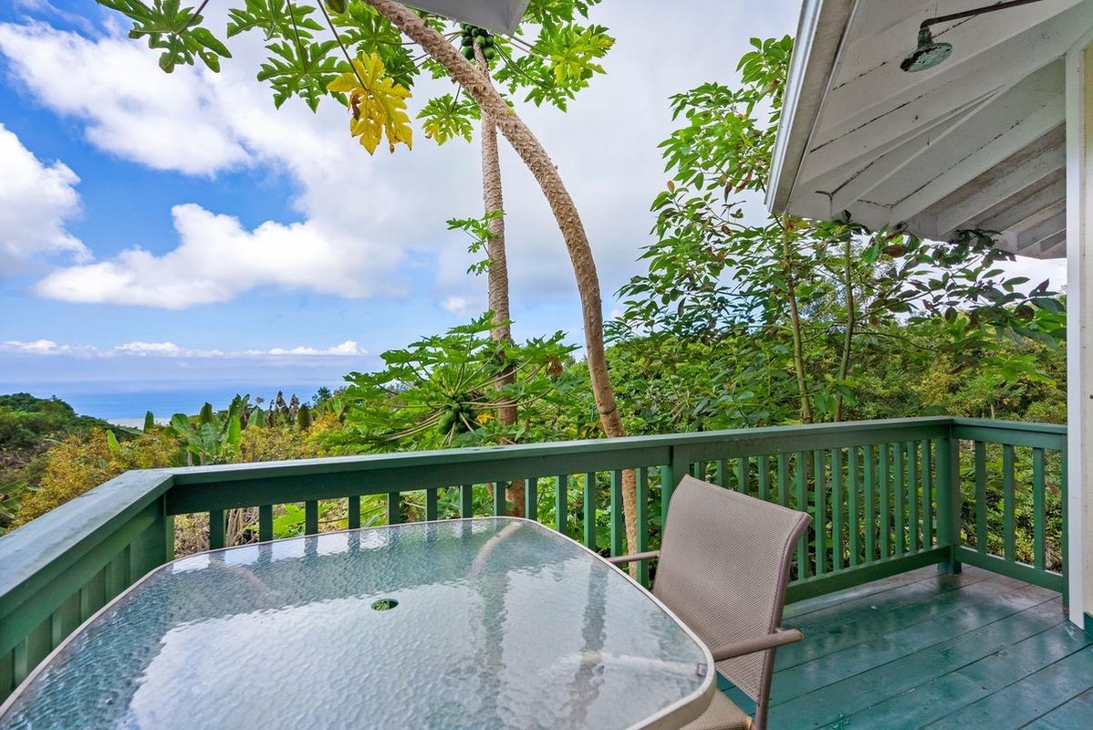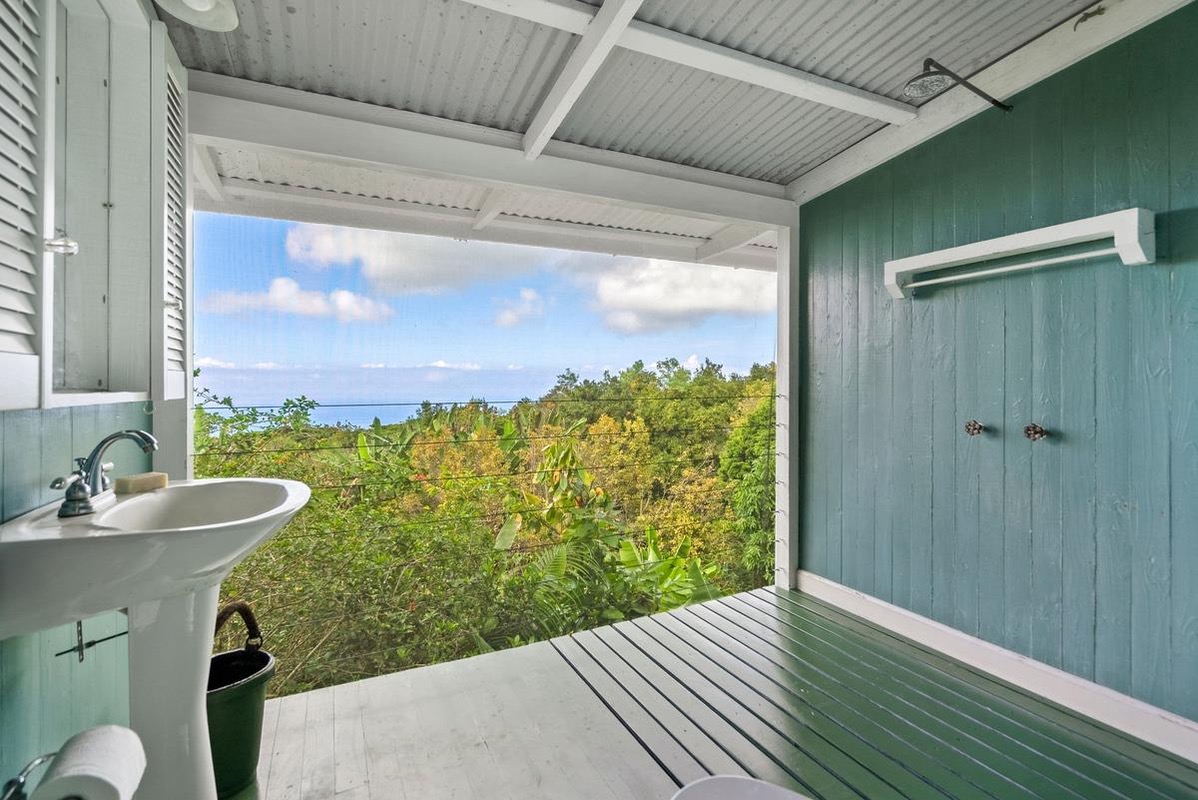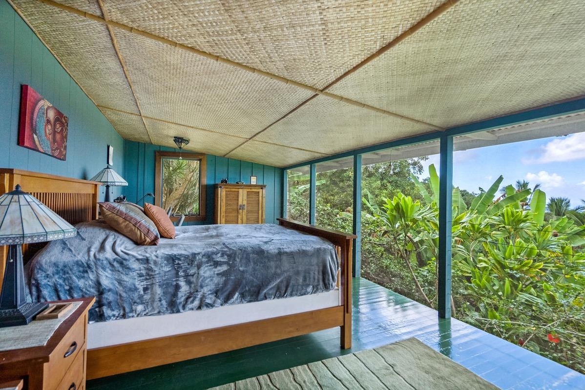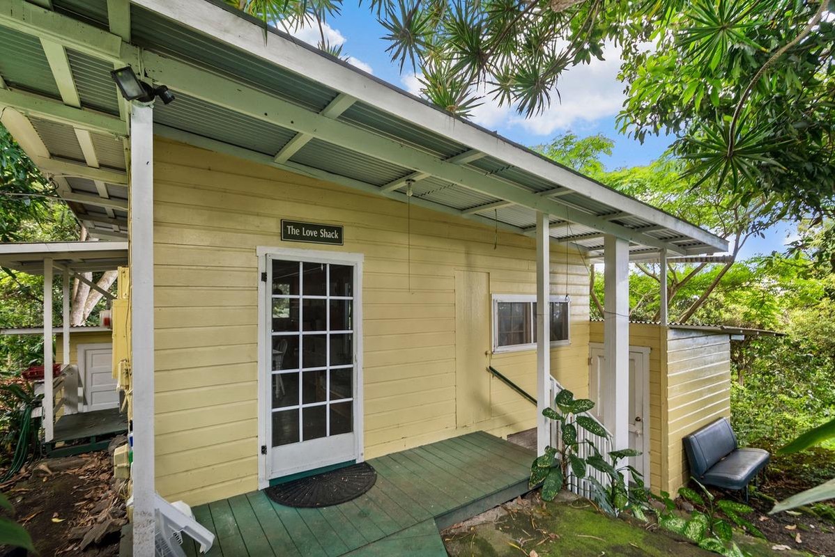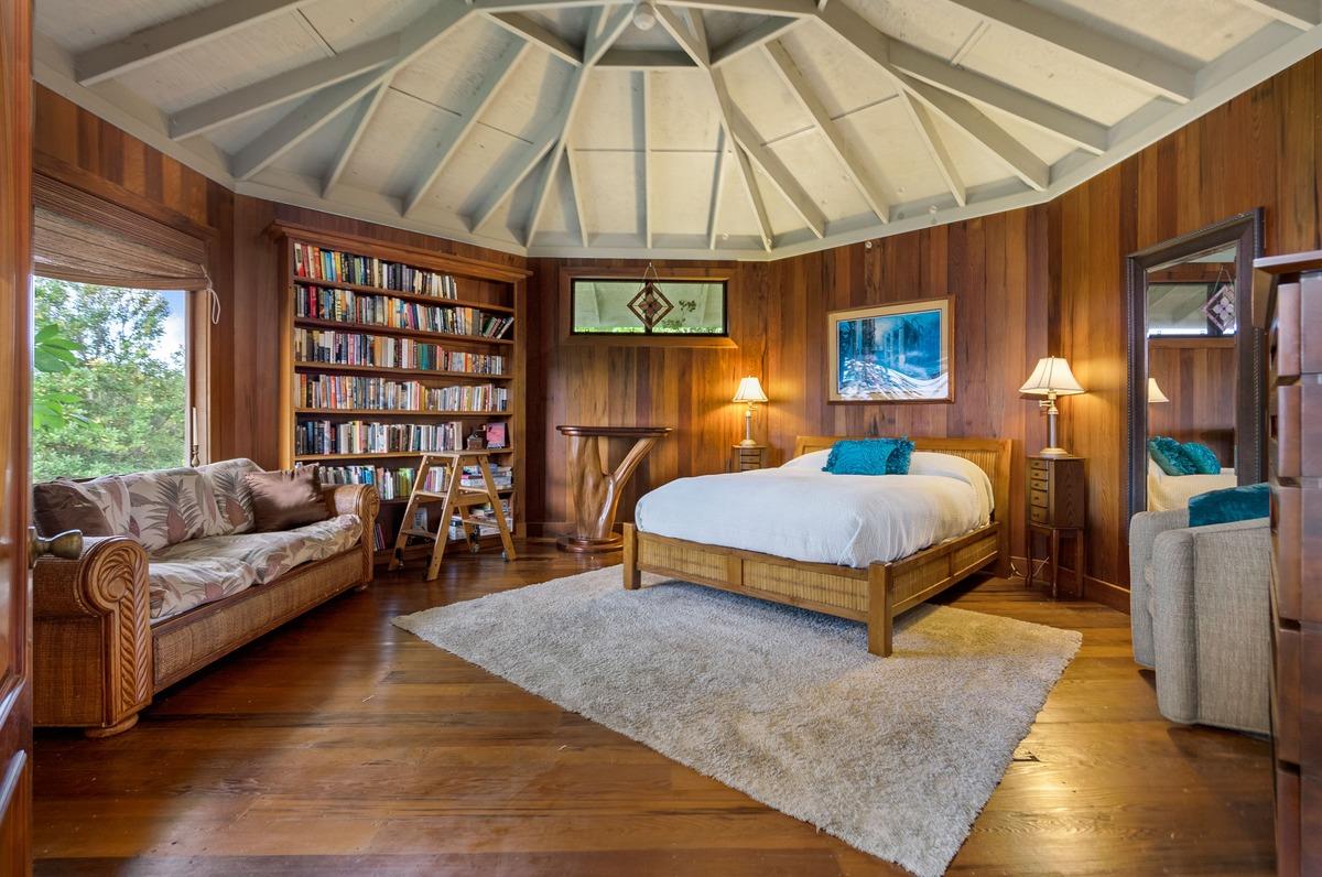 The main house features a large kitchen, expansive living and dining areas, 3 bedrooms, and 2 baths. Within the main house is a lovely guest suite with its own separate outside entrance. Including a full bath, kitchen with Koa cabinets and features a beautiful bedroom/library made from repurposed redwood from vintage catchment tanks . It also has an ocean-side lanai with an open air shower and fantastic ocean and sunset views.