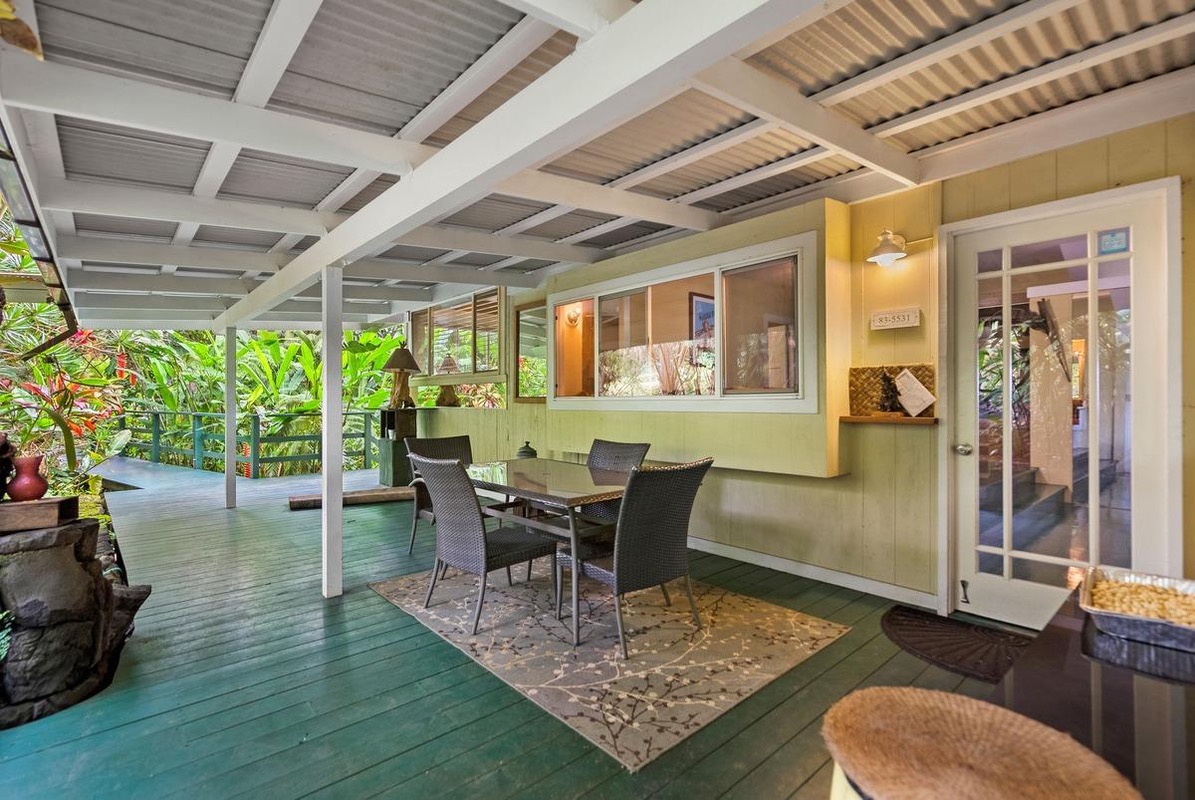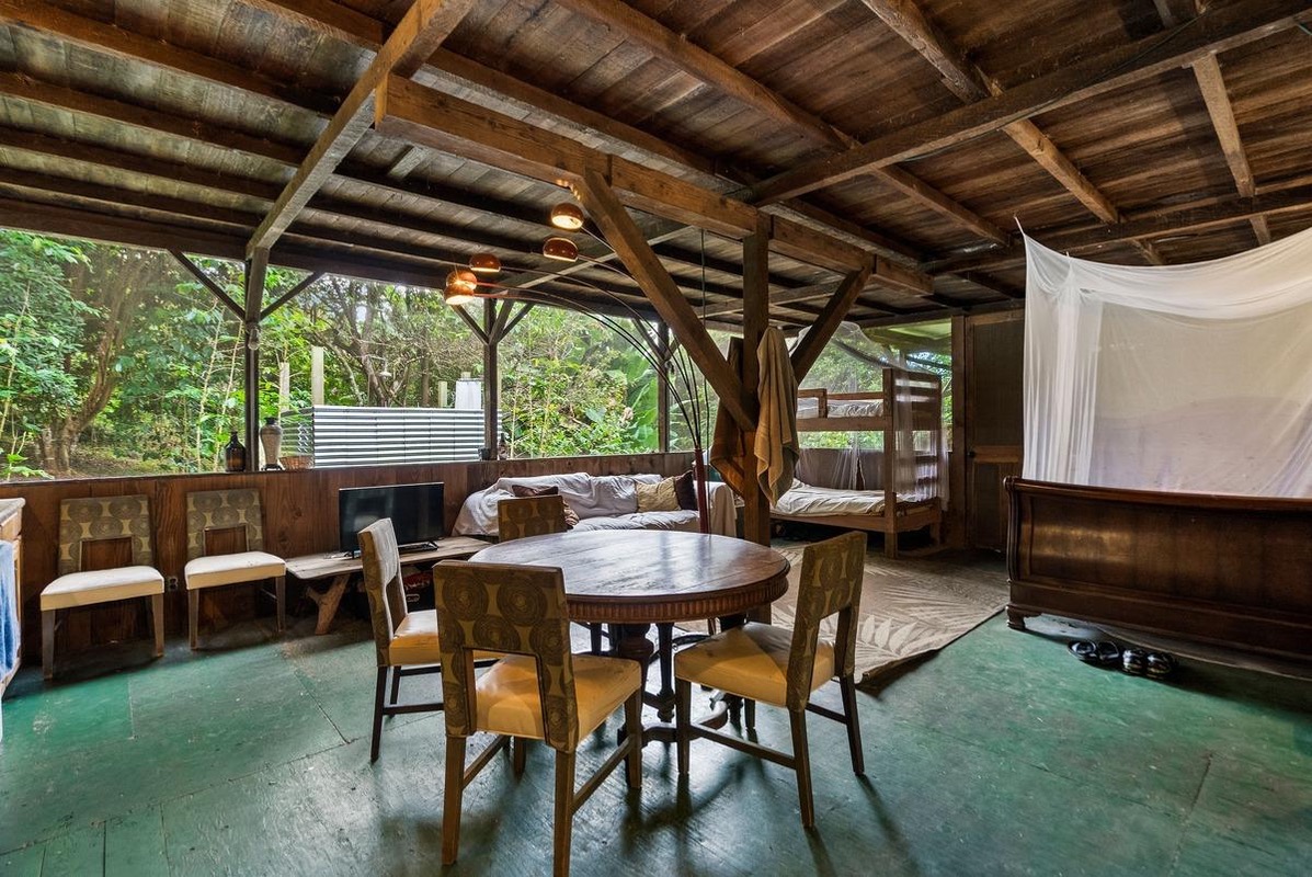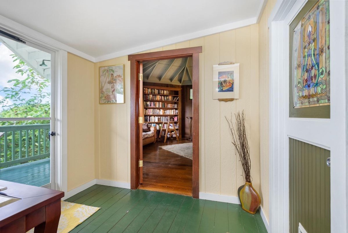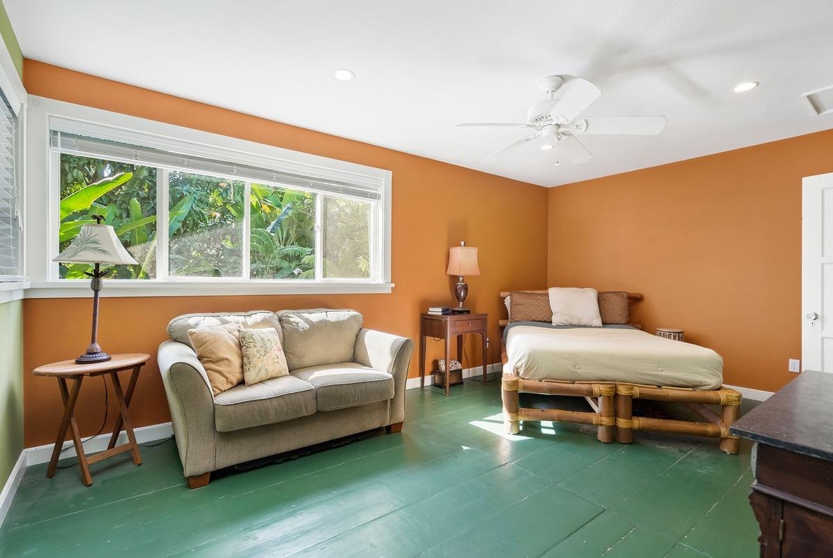 The main house features a large kitchen, expansive living and dining areas, 3 bedrooms, and 2 baths. Within the main house is a lovely guest suite with its own separate outside entrance. Including a full bath, kitchen with Koa cabinets and features a beautiful bedroom/library made from repurposed redwood from vintage catchment tanks . It also has an ocean-side lanai with an open air shower and fantastic ocean and sunset views.