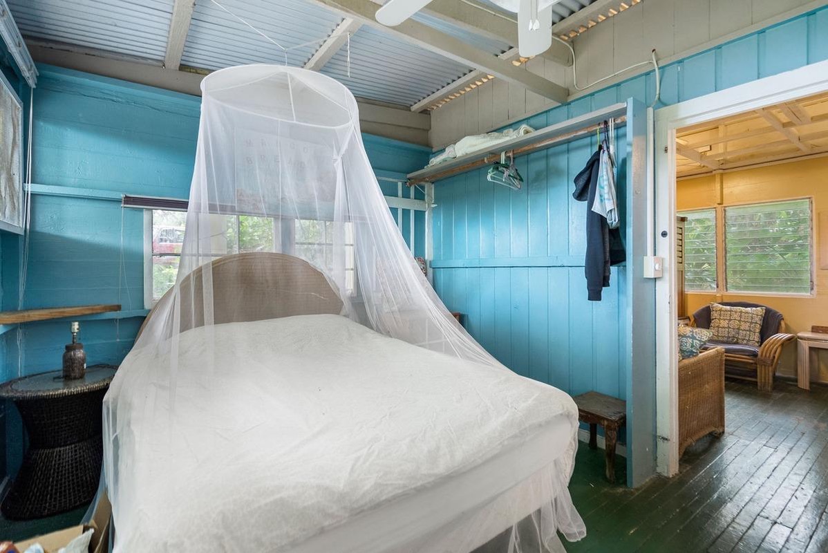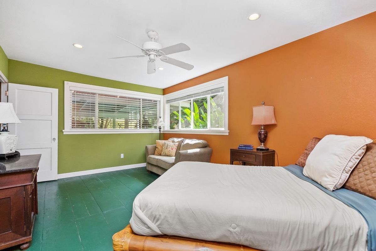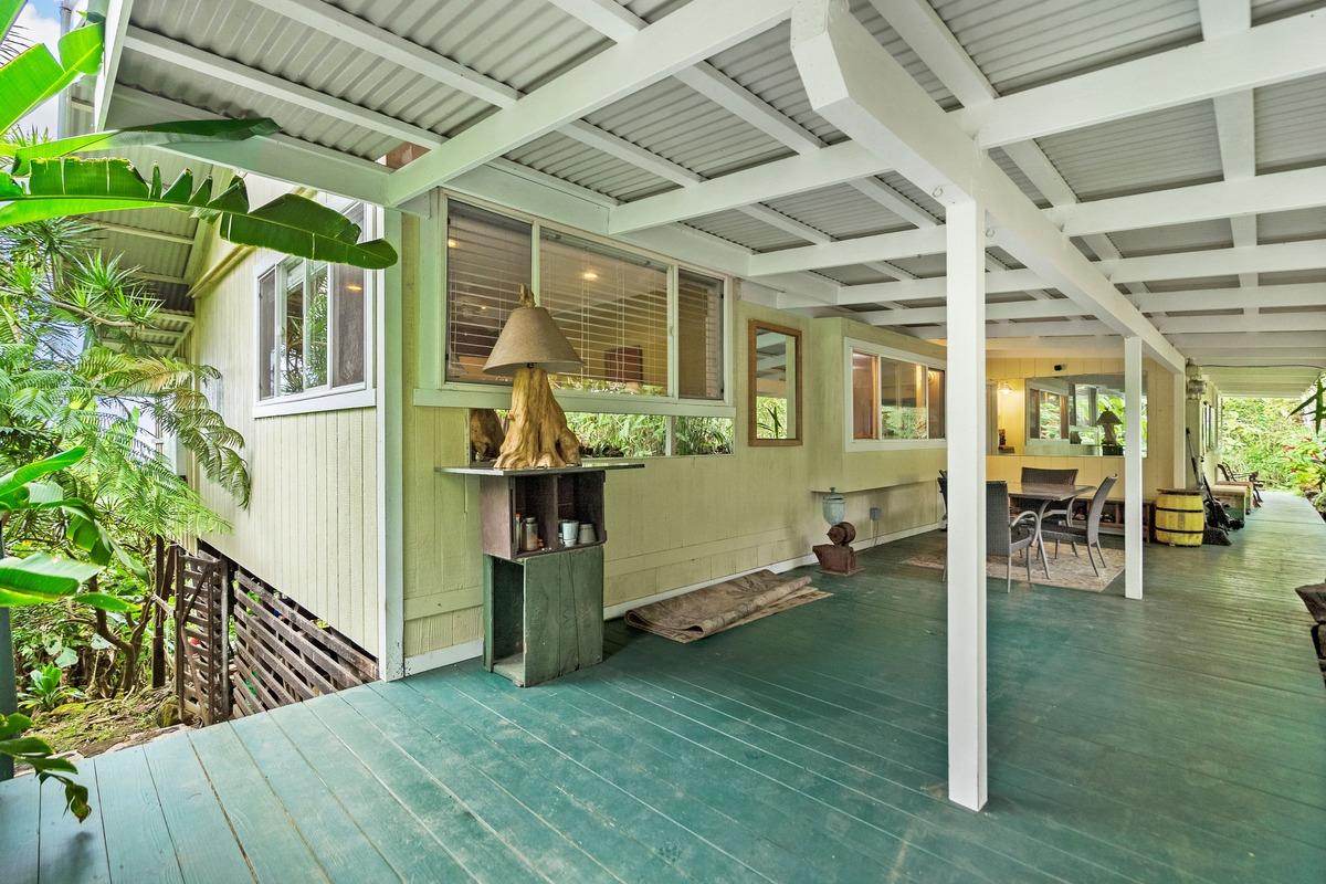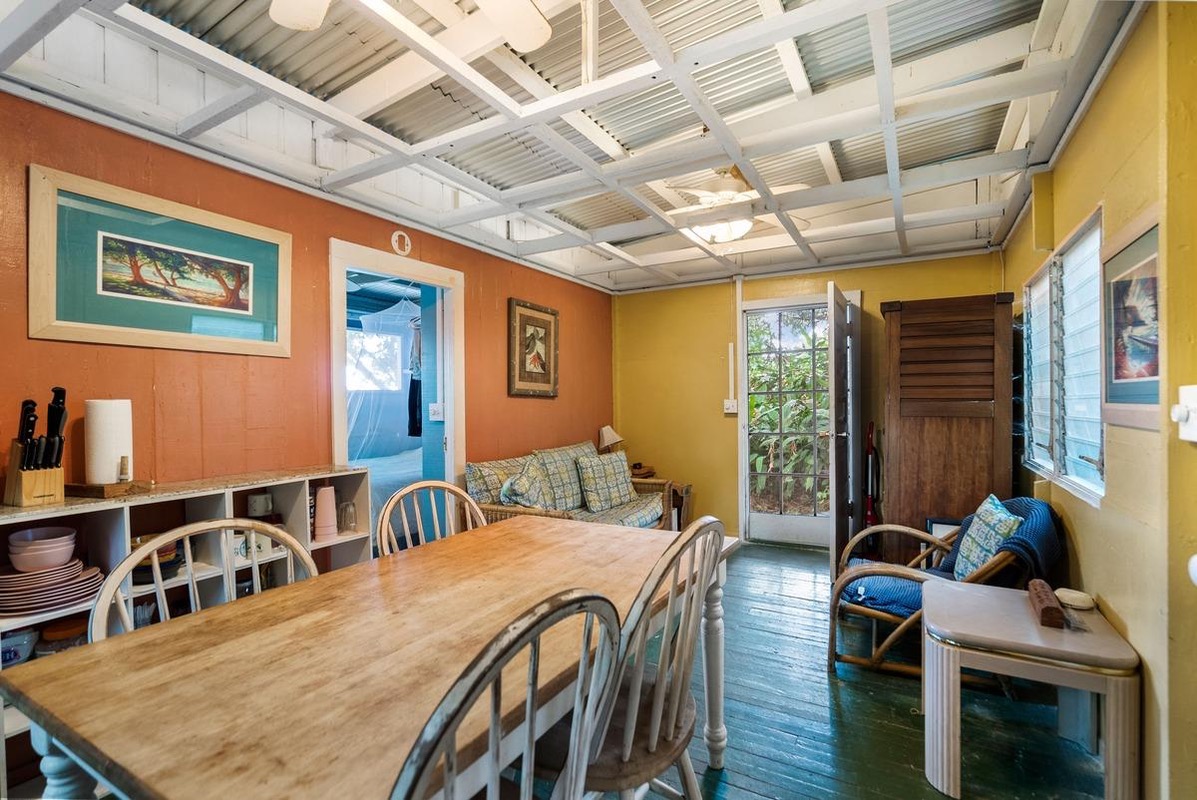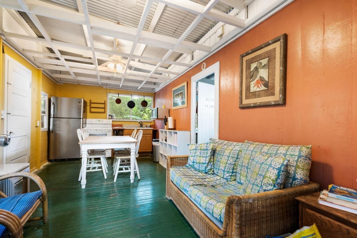 The main house features a large kitchen, expansive living and dining areas, 3 bedrooms, and 2 baths. Within the main house is a lovely guest suite with its own separate outside entrance. Including a full bath, kitchen with Koa cabinets and features a beautiful bedroom/library made from repurposed redwood from vintage catchment tanks . It also has an ocean-side lanai with an open air shower and fantastic ocean and sunset views.