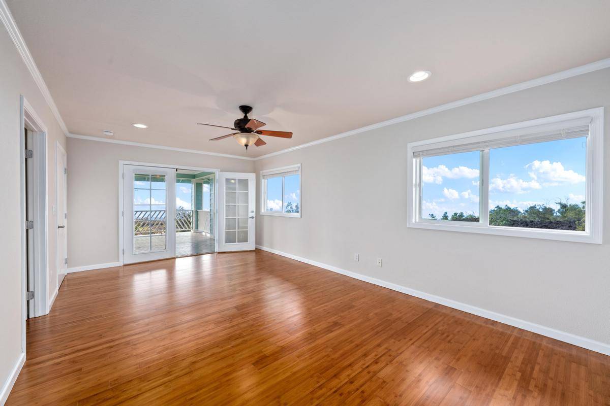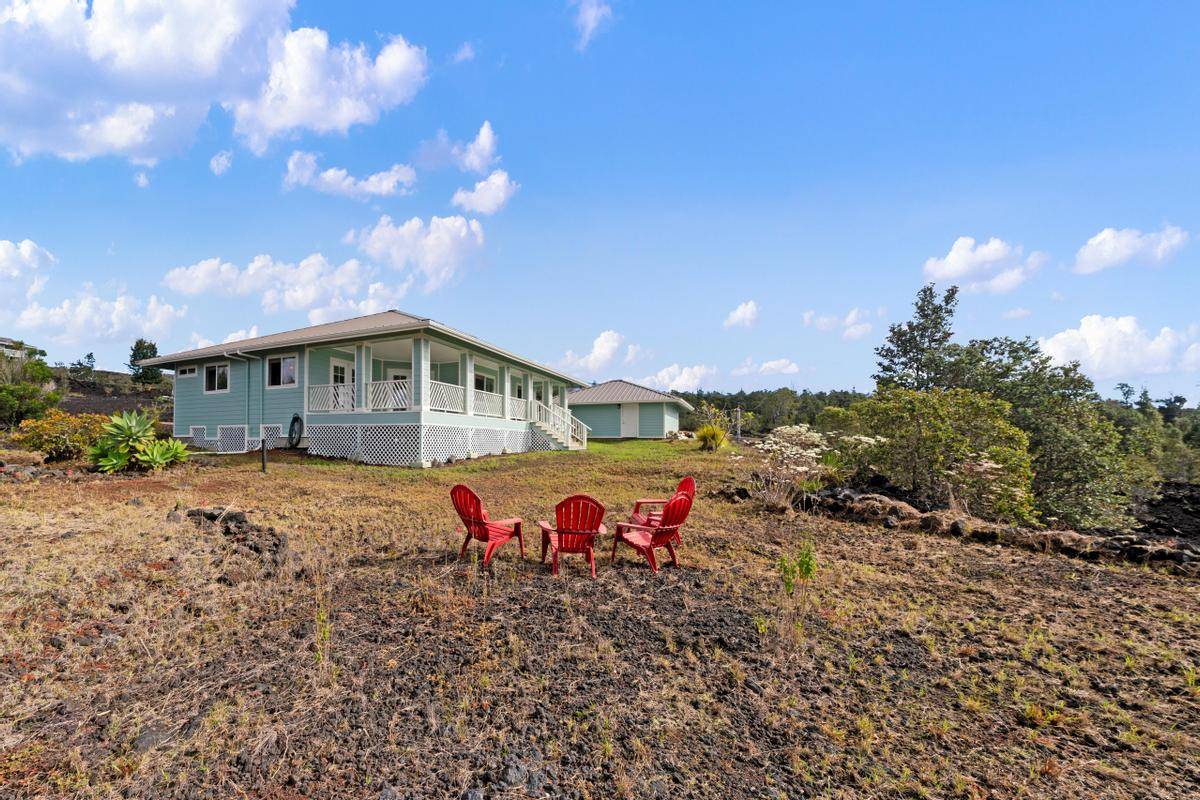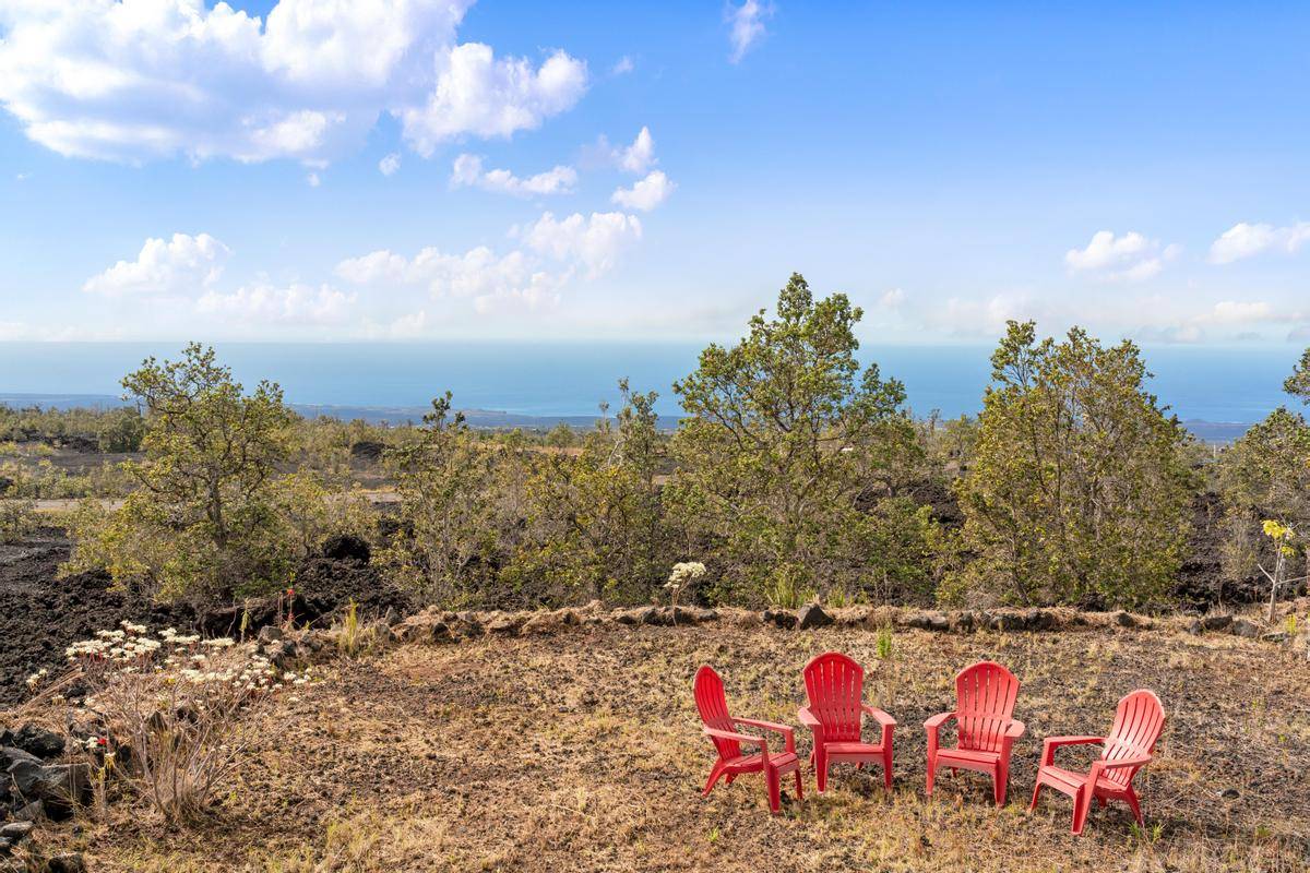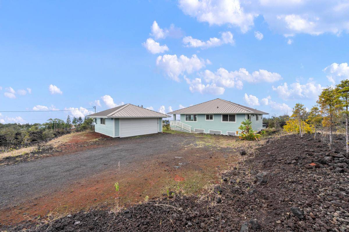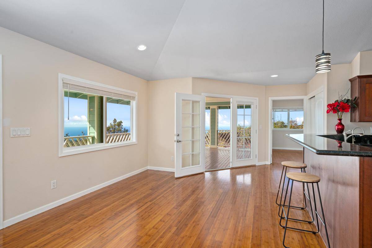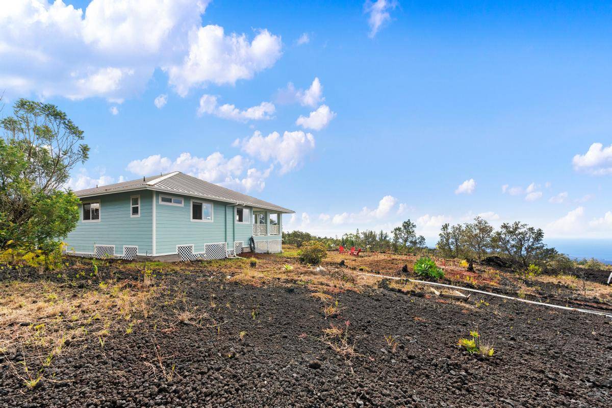 REDUCED!!! Gorgeous 3/2 with detached finished garage and vast ocean views. The home has vaulted ceilings, hardwood bamboo flooring throughout, custom cherry wood cabinetry with soft close in the kitchen, brand new stainless steel appliances, granite countertops, and is very spacious. Great open floor plan with the primary room being on one side of the home and the other 2 rooms on the other side. Gated with solar entry and a long set black driveway for better views. There are French doors leading to the lanai from the living room and the primary room. Bathrooms both have custom tiled tub surrounds and the primary en-suite has a large jetted tub and a walk-in closet. Located in the lower portion of HOVE on an acre of land, this home has been almost completely redone inside and out including new paint inside and out, new fixtures, brand new garage door and opener, solar gate at front, floors sanded and refinished, new appliances including washer and dryer, new catchment system, new blinds on the windows throughout, new lattice around bottom of home for a nice finished look and so much more. Move in ready with quality finishings. Come live your best Hawaii Life!