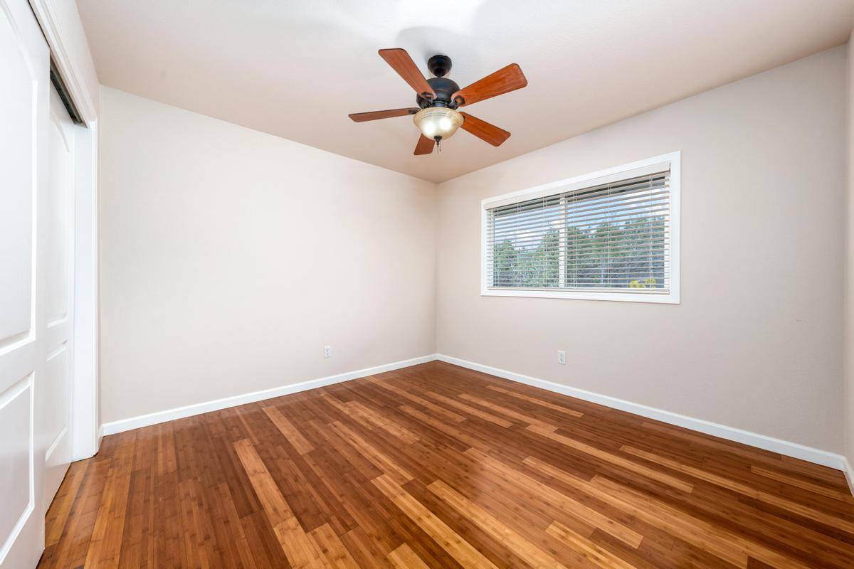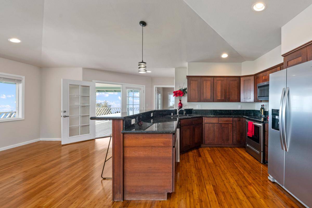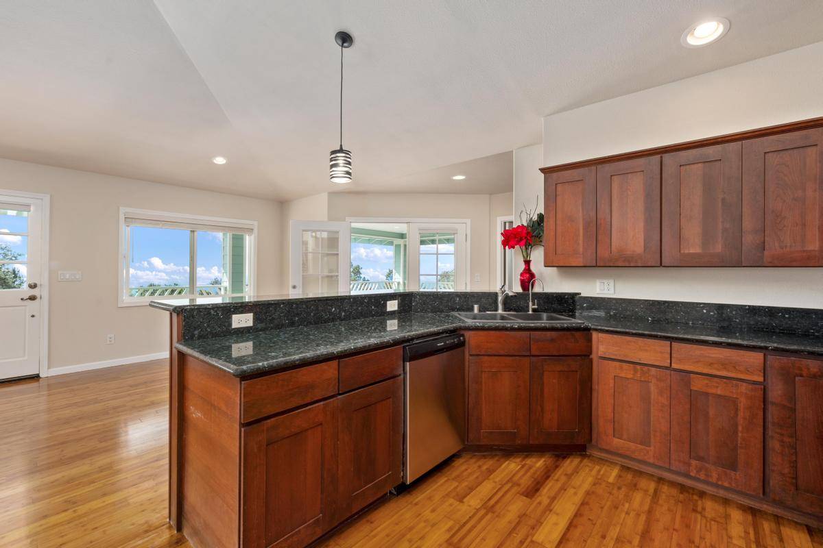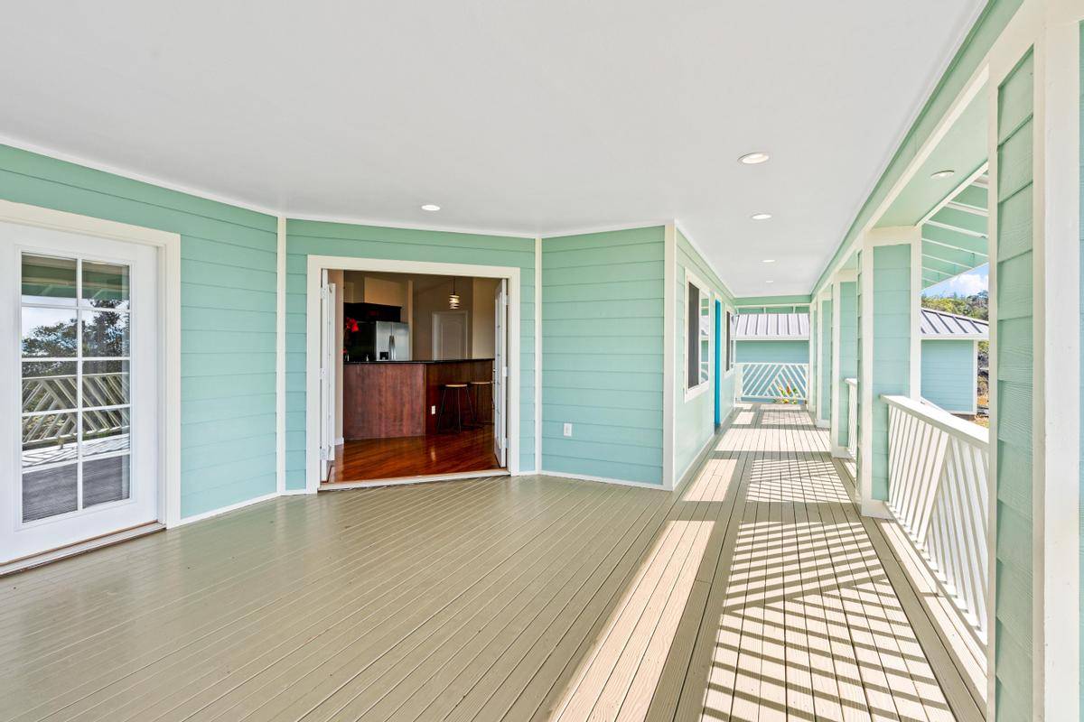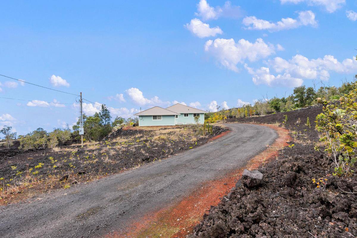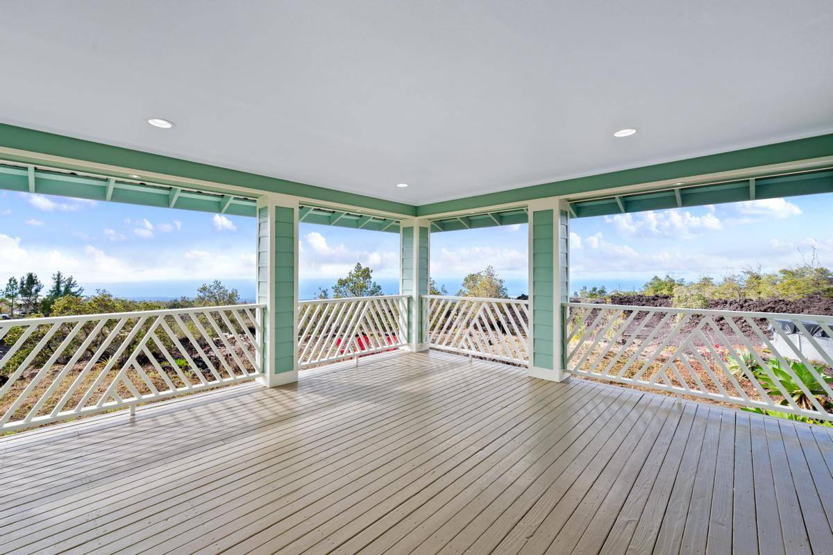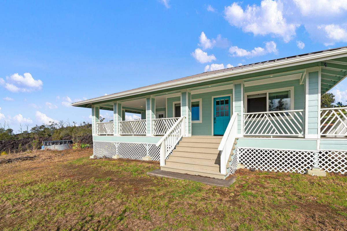 REDUCED!!! Gorgeous 3/2 with detached finished garage and vast ocean views. The home has vaulted ceilings, hardwood bamboo flooring throughout, custom cherry wood cabinetry with soft close in the kitchen, brand new stainless steel appliances, granite countertops, and is very spacious. Great open floor plan with the primary room being on one side of the home and the other 2 rooms on the other side. Gated with solar entry and a long set black driveway for better views. There are French doors leading to the lanai from the living room and the primary room. Bathrooms both have custom tiled tub surrounds and the primary en-suite has a large jetted tub and a walk-in closet. Located in the lower portion of HOVE on an acre of land, this home has been almost completely redone inside and out including new paint inside and out, new fixtures, brand new garage door and opener, solar gate at front, floors sanded and refinished, new appliances including washer and dryer, new catchment system, new blinds on the windows throughout, new lattice around bottom of home for a nice finished look and so much more. Move in ready with quality finishings. Come live your best Hawaii Life!