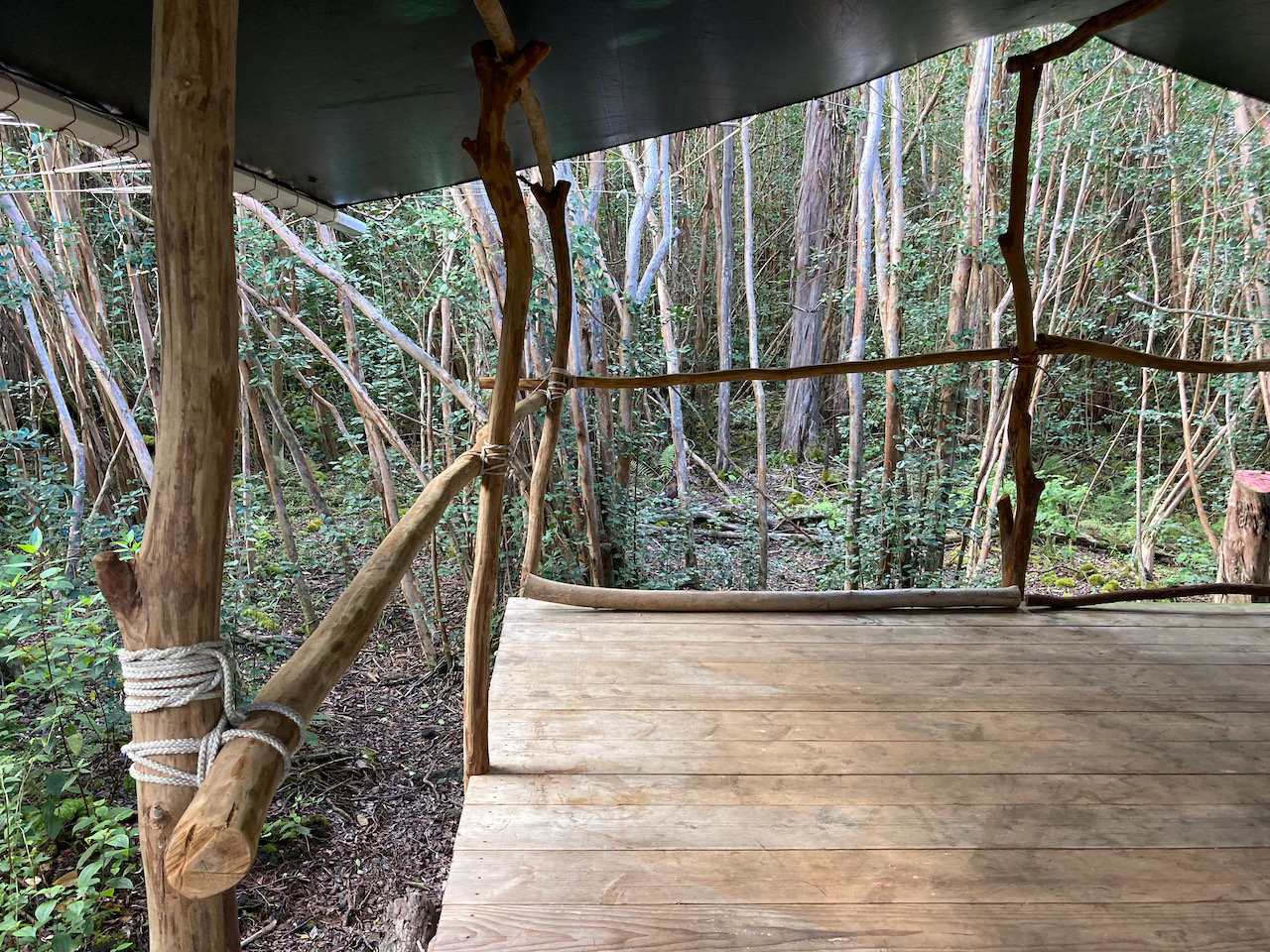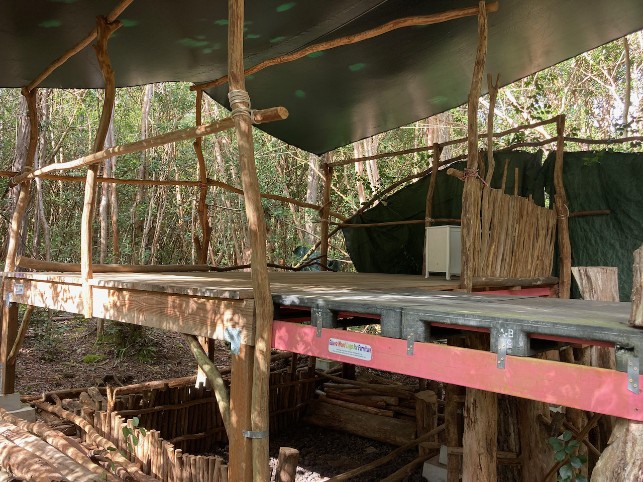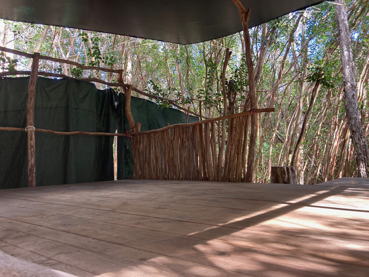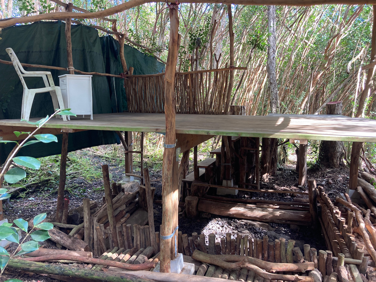 The seller built a platform on the property with dimensional lumber. This is lumber that is cut to pre-defined, standard sizes. Platform is approximately 5 feet from the ground and covered with a heavy duty Canvex tarp roof.