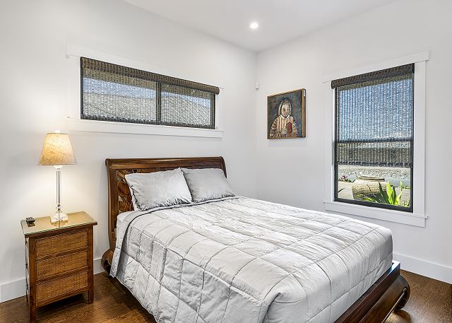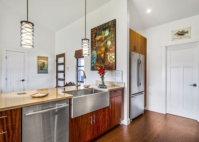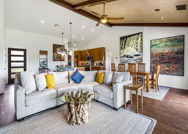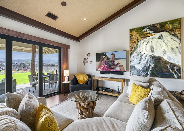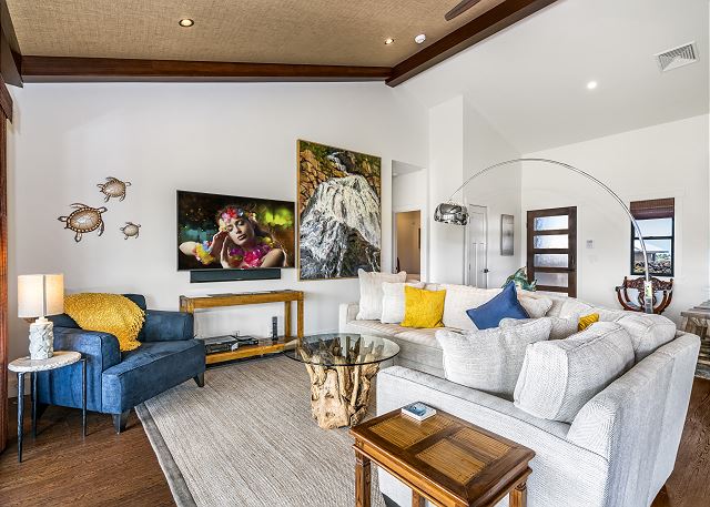 Our home has a large lanai for outdoor dining with a gas grill, vaulted ceilings, custom cabinets, quartz kitchen and bath counters. Kohler plumbing fixtures, Jenn-Air stainless steel appliances and a gas cook-top. A large master suite with an outdoor tropical shower and large deep tub. 2 guest bedrooms with a full guest bath to share. Guest bedroom has a desk for a working vacation. Large open kitchen, dining and living room for quality family time. Throughout our home is amazing artwork displayed for all to enjoy.