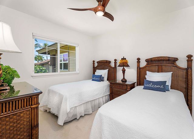 Upstairs is 2 guest bedrooms; the first guest bedroom has 2 twin beds, and the 2nd guest bedroom has a queen bed. And a full bathroom next to guest bedroom. The end of the hallway is the master suite with a large screen tv, large master closet and a full master bathroom. Master bedroom also has a lanai that overlooks the fairway views. For parking, you will have access to garage and also a reserved parking stall. Villa is also in walking distance to 1 of 2 pools and tennis courts located in the Waikoloa Colony Villas.