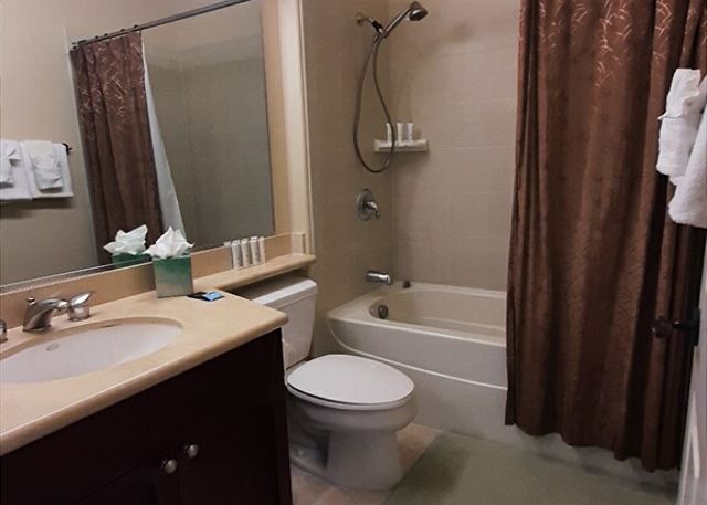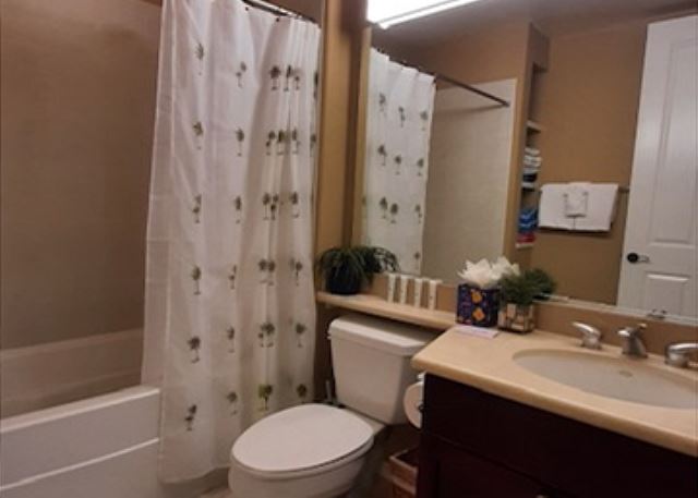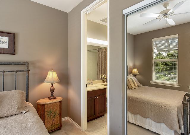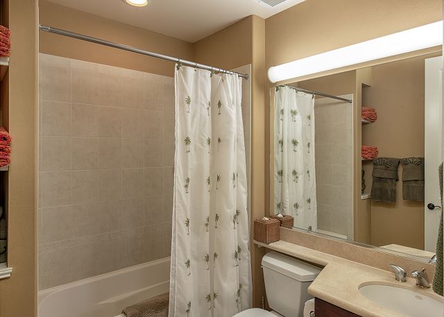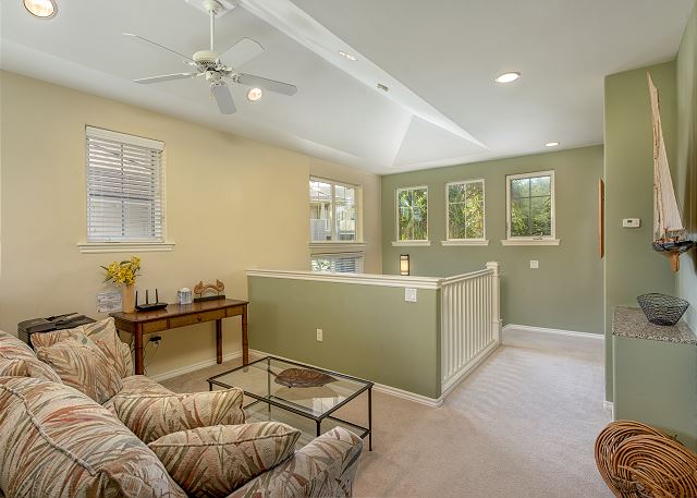 Master suite that features a king-size bed, built-in walk-in closet and a flat screen TV. The master bath is spacious and offers dual sinks, walk-in shower and a bathtub. Two additional bedrooms; one; downstairs has queen beds and a private bathroom in the hallway and offers a flat screen TV, the bedroom upstairs offers a queen-sized bed with attached bathroom with a flat screen TV and built-in closet. The loft area offers a queen size sleeper sofa, reading area and work desk/office chair to use on your vacation.