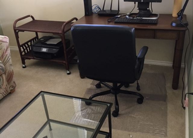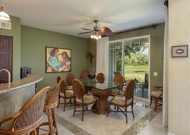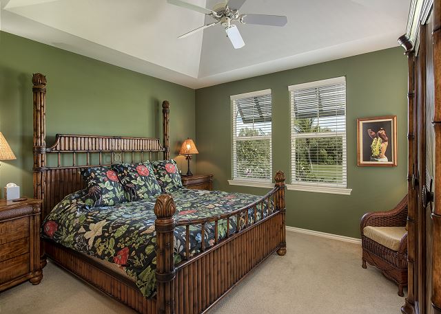 The main living area boasts an open floor plan, making the home perfect for entertaining or relaxing with family and friends. The living room has a flat screen TV to enjoy. The kitchen is spacious, with stainless steel appliances, granite countertops and bar. And kitchen is fully equipped with high quality items, there is a dining table with seats for eight and three additional seats at the breakfast bar. A large wrap-around lanai is accessed from the living room or the dining room, with patio table with seating for six and 2 lounge chairs with amazing view of golf course, Kohala volcano and sunset skies framed by coconut palms.