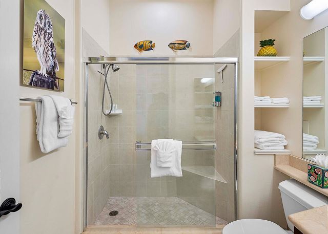 This top floor villa has enough room for a family of 6. Take the elevator or stairs to the 3rd floor and walk into our spacious villa. When you first enter the villa, you have a fully stocked kitchen, large pantry and a washer/dryer for your use. Next to kitchen is a guest bedroom with a queen size bed and a full guest bathroom next to it. You have an open dining room that seats 6 and living room with high ceilings. Living room has a large flat screen tv and walk out to a private lanai with seating for 4 that overlooks the golf greens. Off of the living room is the master suite with a large king size bed, walk in closet and a large master bathroom.