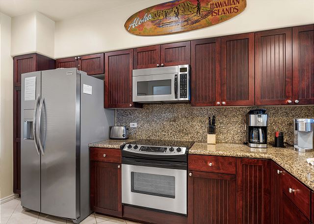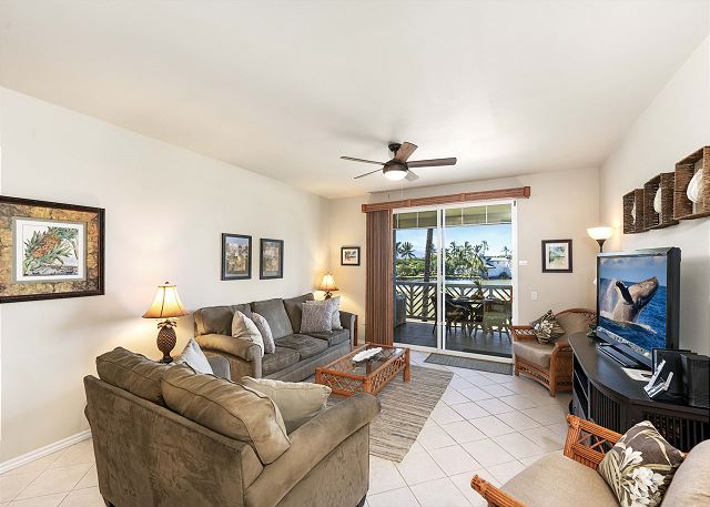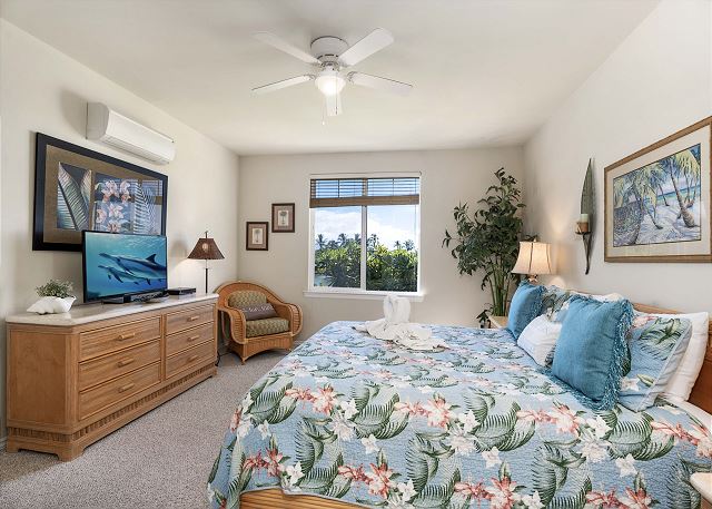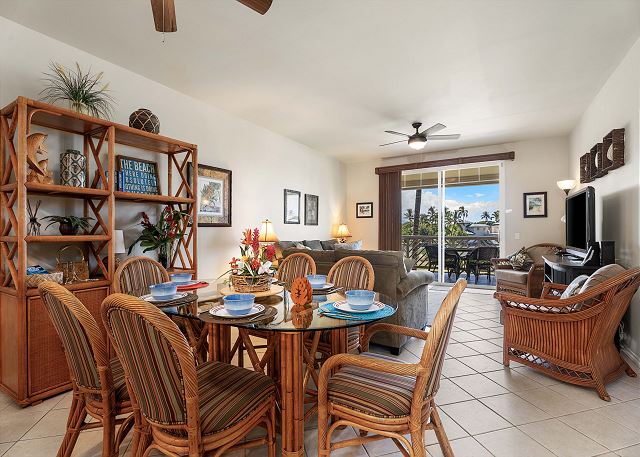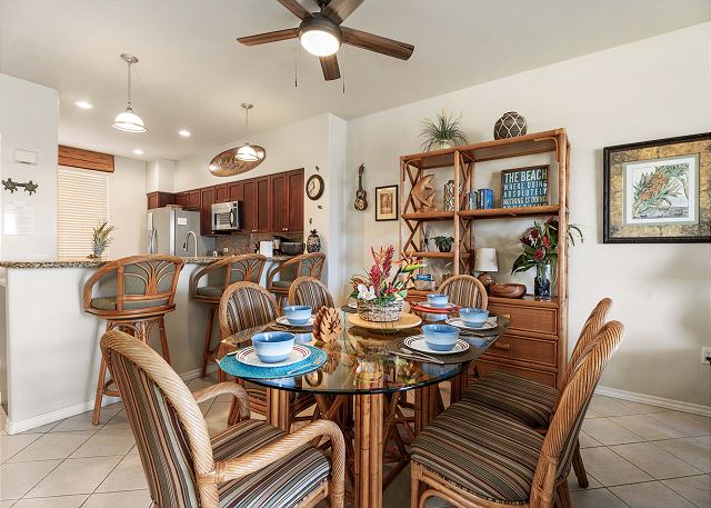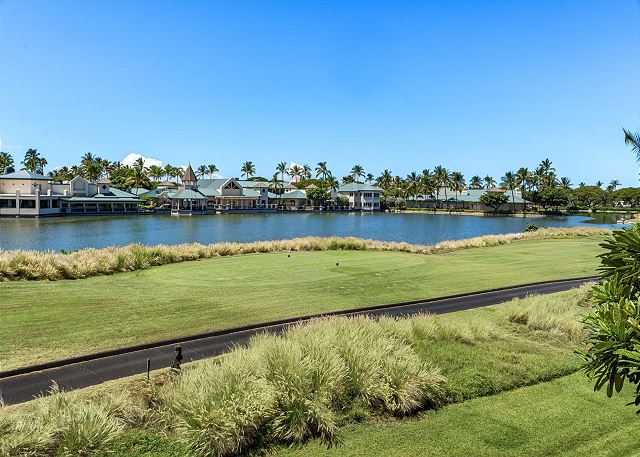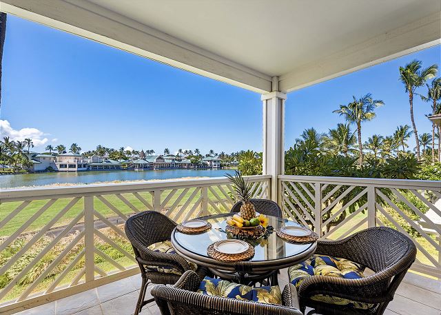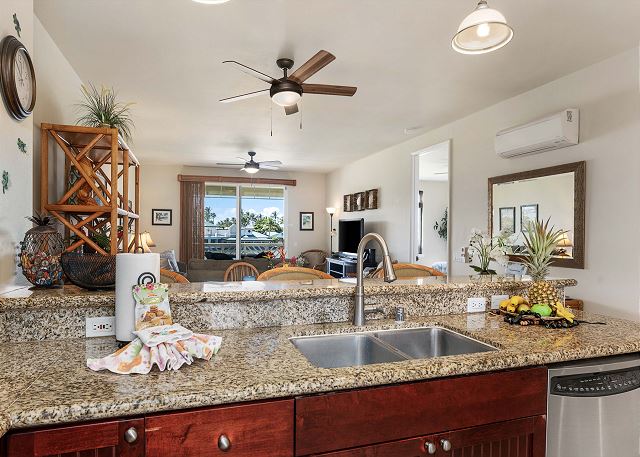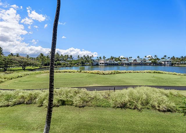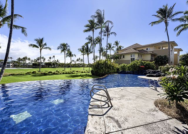 Kitchen features deluxe appliances, granite counters, and is fully equipped with all cookware, dishes, utensils, Cuisinart, Keurig coffee makers, and electric tea kettle; it really has everything you’ll need. The spacious lanai overlooking the Kings’ Lake and shops is the perfect place to start and end your day…coffee in the morning while you watch golfers from the 4th tee of the Beach Course. Or evening cocktails, take in a sunset, and gaze at the shimmering lights reflecting off the Kings Lake. Relax and enjoy the living area which features a 50” flat screen High Definition TV, Blu-Ray DVD, FREE Wi-Fi, iPod dock, ceiling fans, BRAND NEW A/C SYSTEM, washer/dryer. One of the best locations in the entire Waikoloa Beach Resort area and Fairway Villas complex. Convenient, yet quiet and tranquil. Stroll to the infinity edge pool and hot tub. Or the open-air fitness center which provides aerobic & weight equipment. Also, pool-side gas barbeque/grilling area with plenty of BBQs. FREE PARKING.