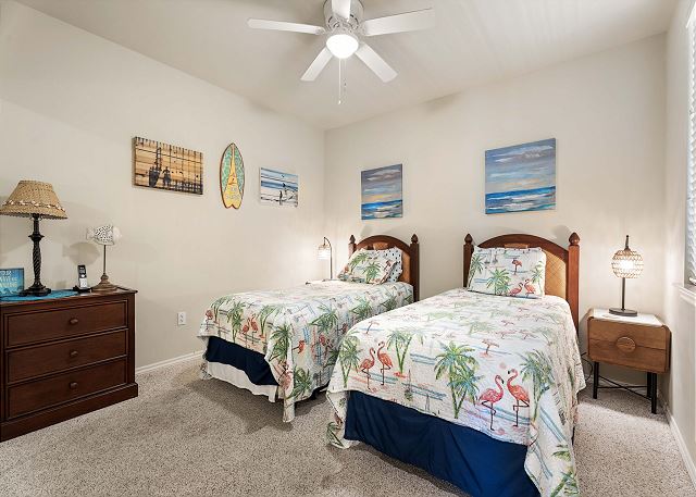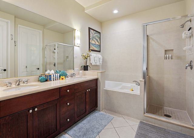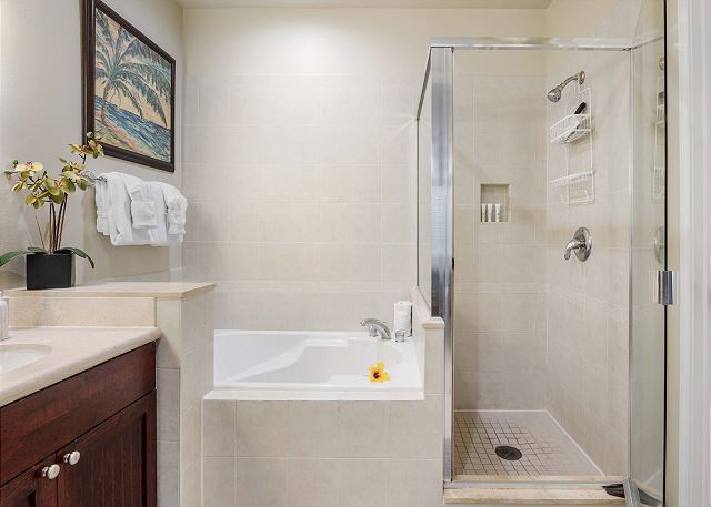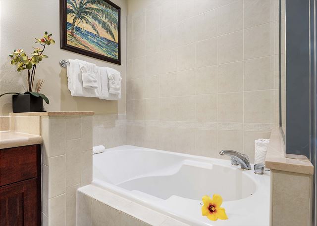 Designer furnishings, tropical artwork, luxurious linens and toiletries! Outstanding accommodations await you. Conveniently located parking to condo and elevator. Well-appointed, spacious master bedroom features a comfy Cal-king size bed, with en-suite. Deep soaker bath tub with marble counters and floor, dual vanities, glass enclosed shower, compartmentalized commode and large walk-in closet. Second bedroom features two extra-long twin beds, (with option to convert into a comfortable Cal-king bed) and the second bath is conveniently located adjacent.
