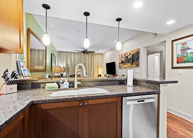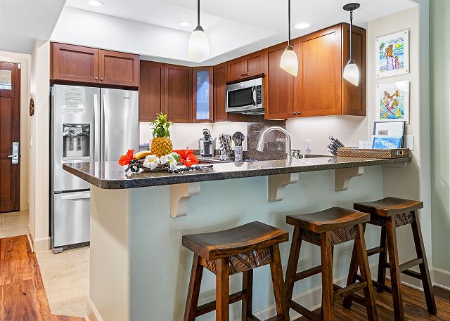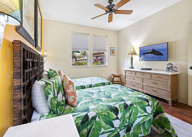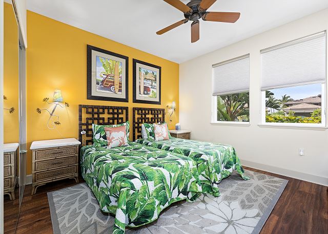 Halii Kai 2B condo features a spacious private master bedroom with an en-suite bathroom, a guest bedroom with two twin beds and an adjacent full bathroom (with the option to convert the twin beds into a king bed). The modern designer kitchen opens into a large living and dining area, which flows seamlessly to your private lanai with a BBQ grill and a comfortable dining space. Recently remodeled, the condo boasts new hardwood floors, high-end furnishings, and luxury fixtures. The living room includes a memory foam sleeper sofa for added comfort. The condo also provides free Wi-Fi and two private parking spaces, and it is a non-smoking property.