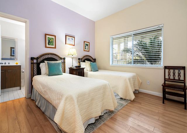 Condo has 2 bedrooms, 2 and a half bathrooms and can accommodate 4 guests. The master suite has a king size bed, large screen tv and newly renovated full on-suite master bath. Also access to lanai were 2 new loungers for relaxing with a book or a glass of wine. The guest bedroom has 2 twin beds and a newly renovated on-suite full bath. Large living room with amazing views of the mountains and golf course. A newly renovated half bath located off of living room. Fully stocked kitchen with everything you need for your stay. A new fridge just installed. Dining has seating for 6 and 2 bar stools at the counter. You also have a reserved parking stall. Lots of beach gear for you to use. FREE high speed WIFI and FREE parking.