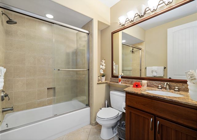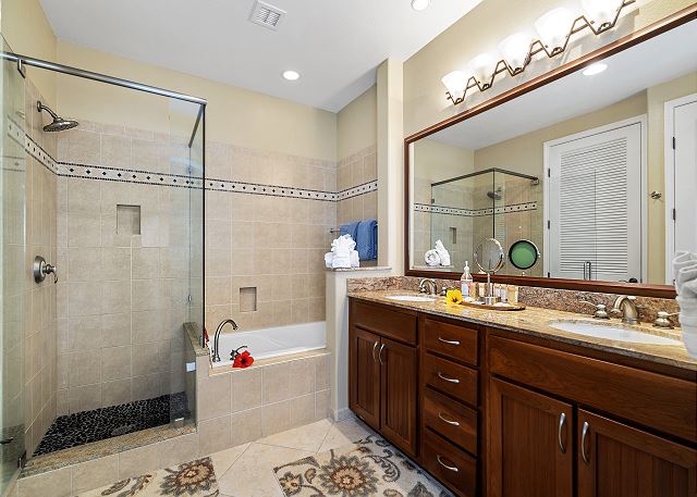 Master bedroom has a king size bed with a full master bath on suite. Guest bedroom has 2 twins bed that are converted to a king (and will make as twins upon request.) Full guest bathroom located right next to guest bedroom.